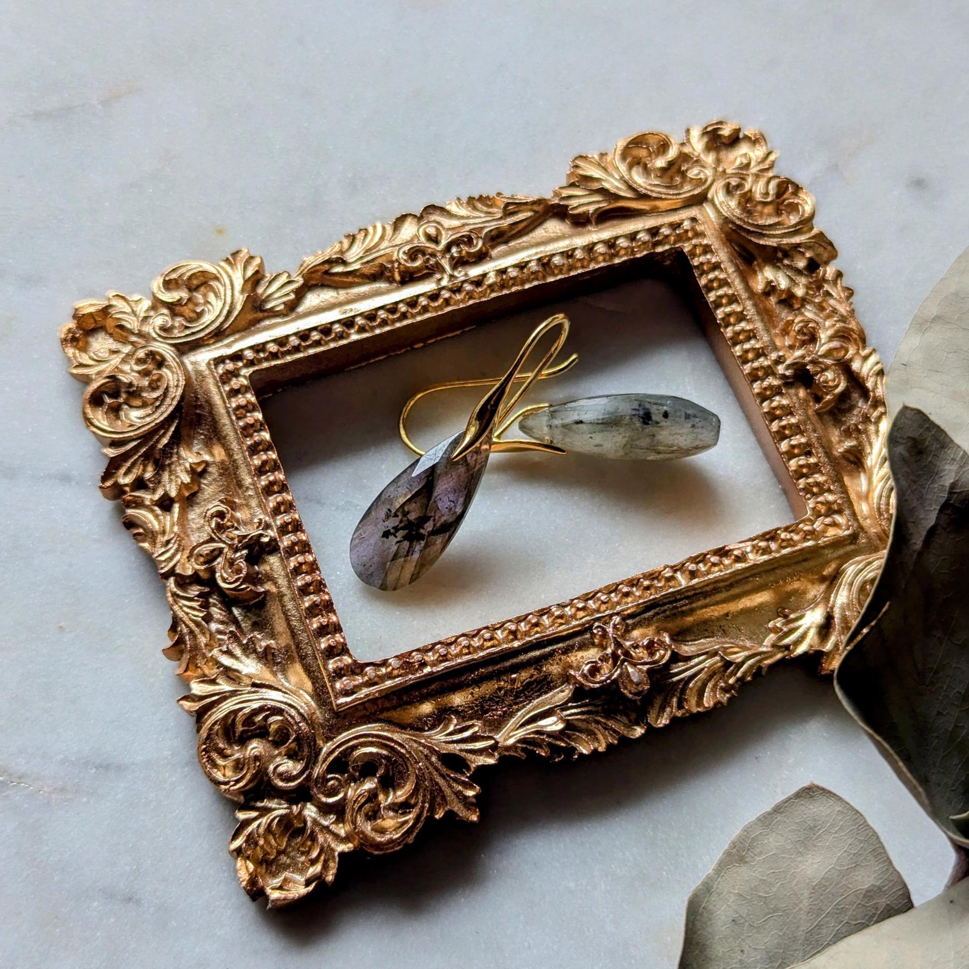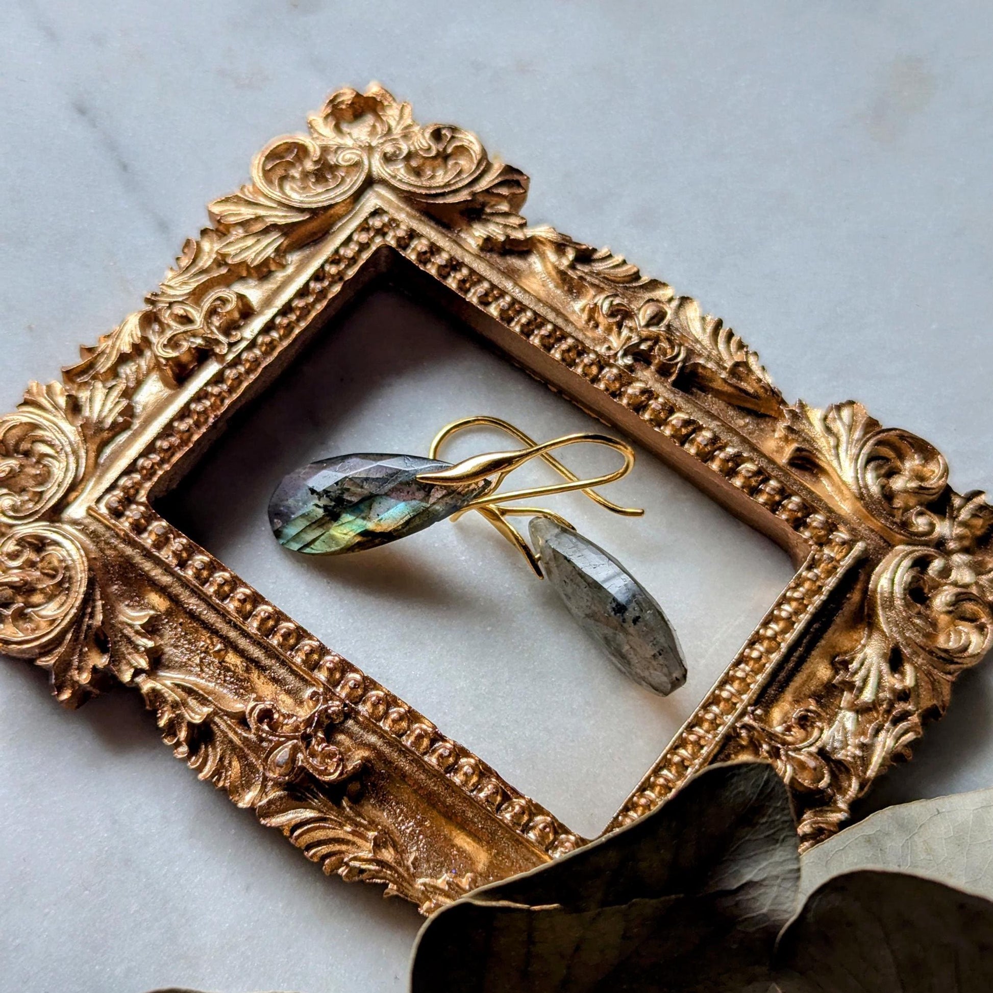 Briolettes de labradorite scintillantes avec des dégradés de couleurs uniques sur des crochets en argent et en argent plaqué or de haute qualité. Chaque pierre est unique, chaque paire est irremplaçable. Le caractère unique des labradorites se reflète dans leur apparence différente à chaque regard. Chaque mouvement, chaque rayon de lumière fait prendre à ces pierres une nouvelle couleur excitante allant du gris au vert émeraude et au bleu profond, révélant des détails qui étaient auparavant cachés !
