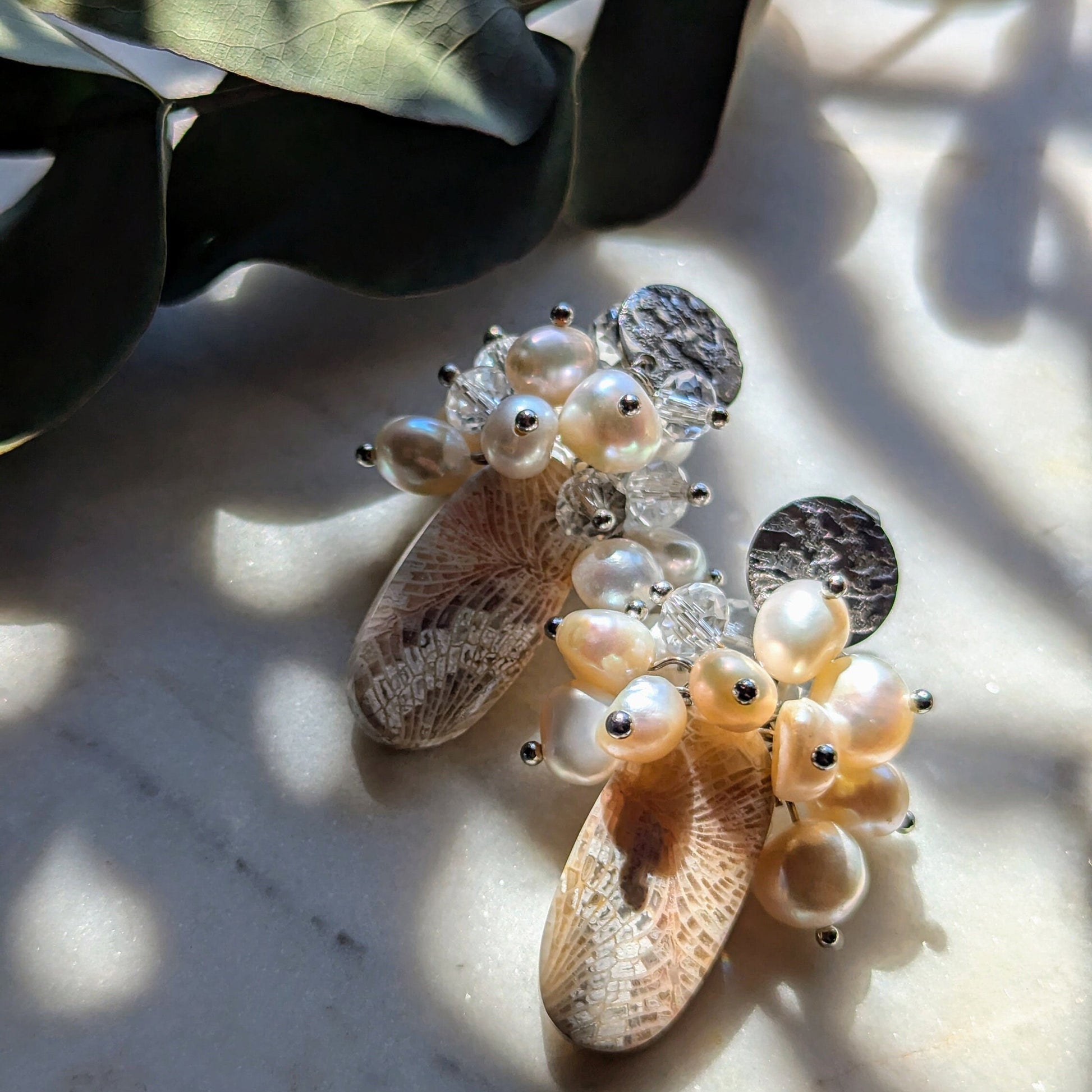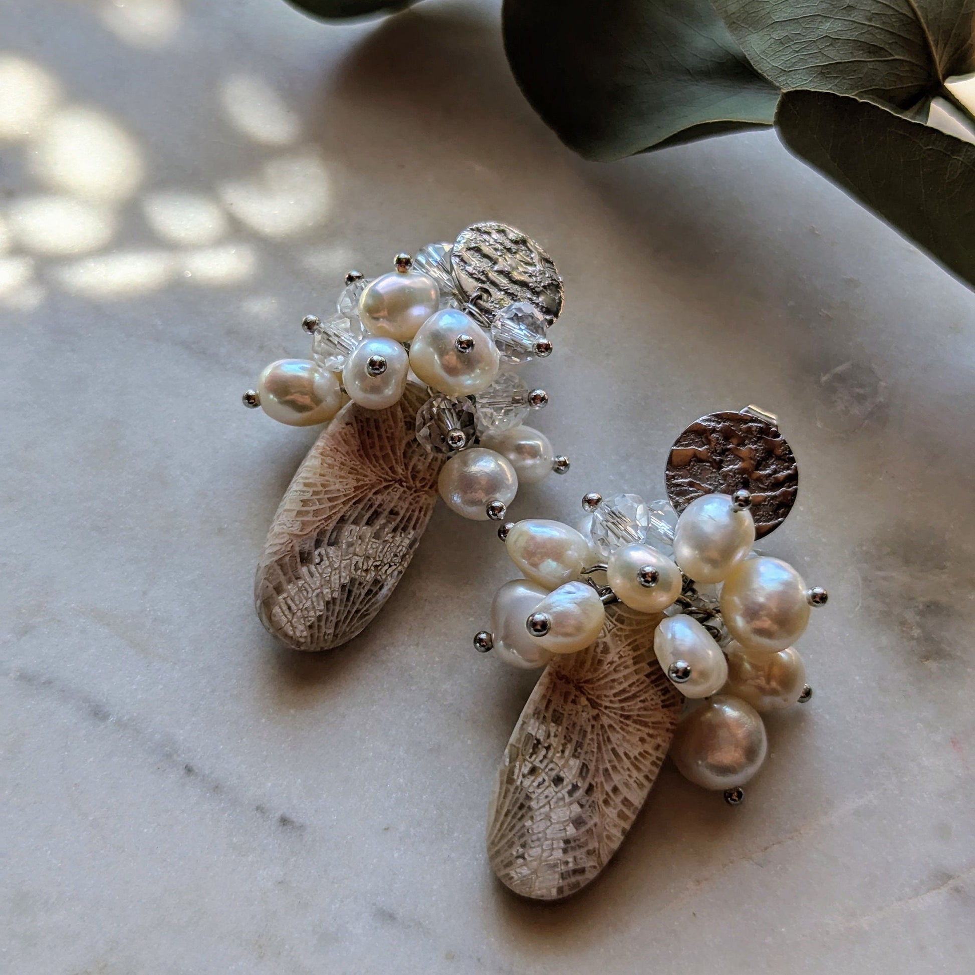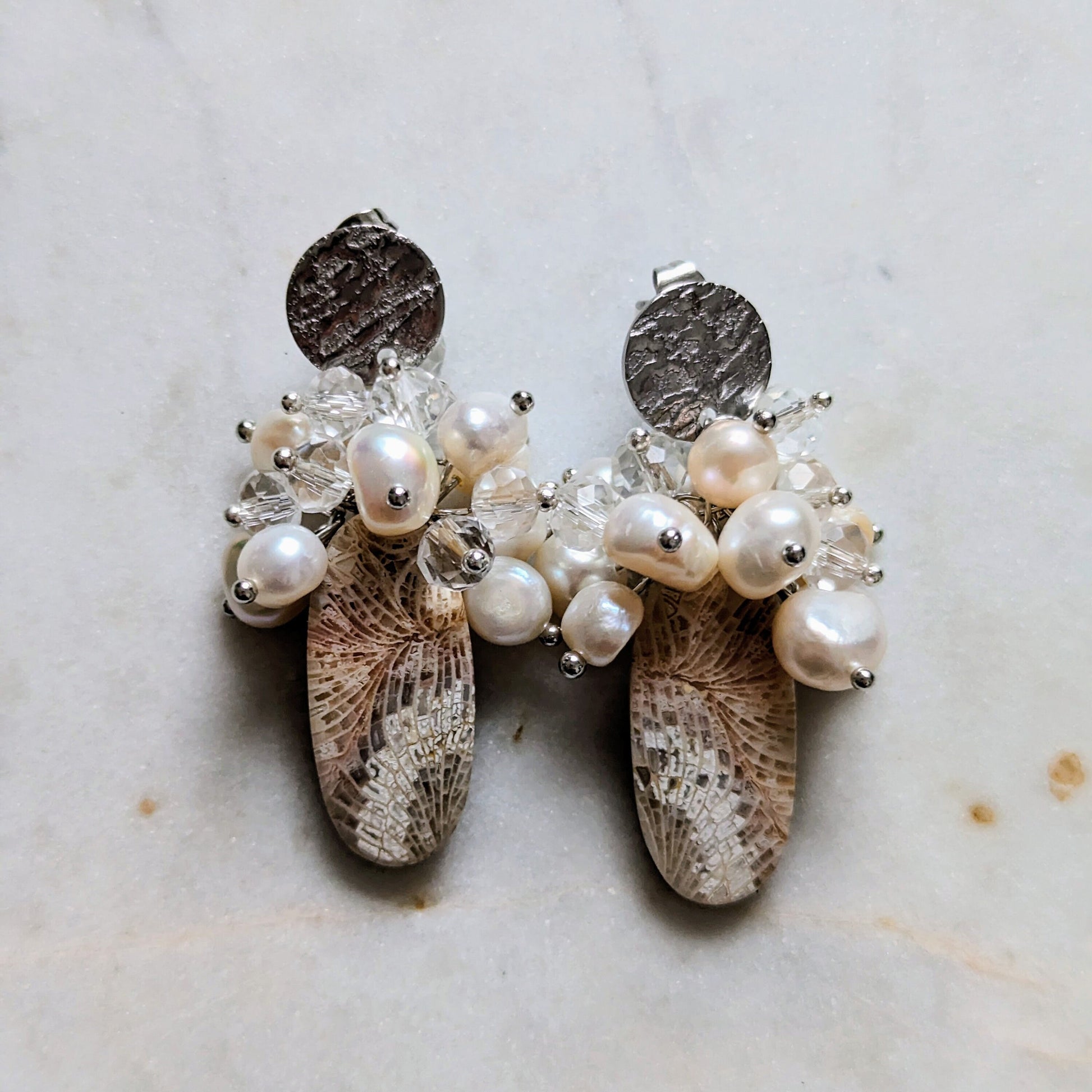 Ohrstecker "Ancient Bloom" – Fossile Koralle & Perlen (Einzelstück)
