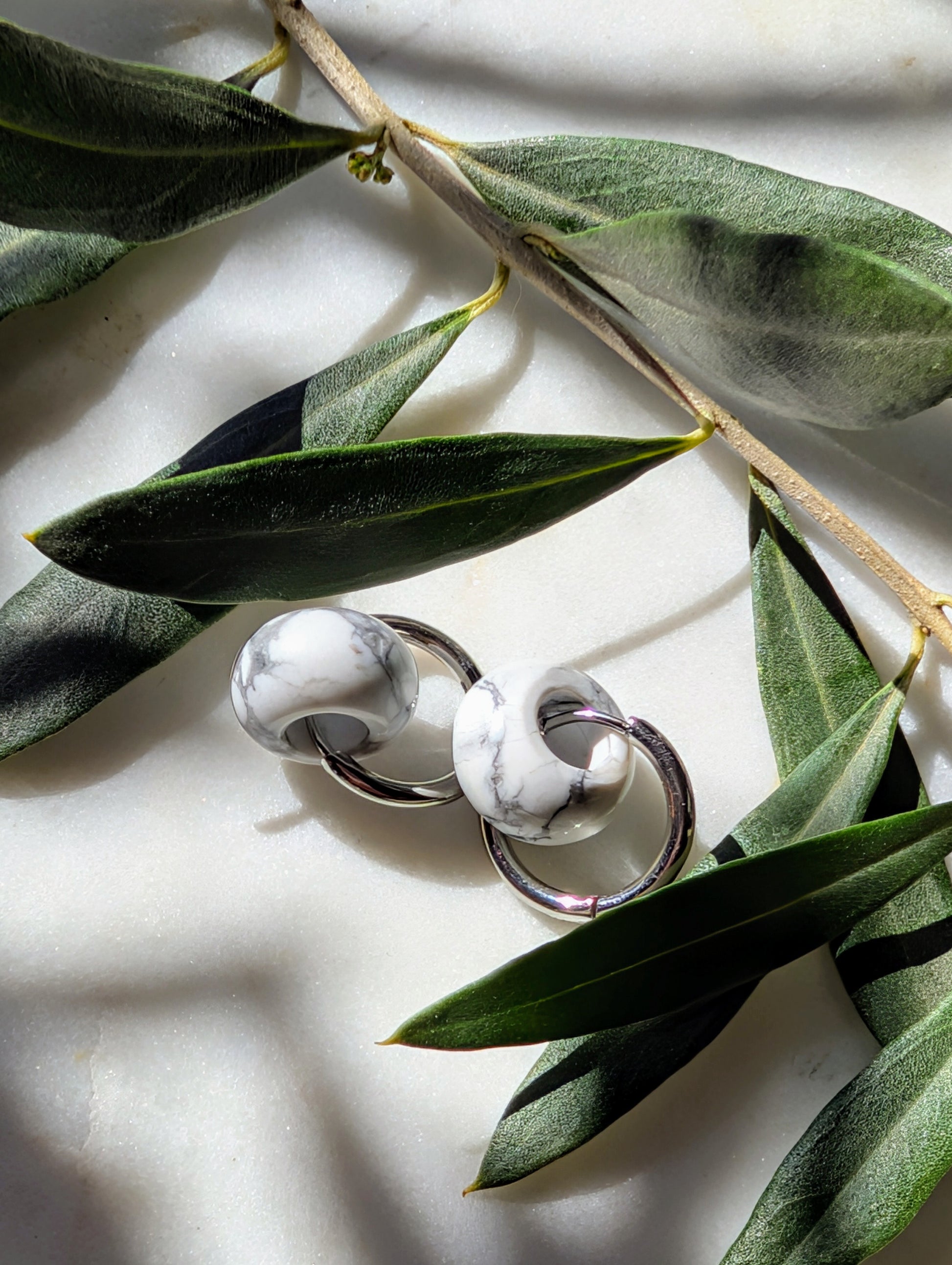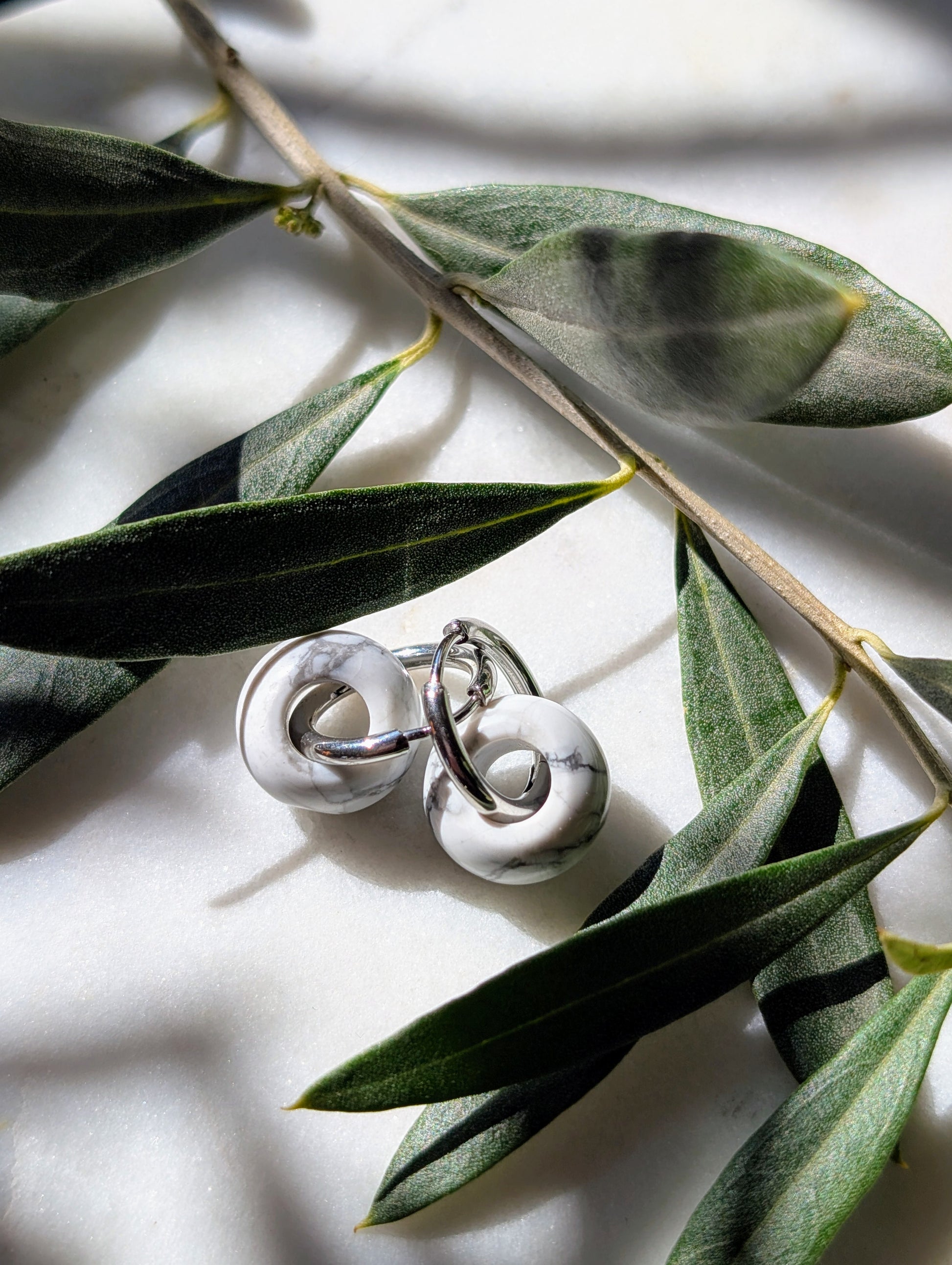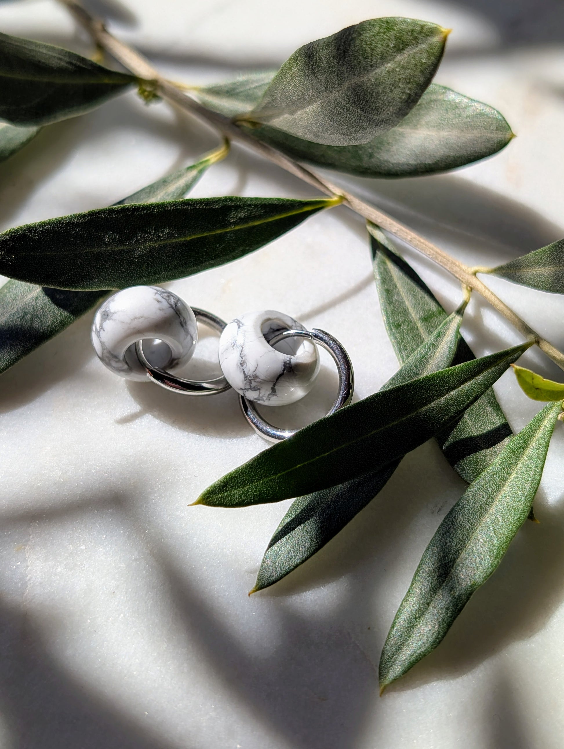 Diese schlichten und doch ausdrucksstarken Creolen aus wasserfestem, robustem Edelstahl umspielen dein Ohr mit einem zarten Loop aus echtem Howlith. Dieser faszinierende Edelstein begeistert mit seiner porzellanartigen, weißen Oberfläche und den charakteristischen grauen bis schwarzen Adern, die an die elegante Maserung von Marmor erinnern. Er verleiht diesen Ohrringen eine zeitlose und edle Ausstrahlung. Sie sind der perfekte Begleiter für jeden Tag, der dich an innere Ruhe erinnert und deinem Look eine besondere, natürliche Eleganz verleiht.