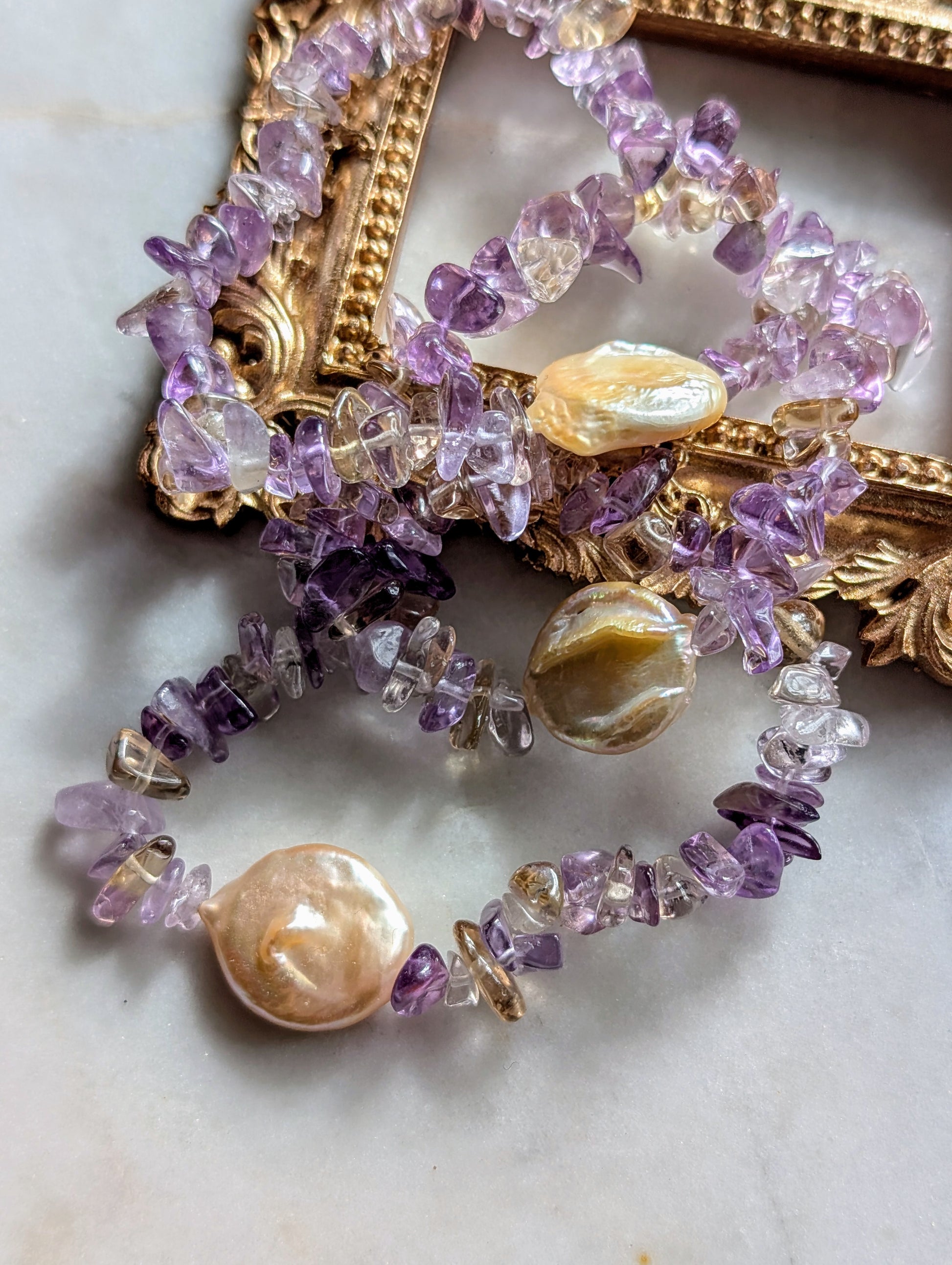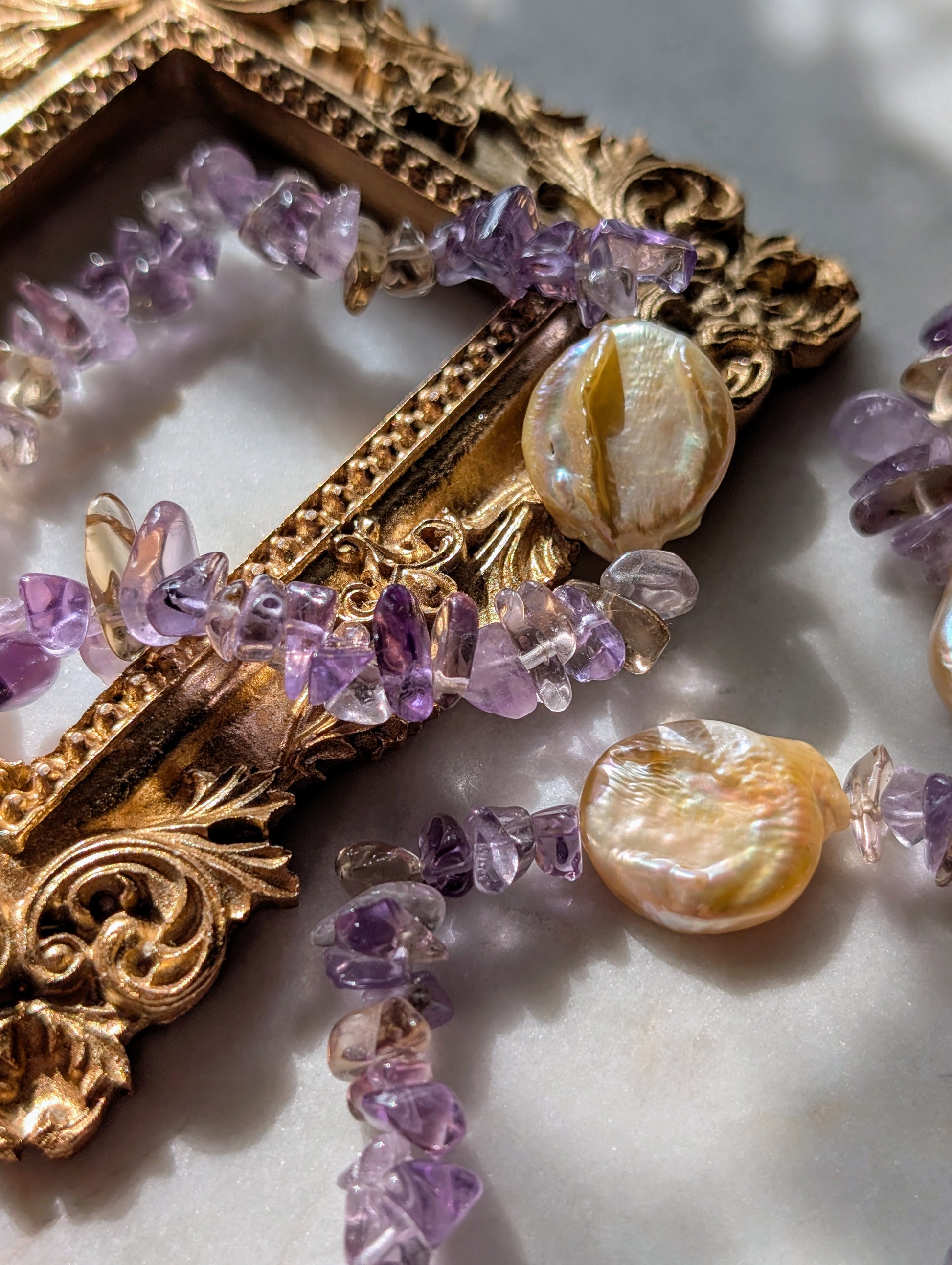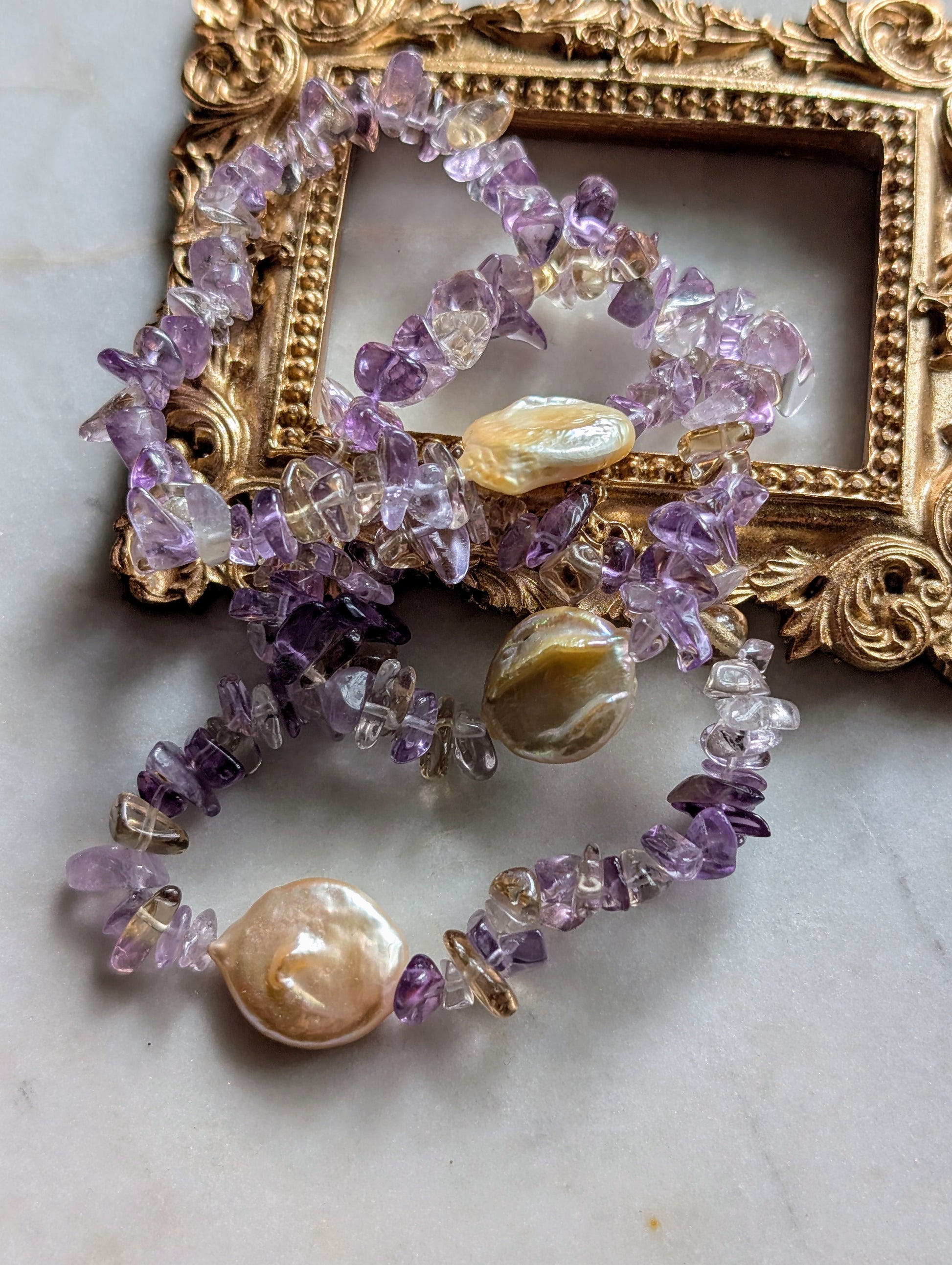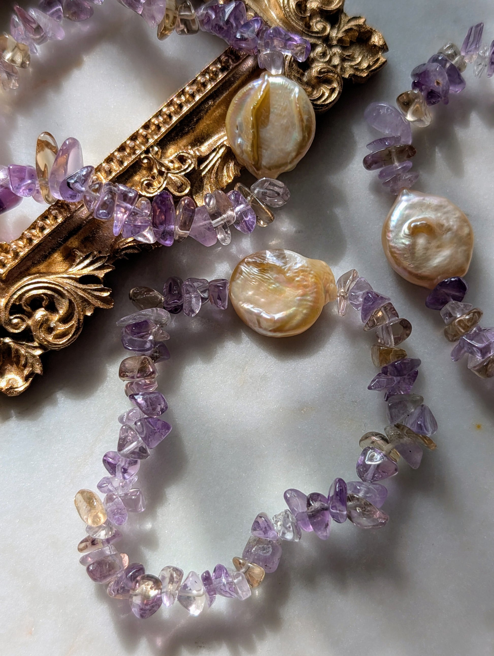 Das Edelsteinarmband "Aurora" ist eine Hommage an die römische Göttin der Morgenröte. Es fängt die sanften Farbschattierungen eines Sonnenaufgangs ein und vereint die besondere Schönheit von Amethrin mit der zeitlosen Eleganz einer großen, cremefarbenen Barock Süßwasserperle.