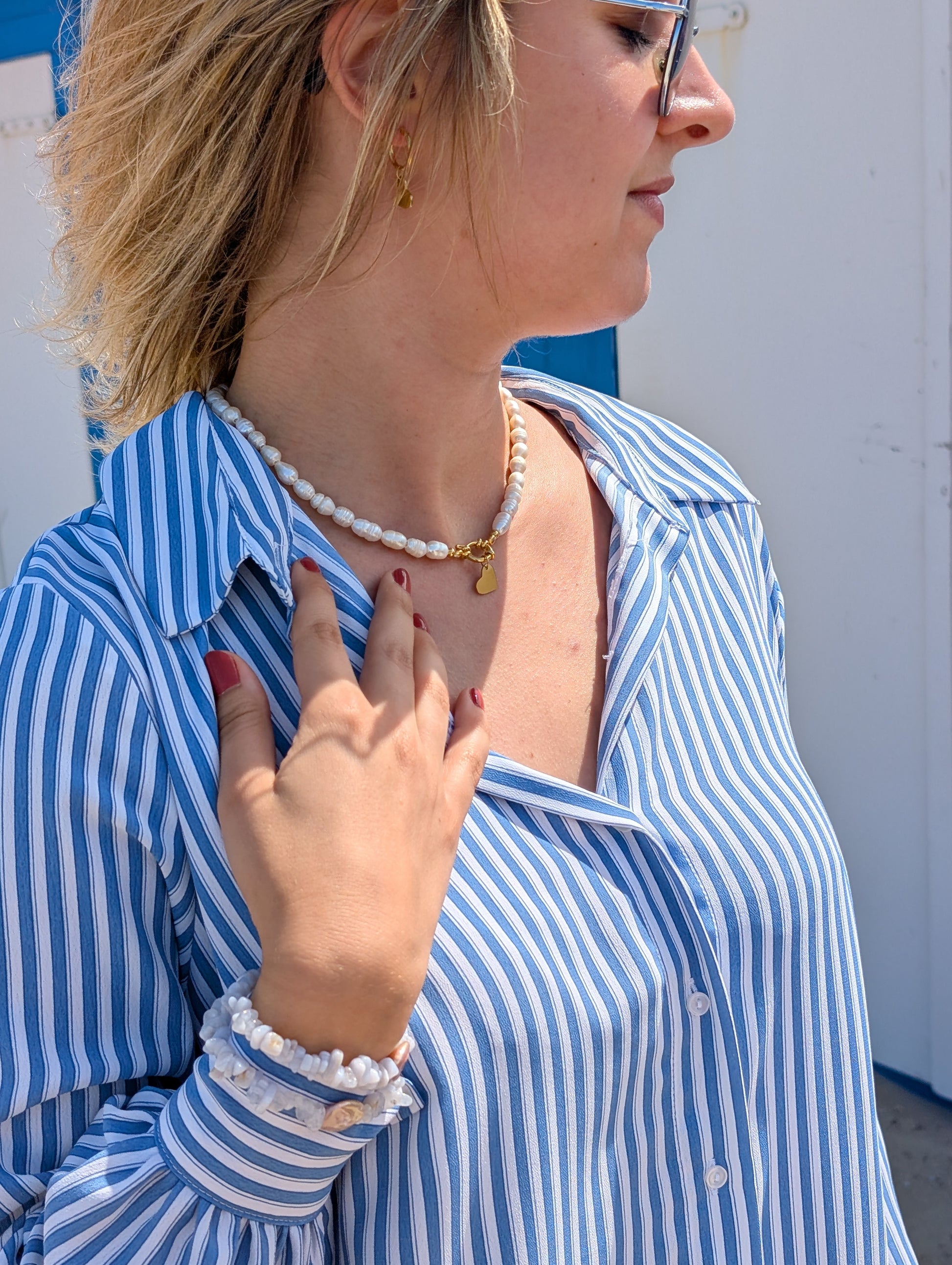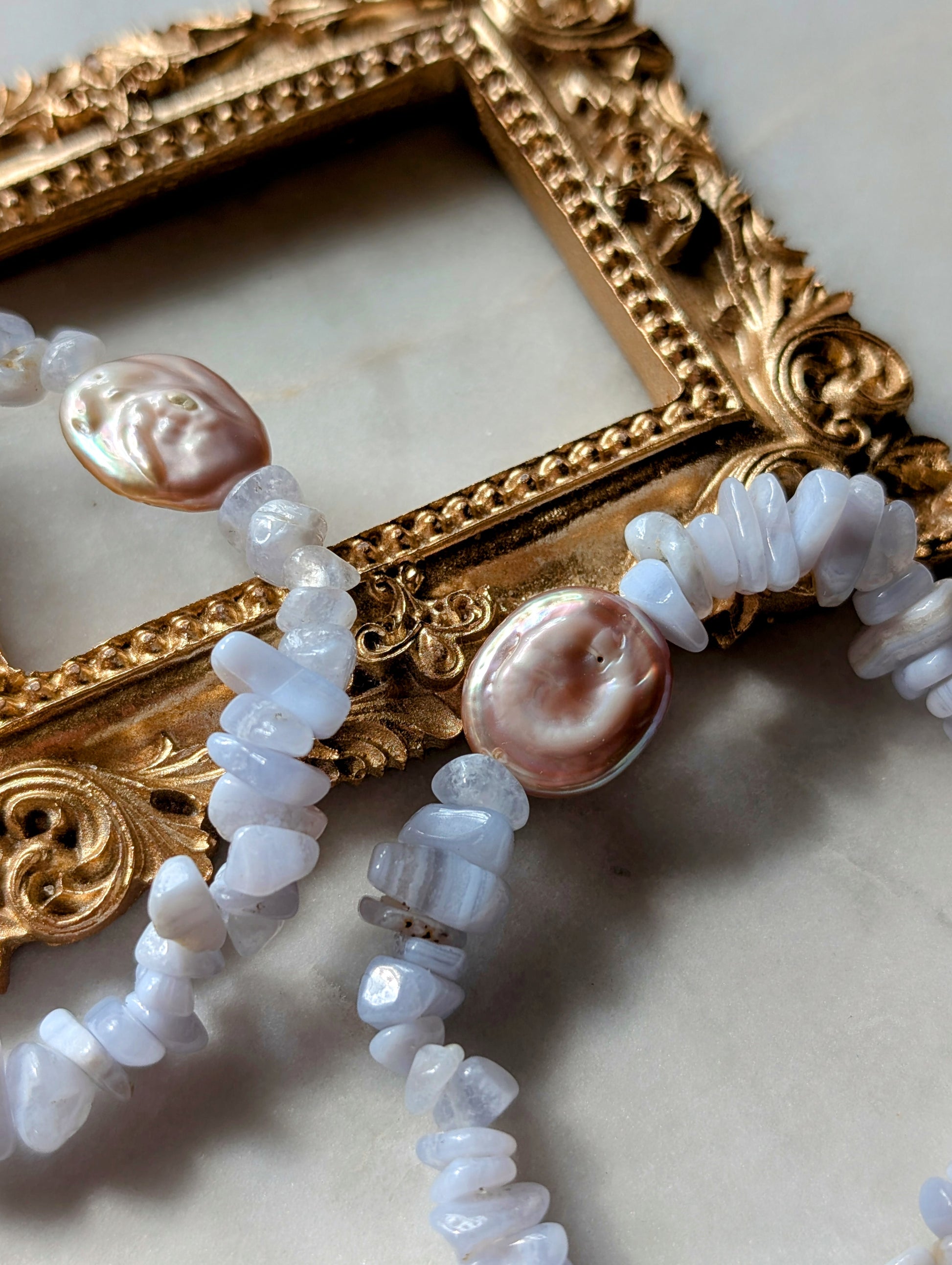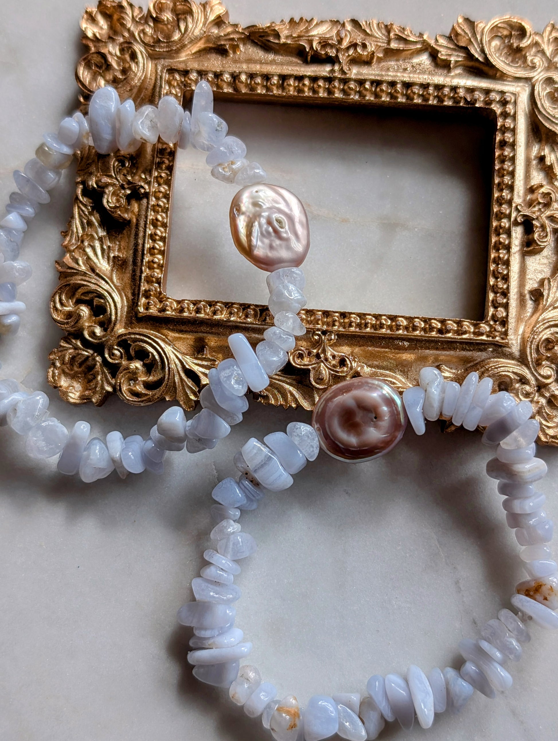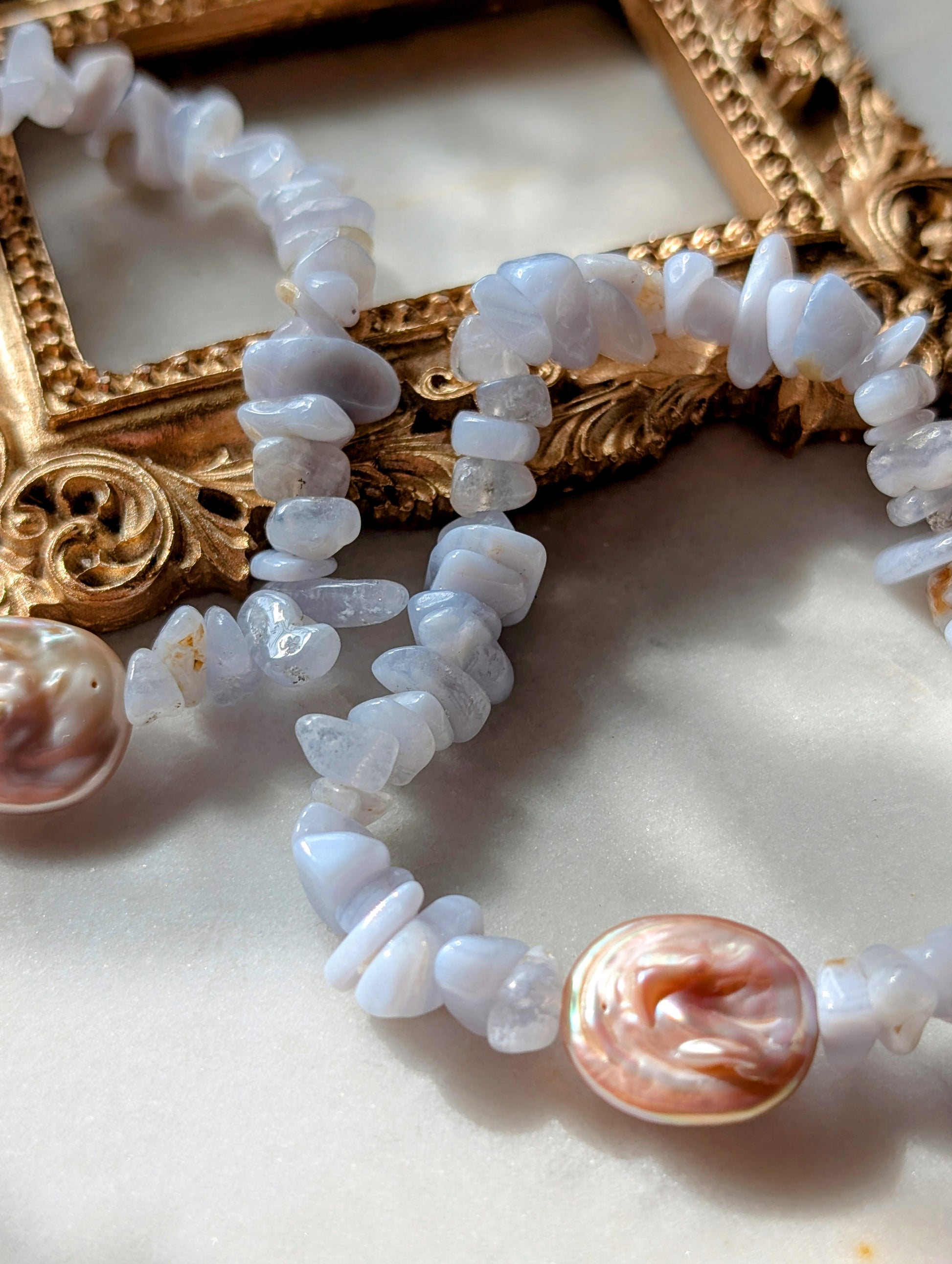 Das Edelsteinarmband "Wolkenflüstern" ist eine Hommage an die sanften Farben des Himmels. Zarte hellblaue Achatsplitter umspielen eine wunderschöne, puderfarbene Barock Süßwasserperle, die mit ihrer organischen Form an ein kleines, schwebendes Wolkenstück erinnert. Der Achat, bekannt für seine beruhigende Energie, vereint sich hier mit dem einzigartigen Glanz der ca. 16x14x4,5 mm großen Perle zu einem harmonischen Gesamtbild. Das Armband hat eine Länge von ca. 19 cm.