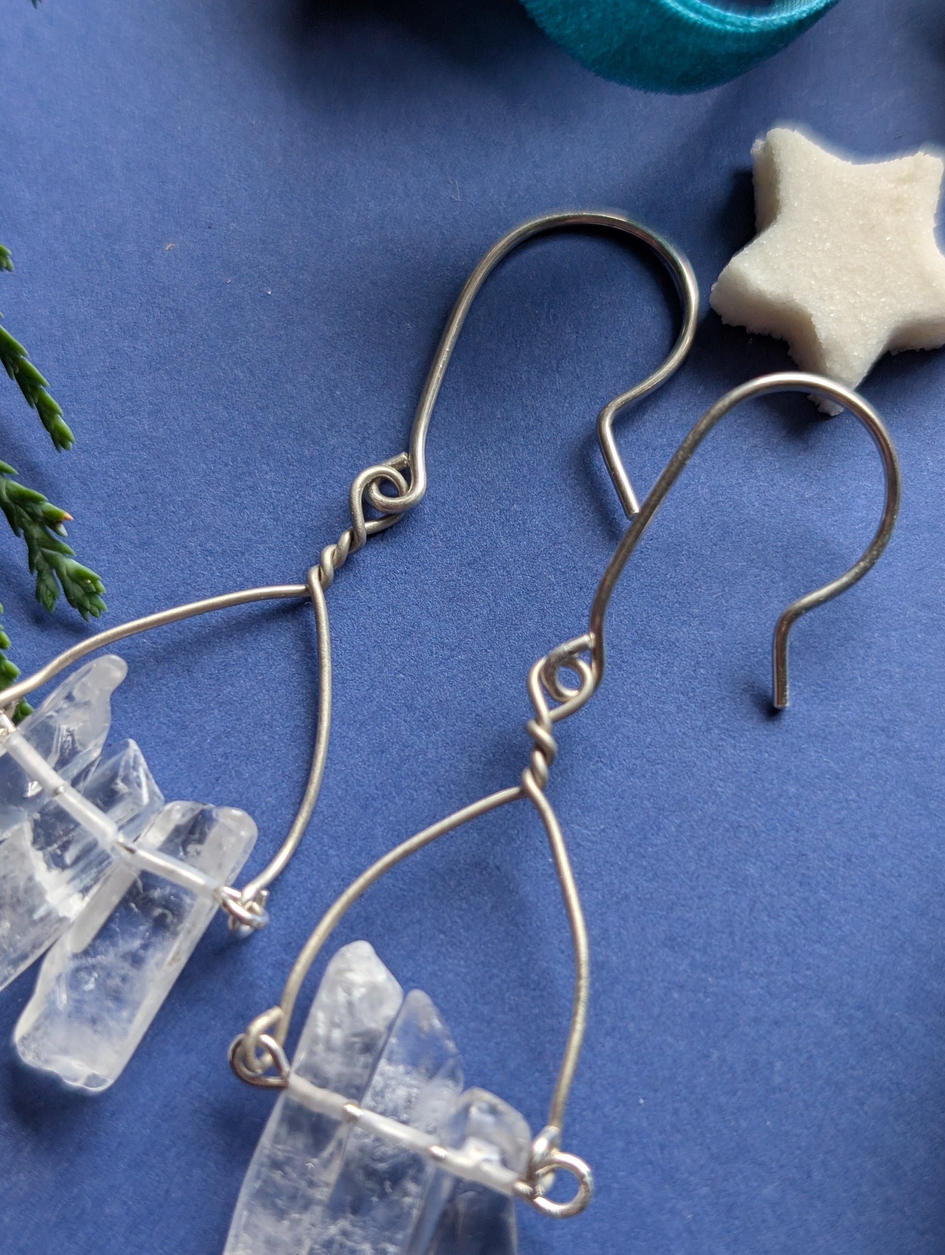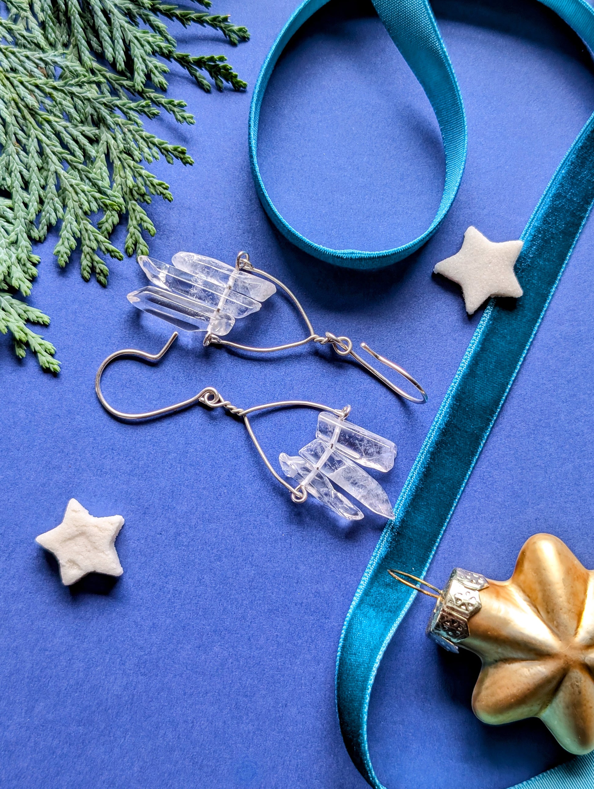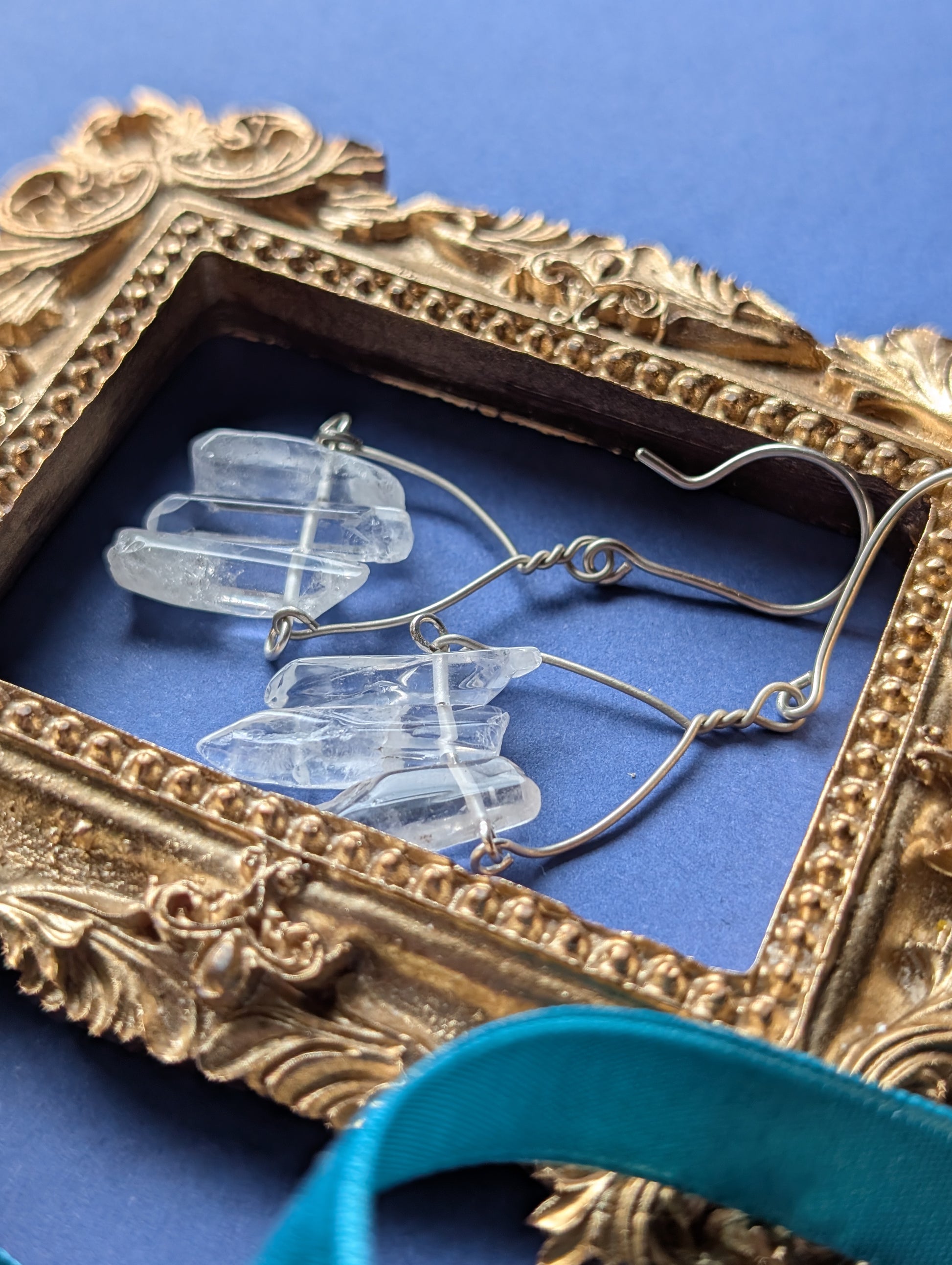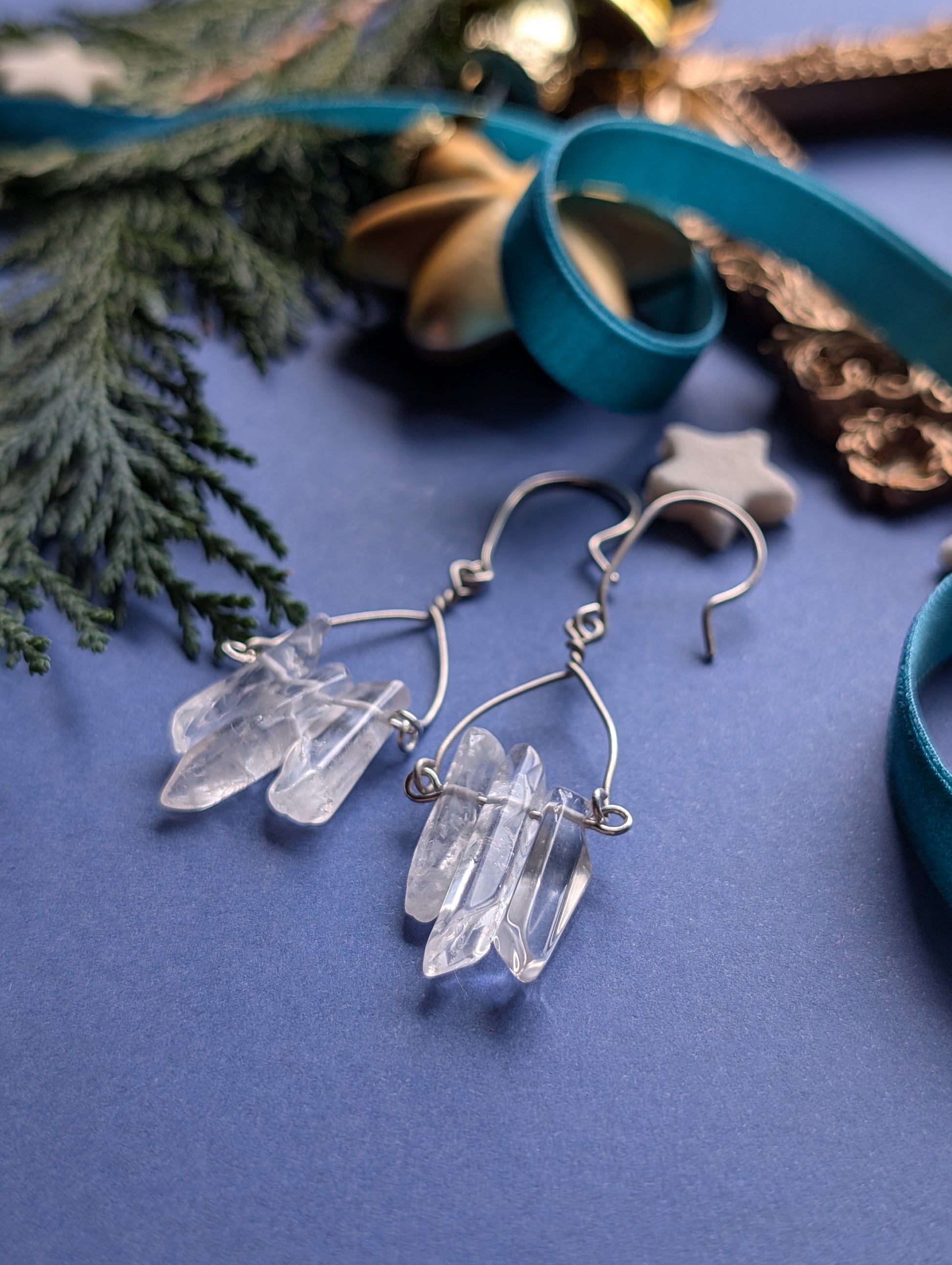 An feinen Drähten reihen sich je drei zarte Quarzsplitter, jeder einzigartig in Form und Länge, auf, die wie winzige, gefrorene Eiszapfen das Licht einfangen. Diese besonderen, komplett handgefertigten, Ohrhänger sind wahlweise aus hochwertigem Silber- oder Gold filled Draht erhältlich.