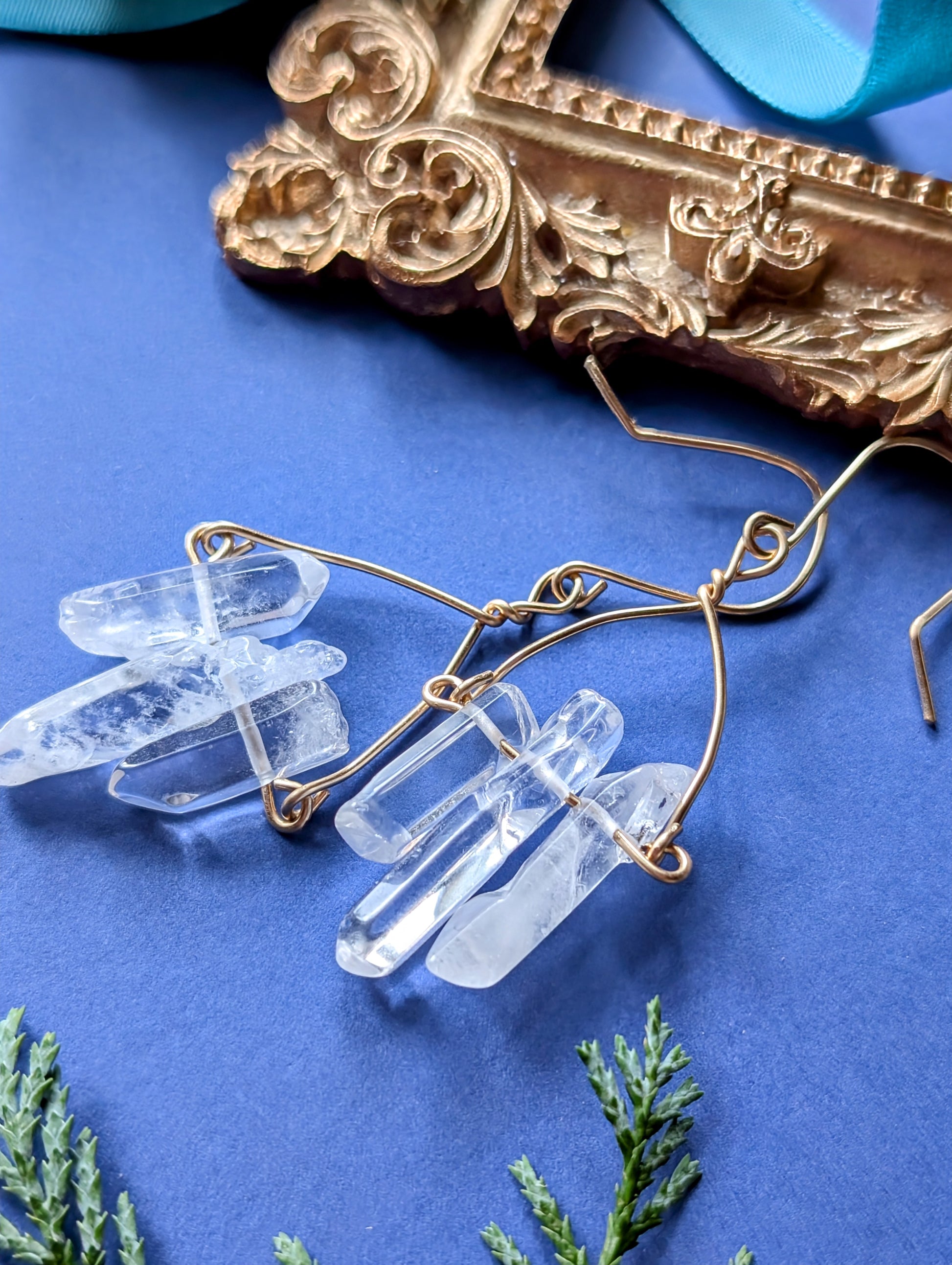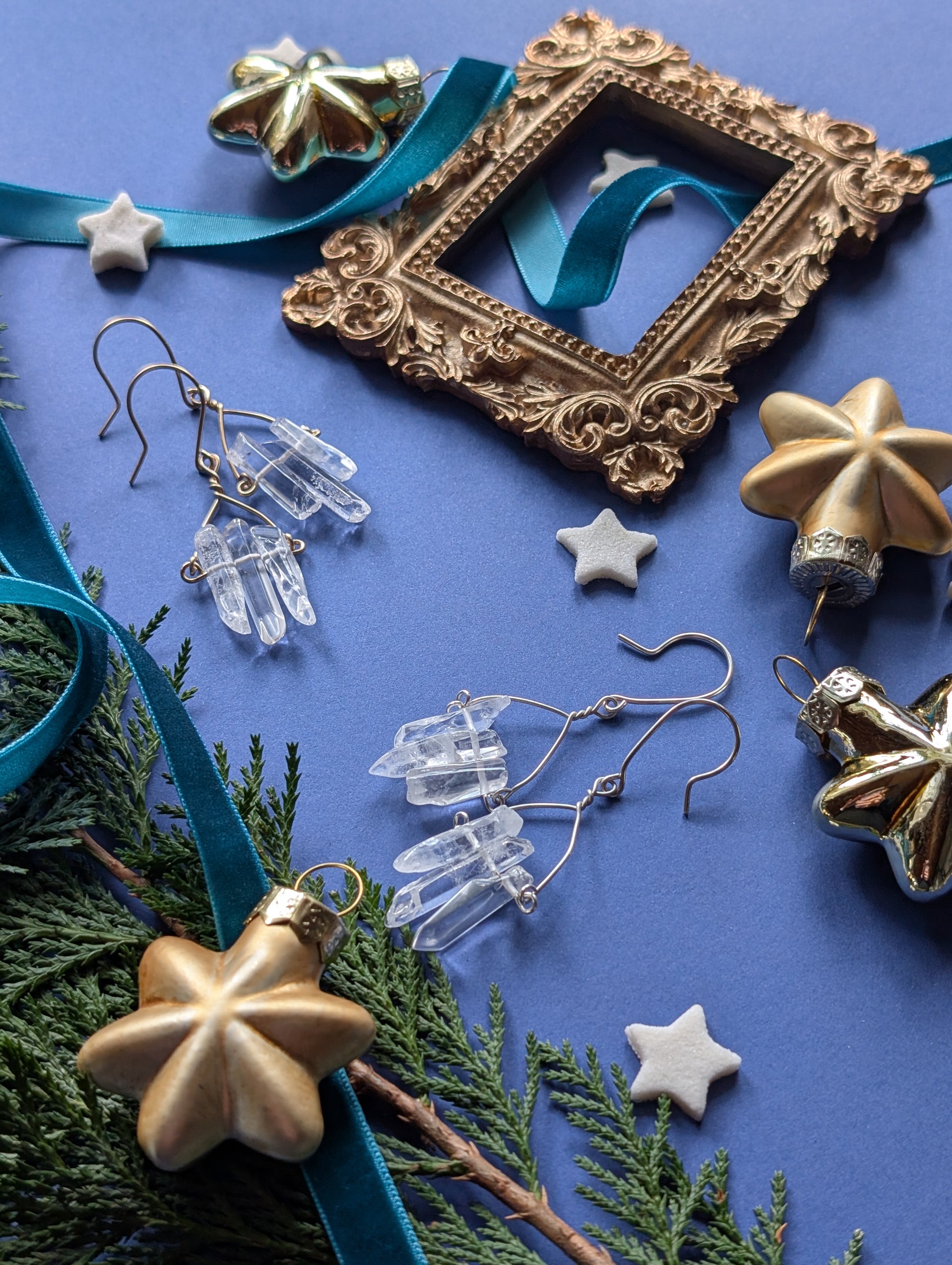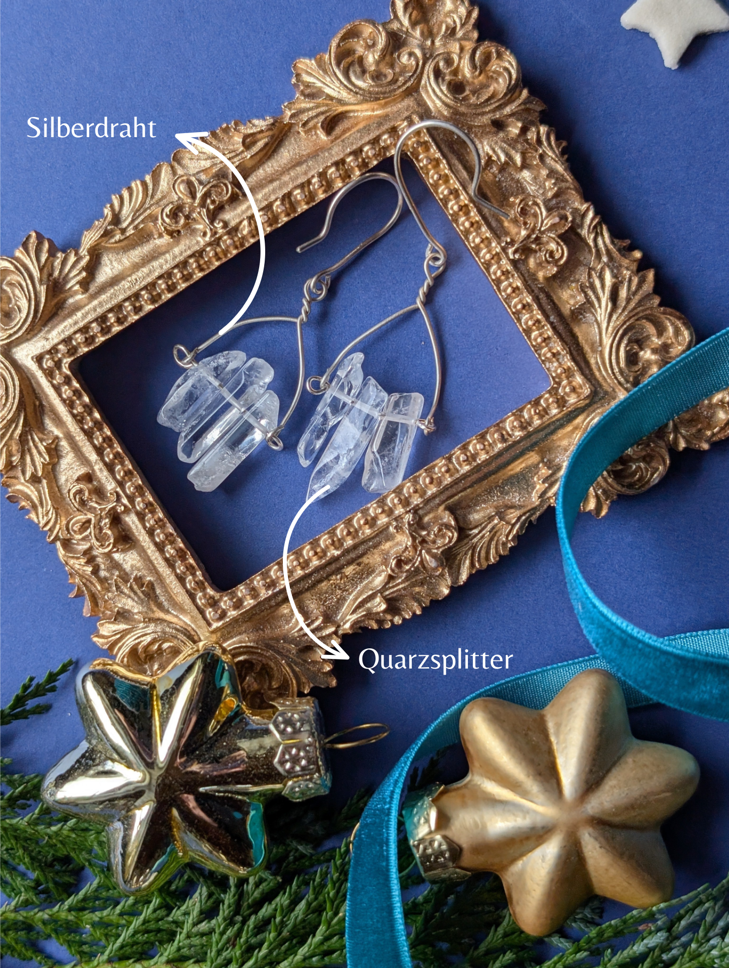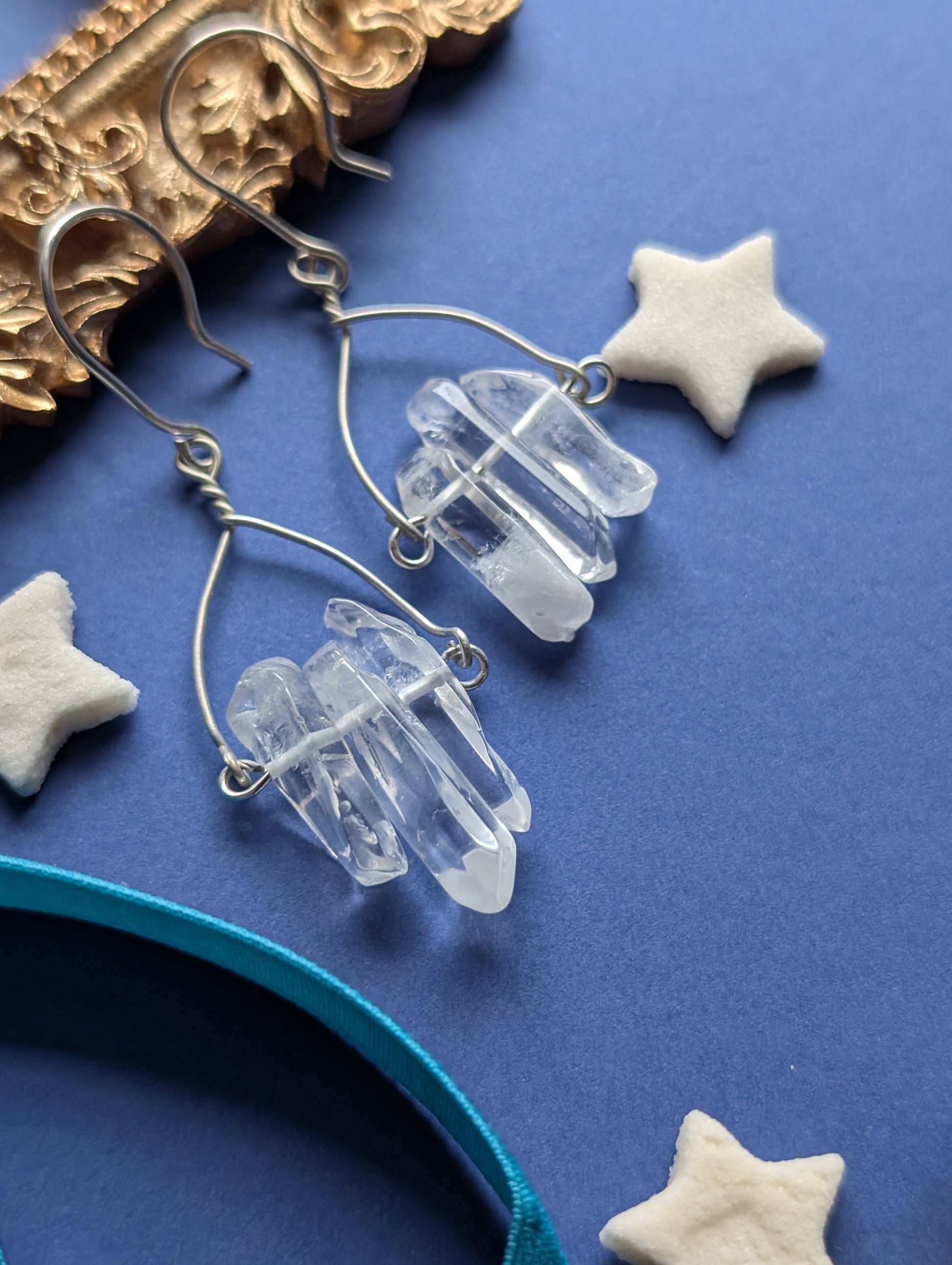 An feinen Drähten reihen sich je drei zarte Quarzsplitter, jeder einzigartig in Form und Länge, auf, die wie winzige, gefrorene Eiszapfen das Licht einfangen. Diese besonderen, komplett handgefertigten, Ohrhänger sind wahlweise aus hochwertigem Silber- oder Gold filled Draht erhältlich.