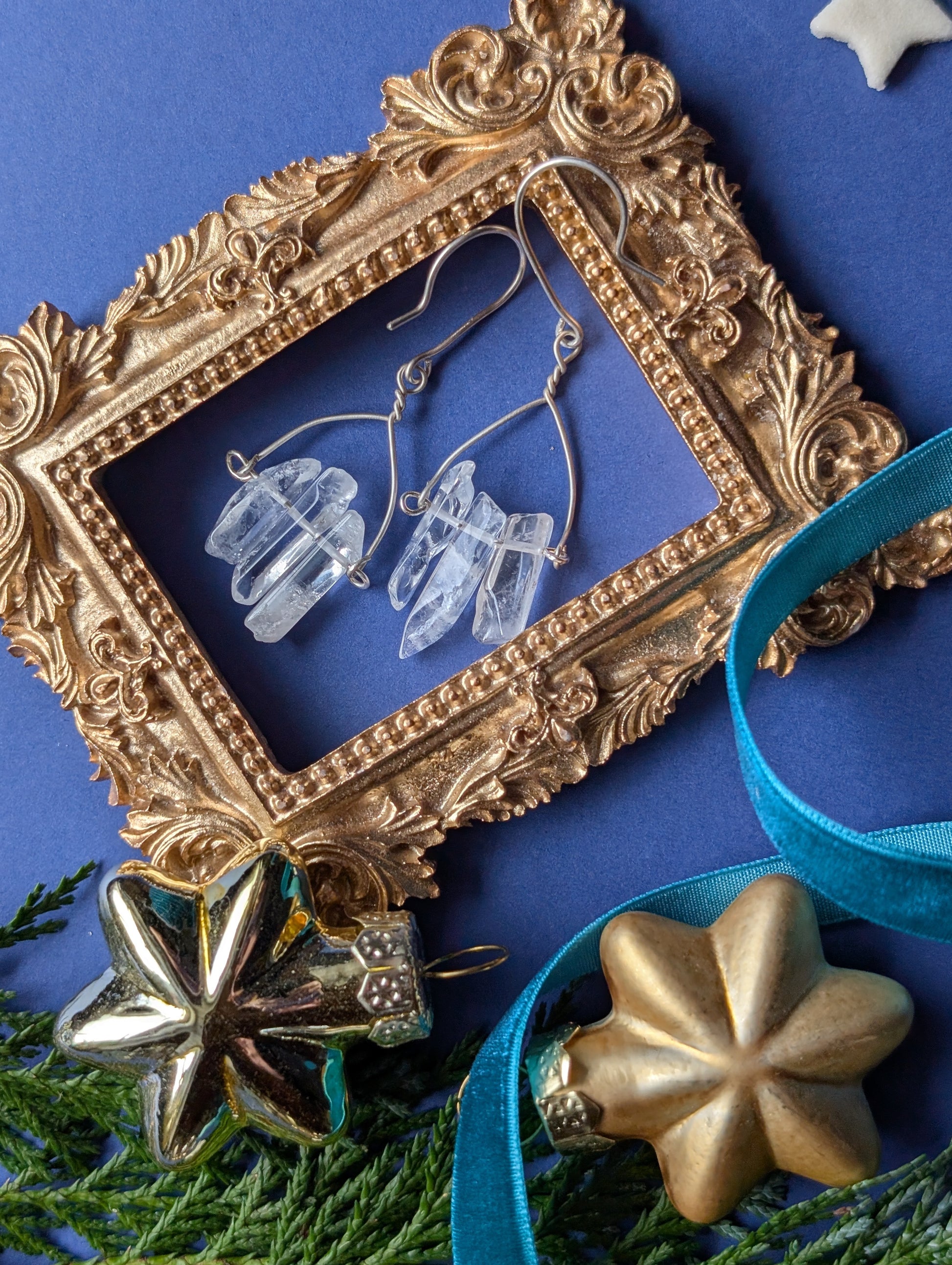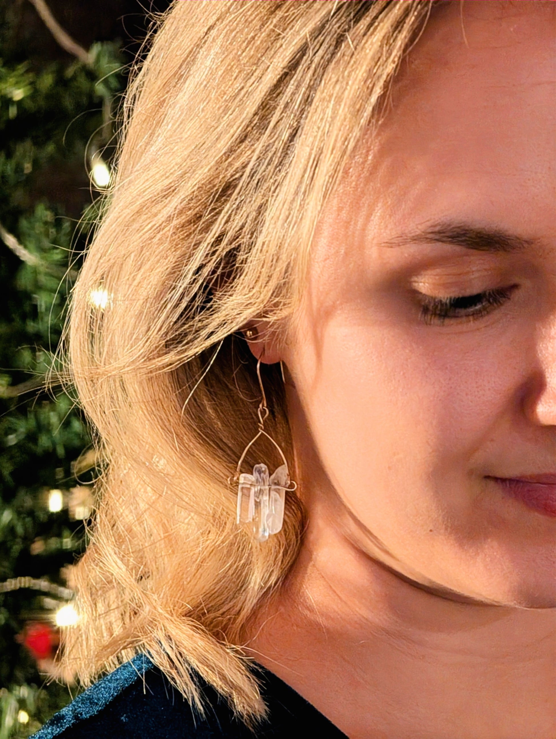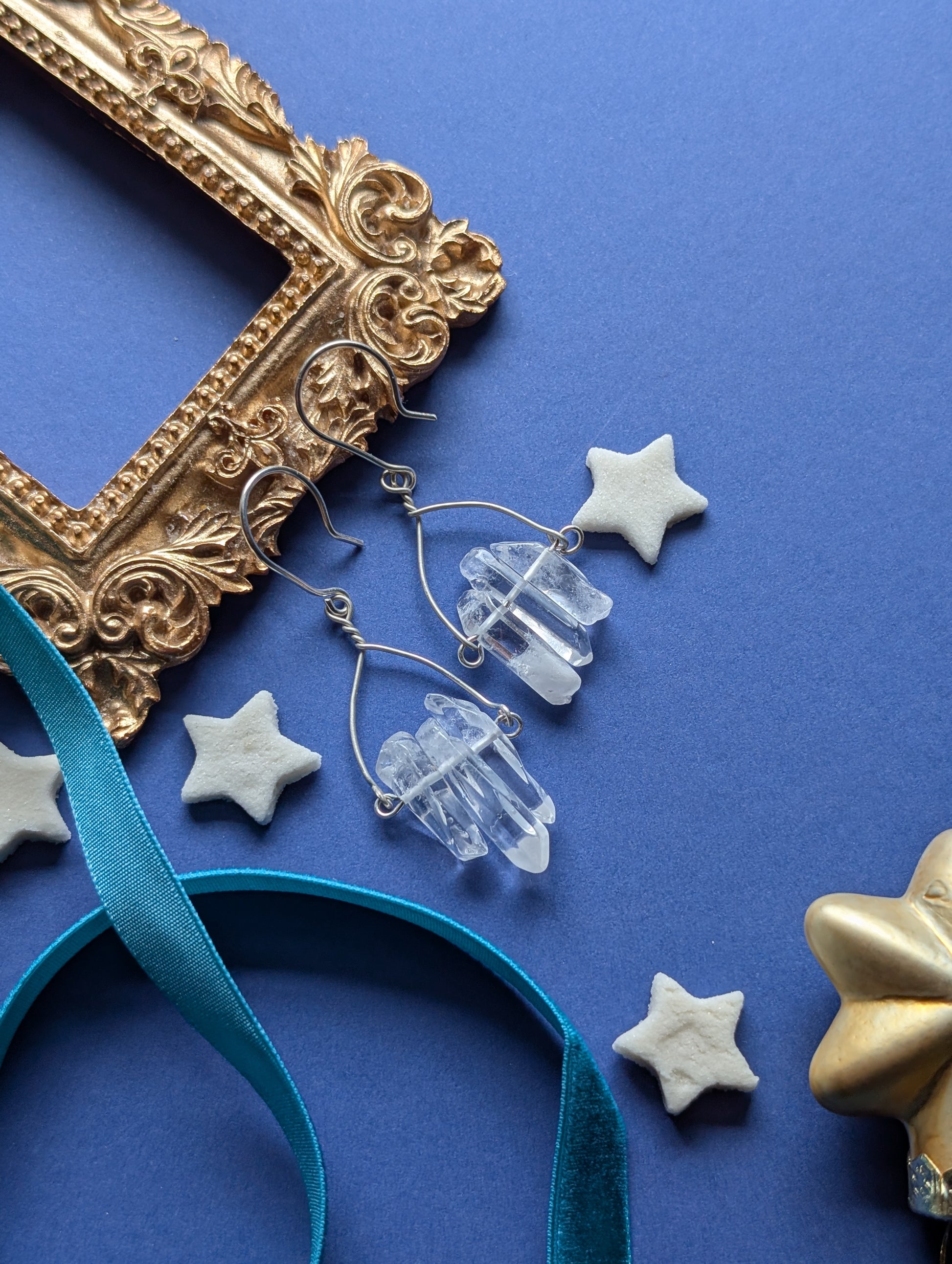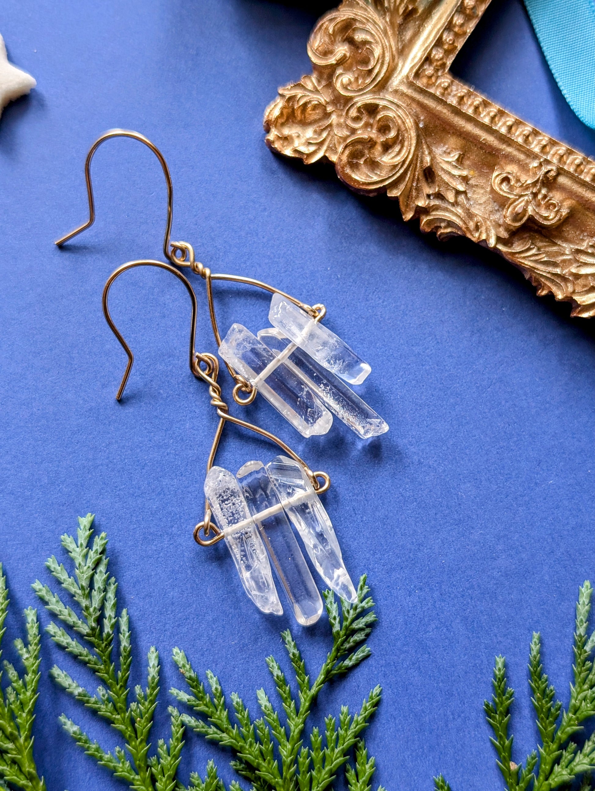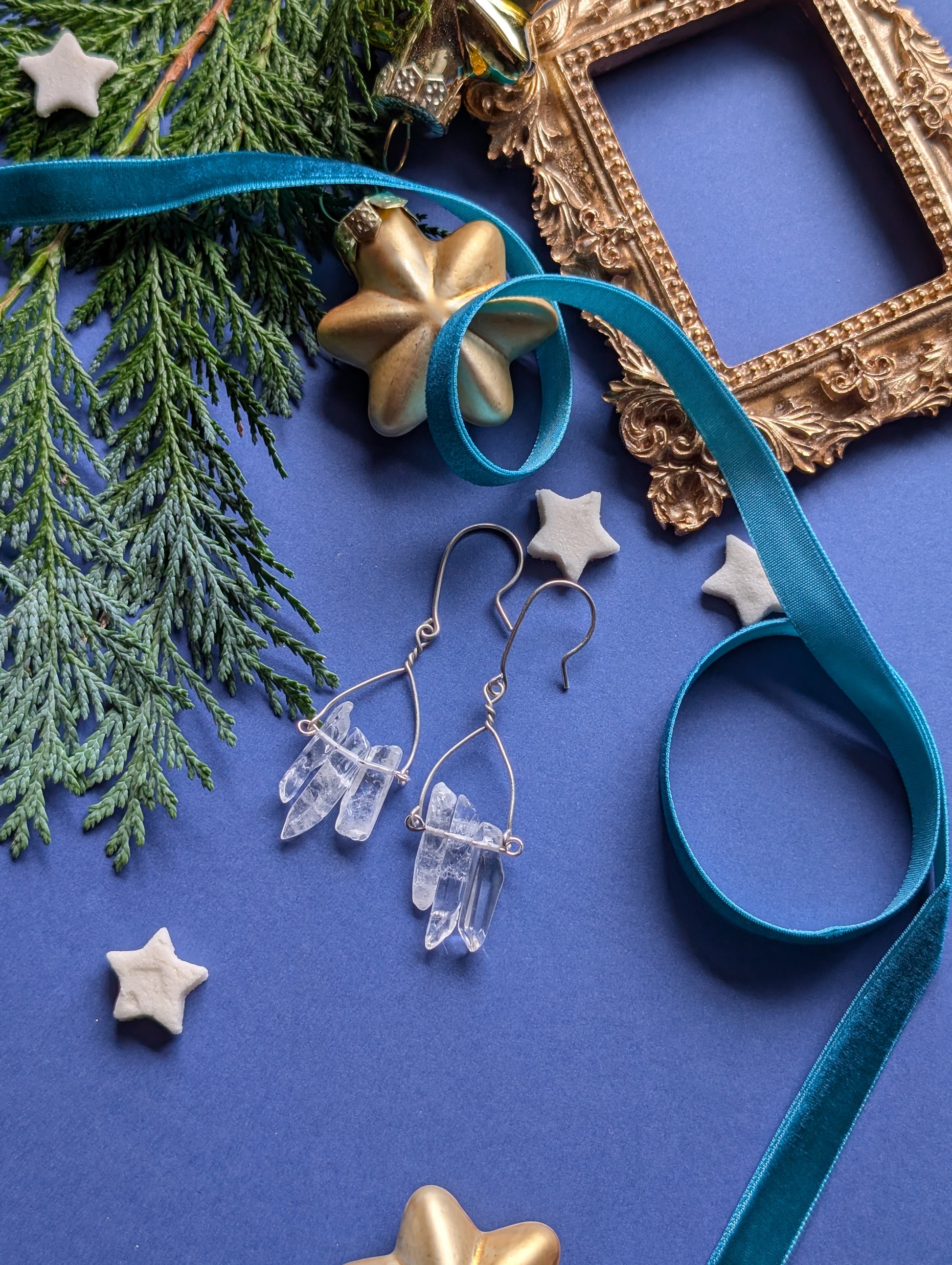 An feinen Drähten reihen sich je drei zarte Quarzsplitter, jeder einzigartig in Form und Länge, auf, die wie winzige, gefrorene Eiszapfen das Licht einfangen. Diese besonderen, komplett handgefertigten, Ohrhänger sind wahlweise aus hochwertigem Silber- oder Gold filled Draht erhältlich.