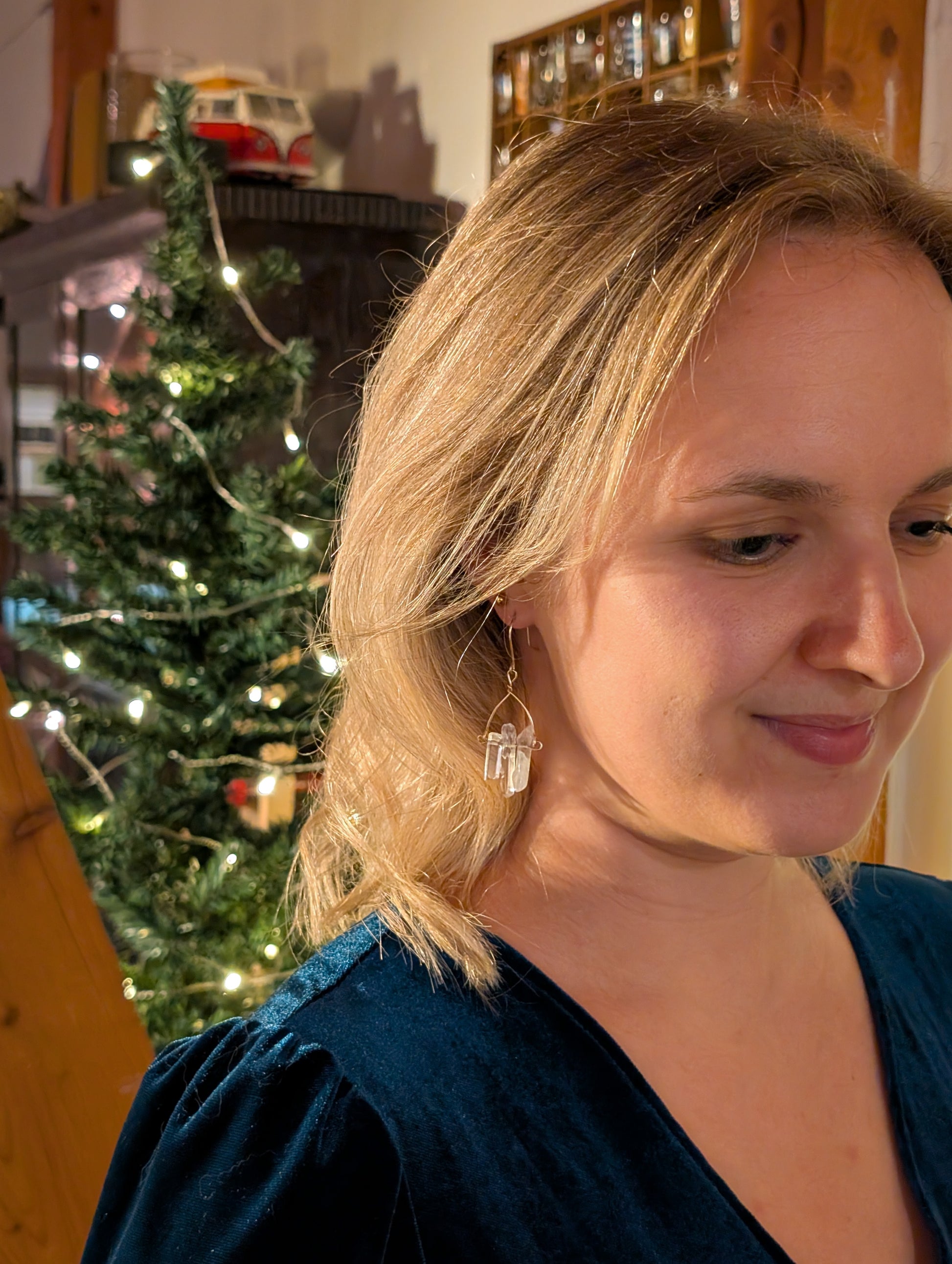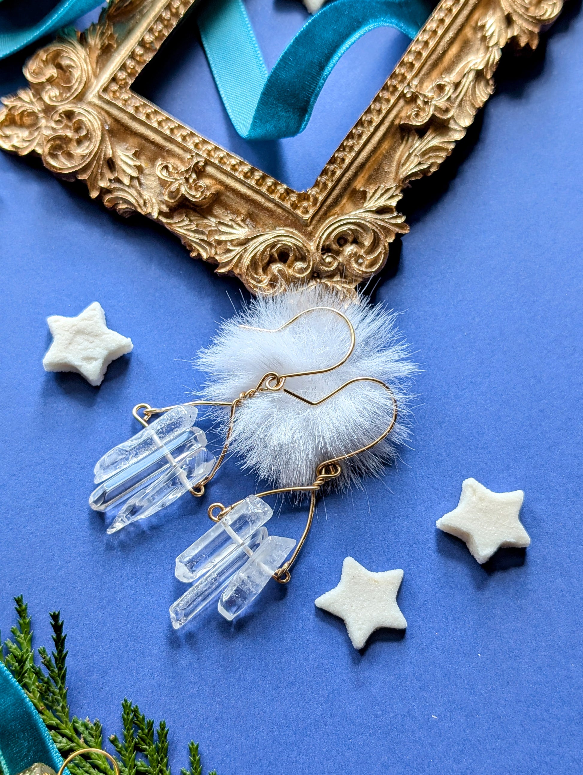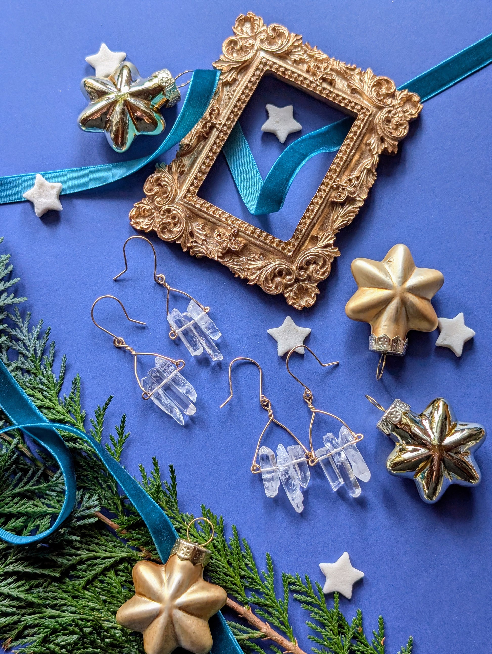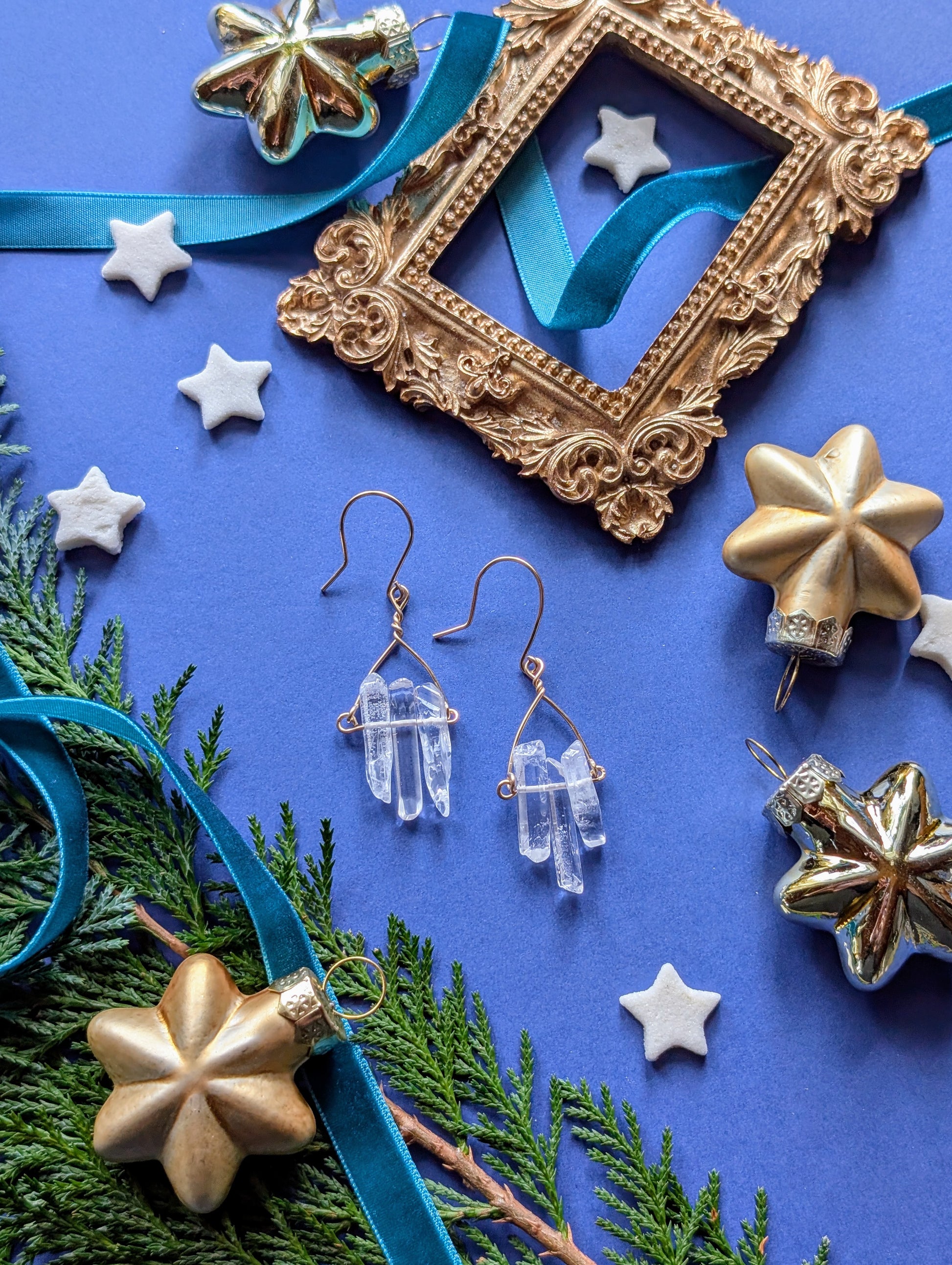 An feinen Drähten reihen sich je drei zarte Quarzsplitter, jeder einzigartig in Form und Länge, auf, die wie winzige, gefrorene Eiszapfen das Licht einfangen. Diese besonderen, komplett handgefertigten, Ohrhänger sind wahlweise aus hochwertigem Silber- oder Gold filled Draht erhältlich.