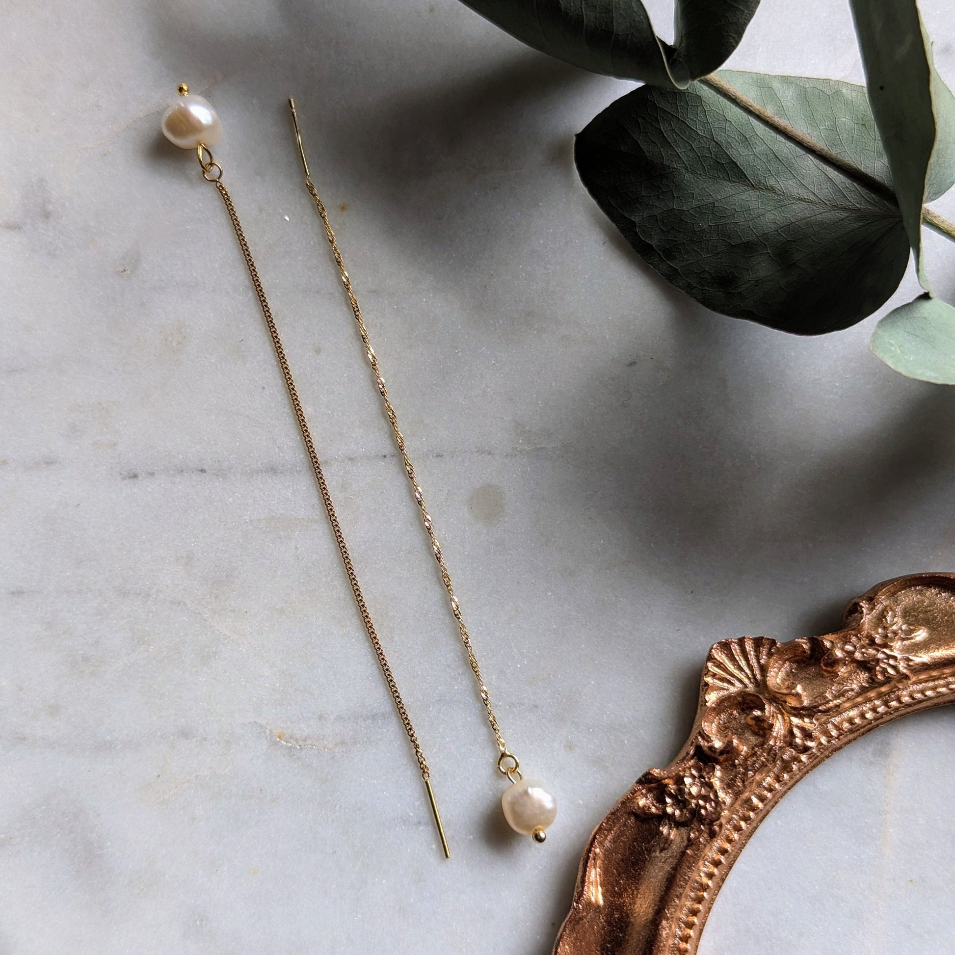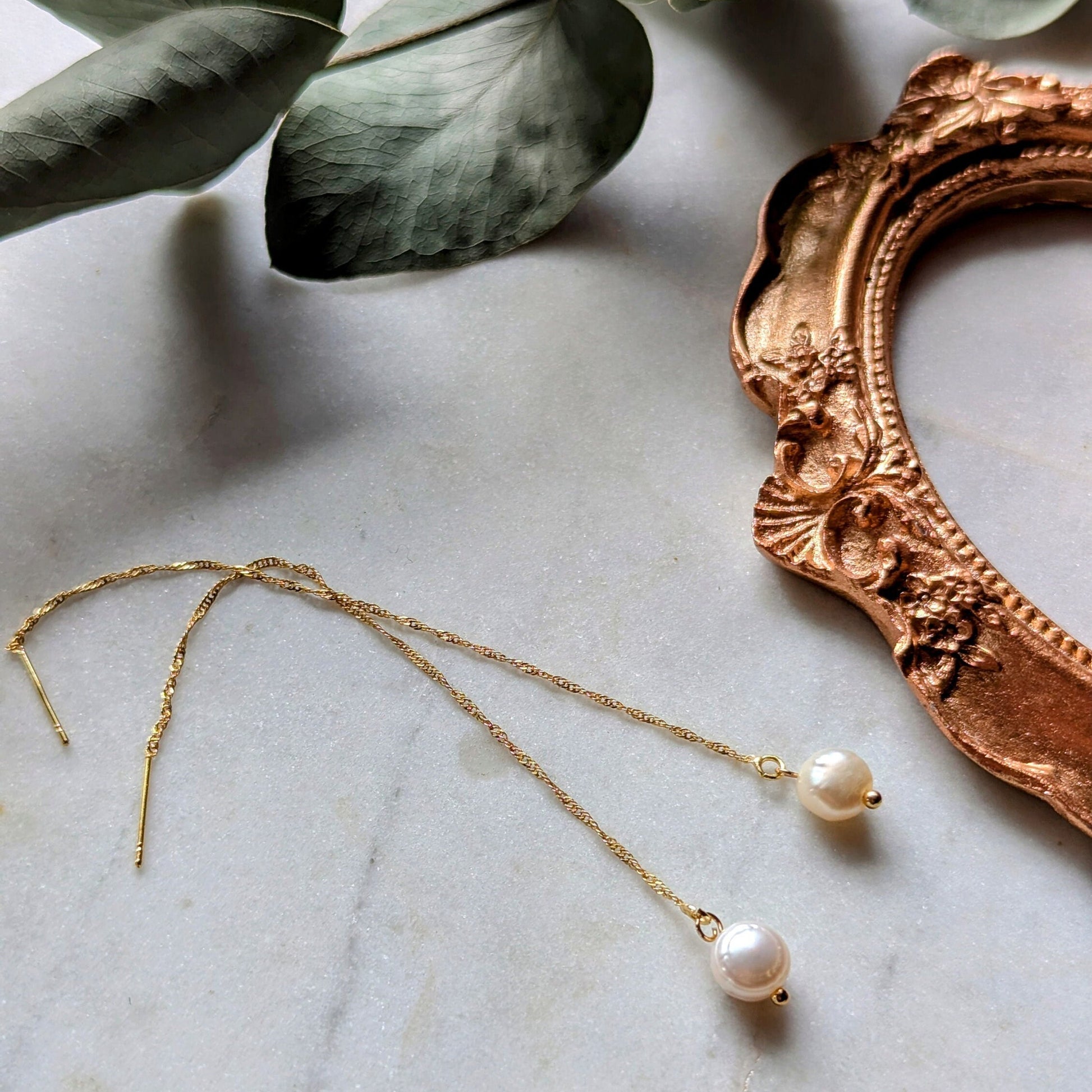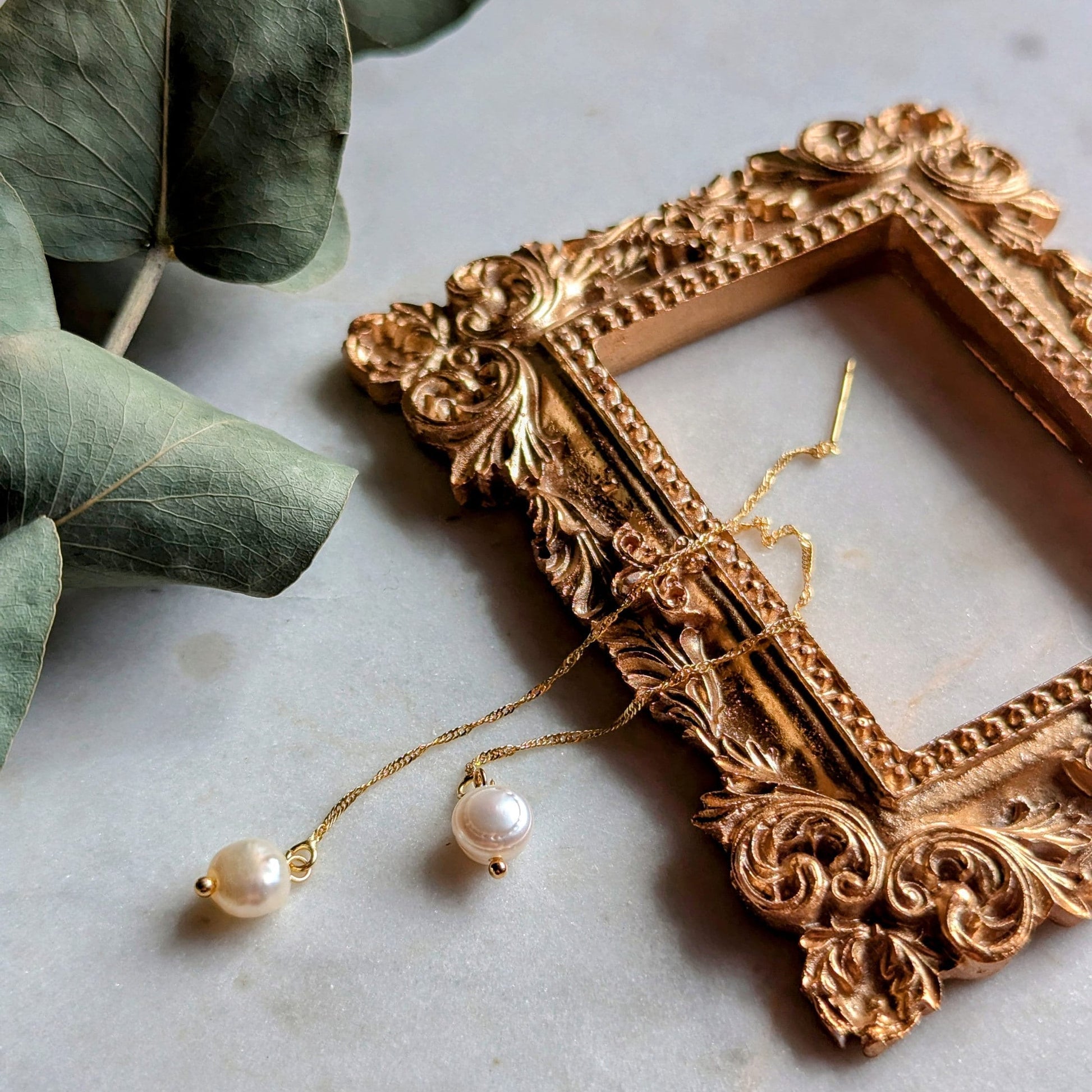 Fadenohrringe "Singapore Glow" – Goldene Messing-Kette & Süßwasserperlen