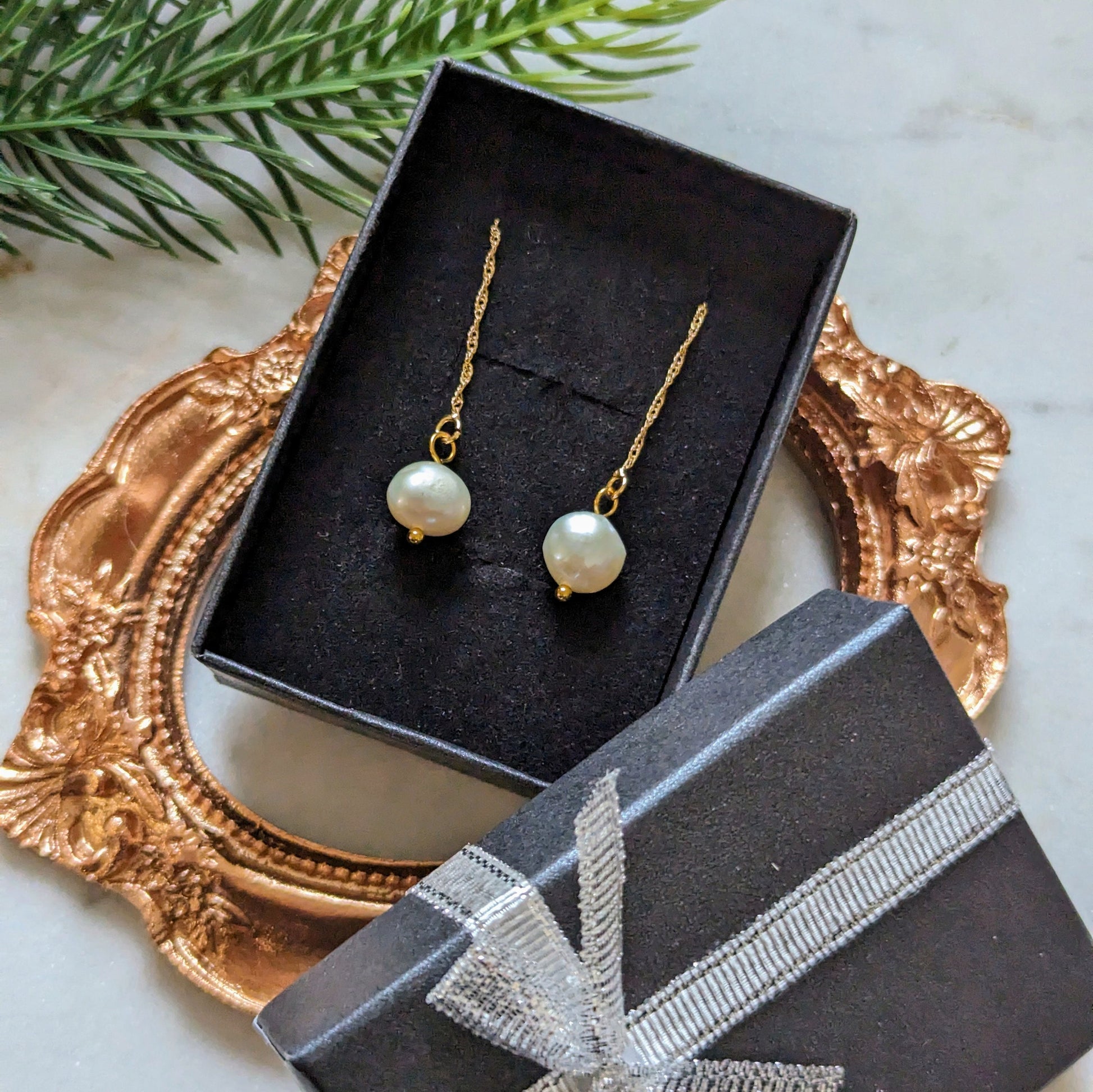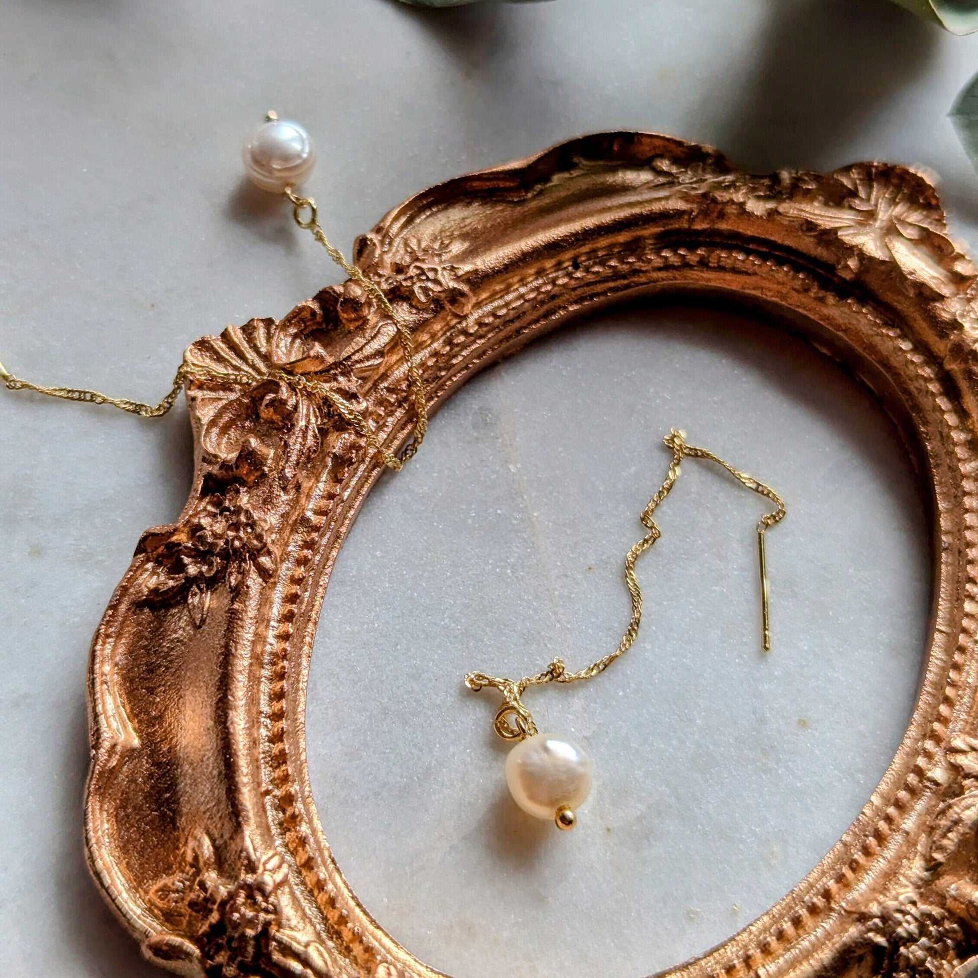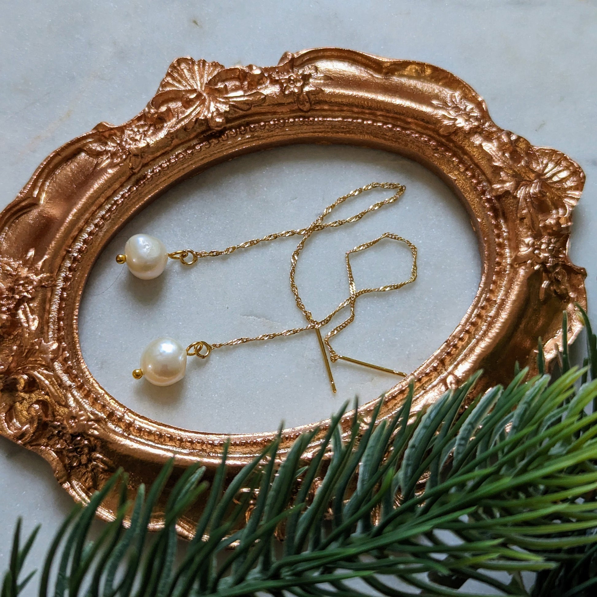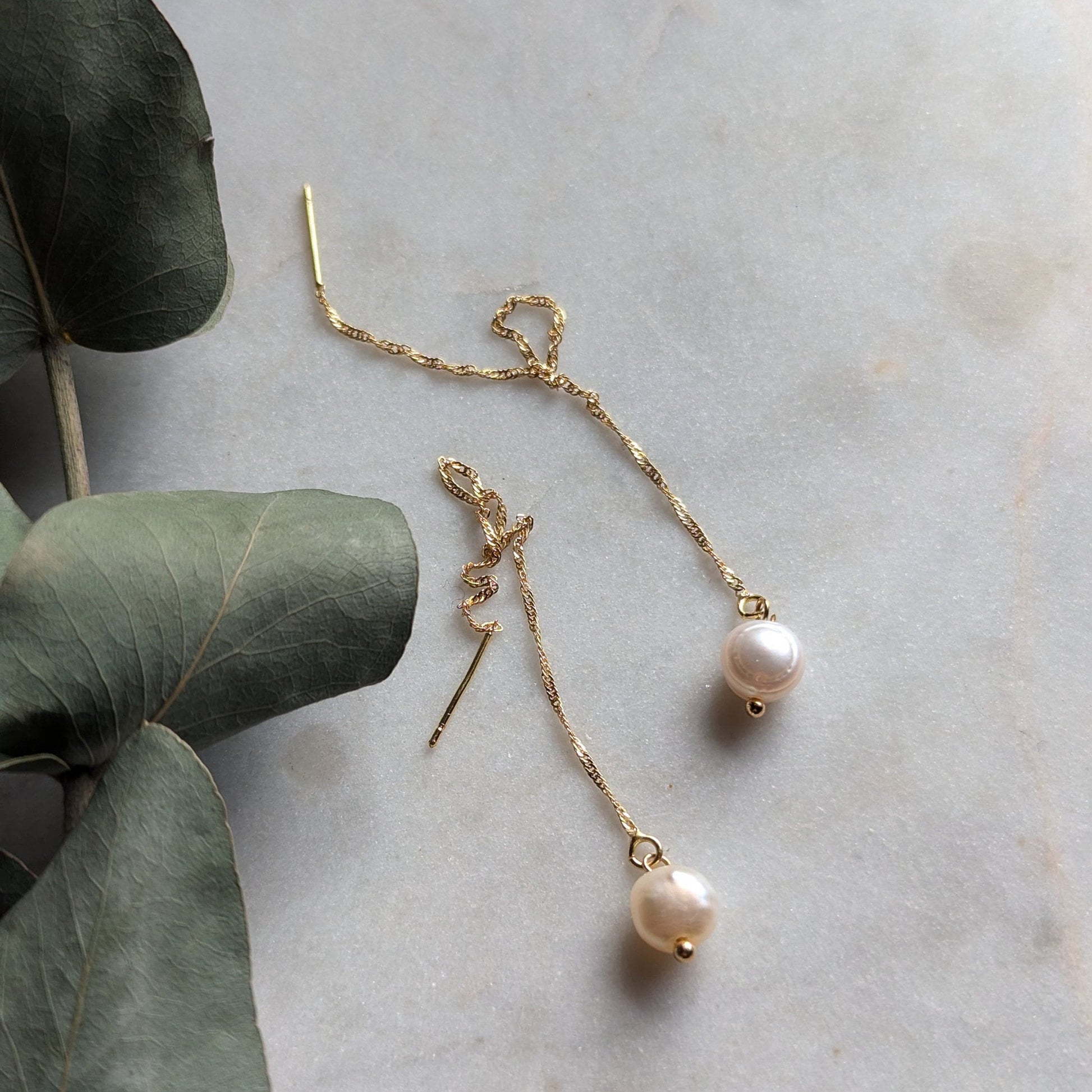 Fadenohrringe "Singapore Glow" – Goldene Messing-Kette & Süßwasserperlen