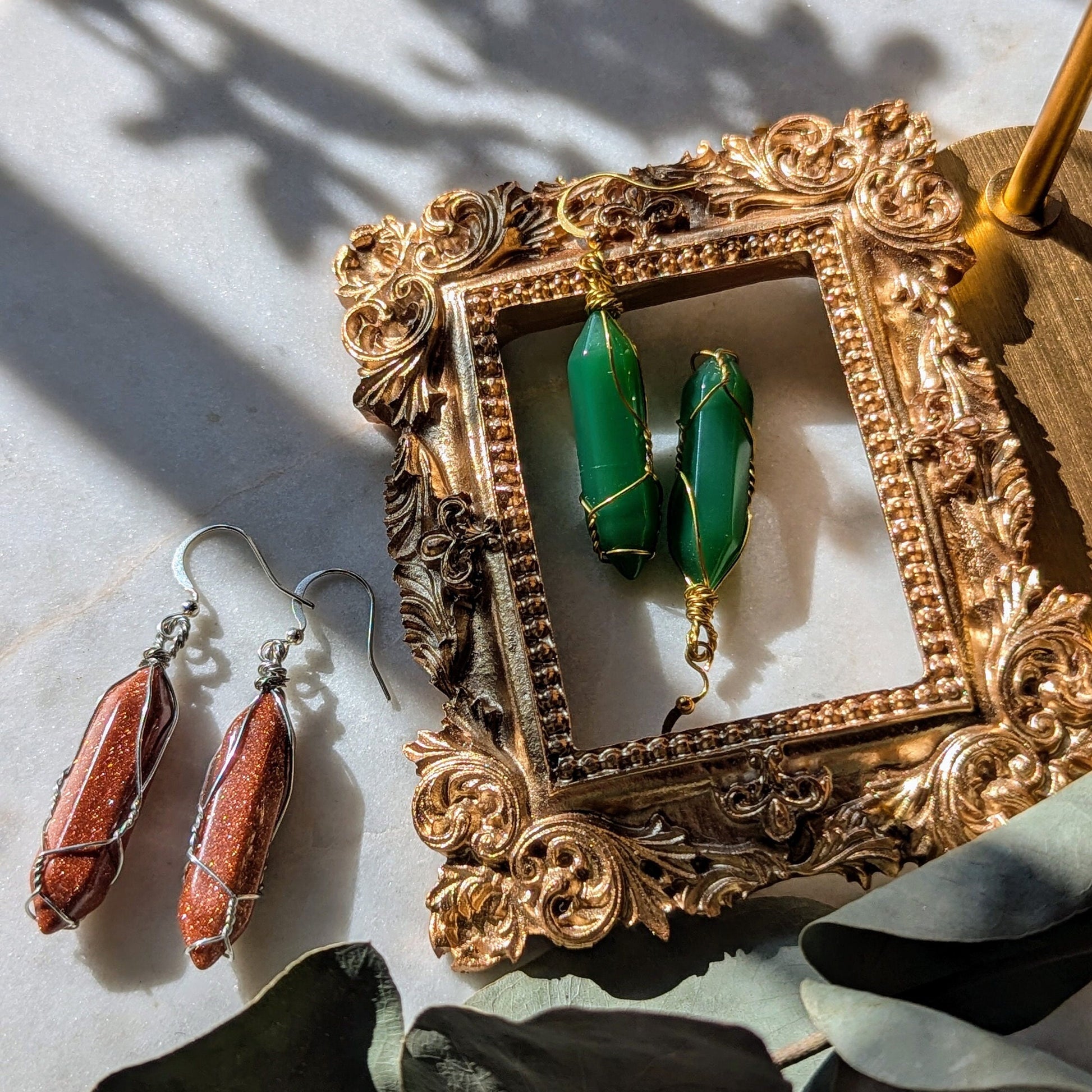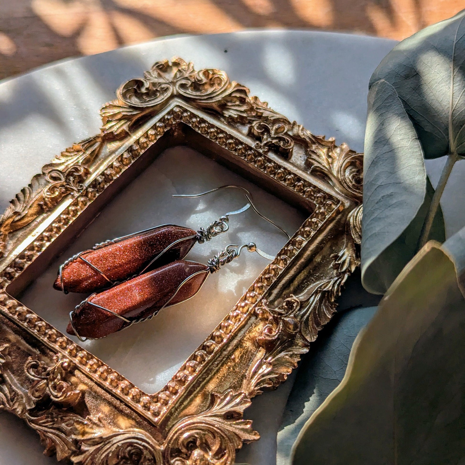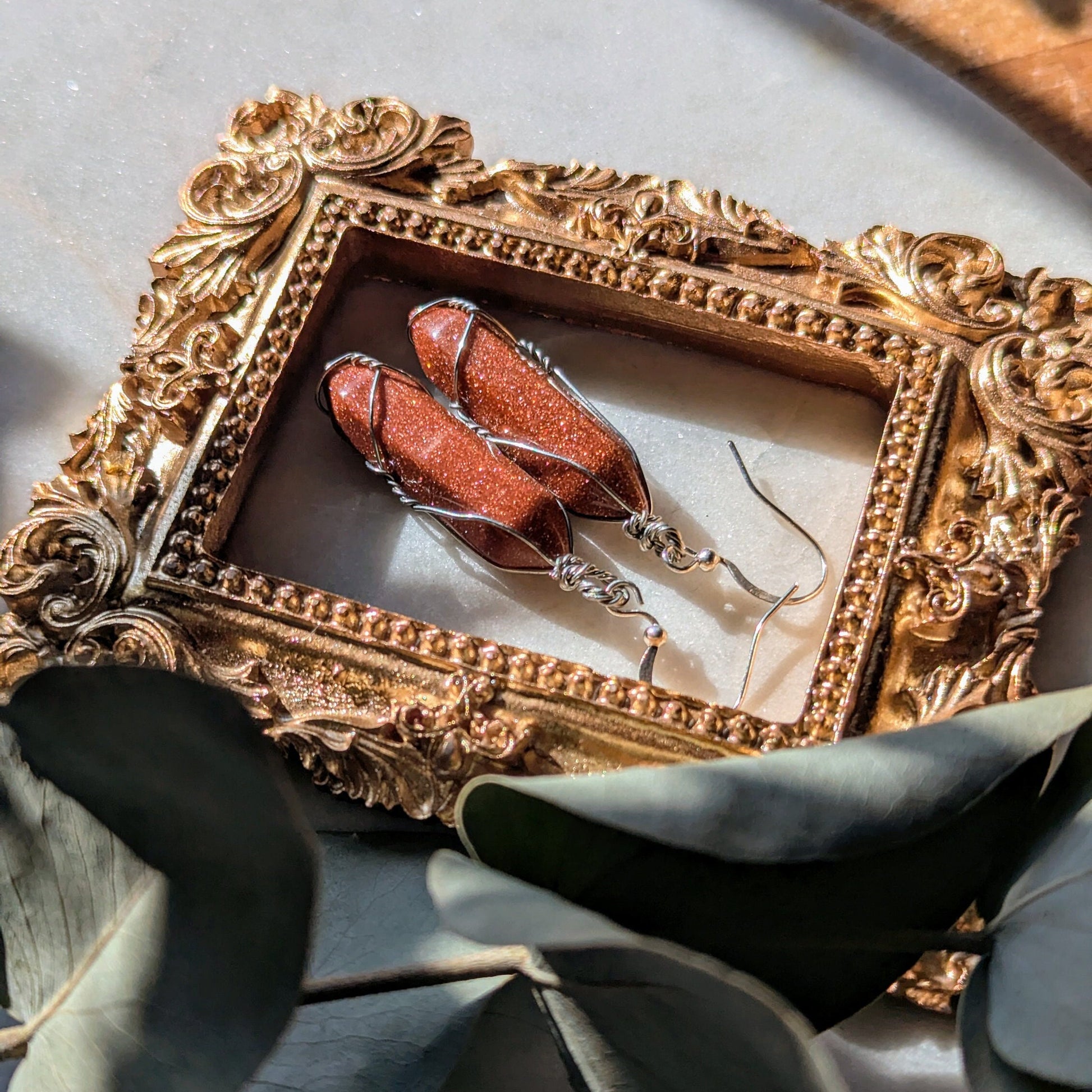 Die Ohrhänger "Starlight Glow" sind handgefertigte Schmuckstücke, die den Zauber des Sternenhimmels einfangen. Jedes bronzefarbene Goldflusspendel ist kunstvoll in filigranen silbernen Schmuckdraht gefasst und glitzert bei jeder Lichtreflexion wie tausende funkelnde Sterne. Diese einzigartigen Ohrhänger verleihen selbst dem grauen Alltag ein besonderes Funkeln und ziehen bewundernde Blicke auf sich.