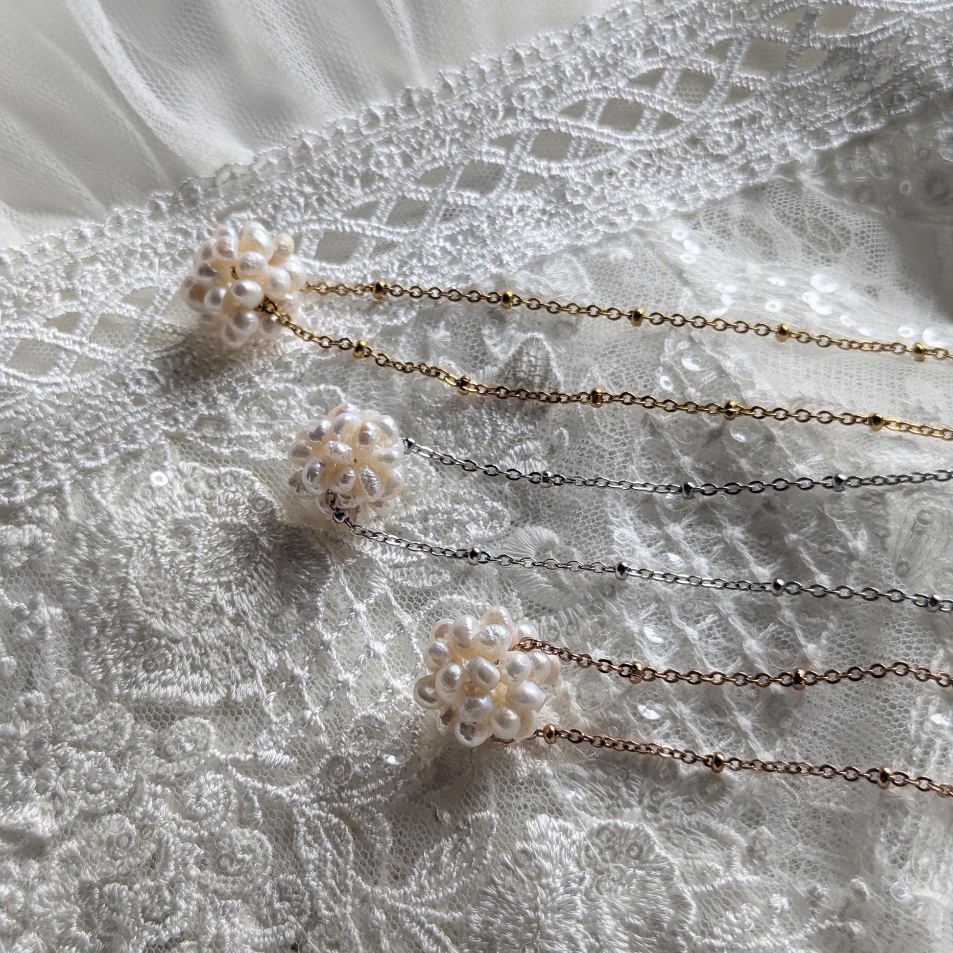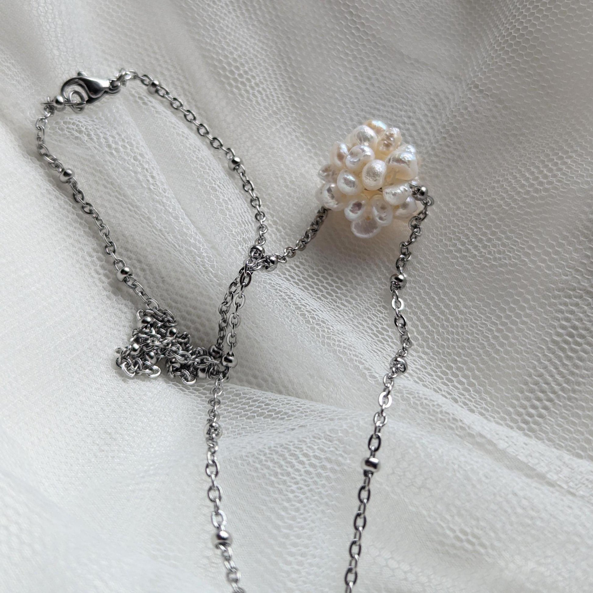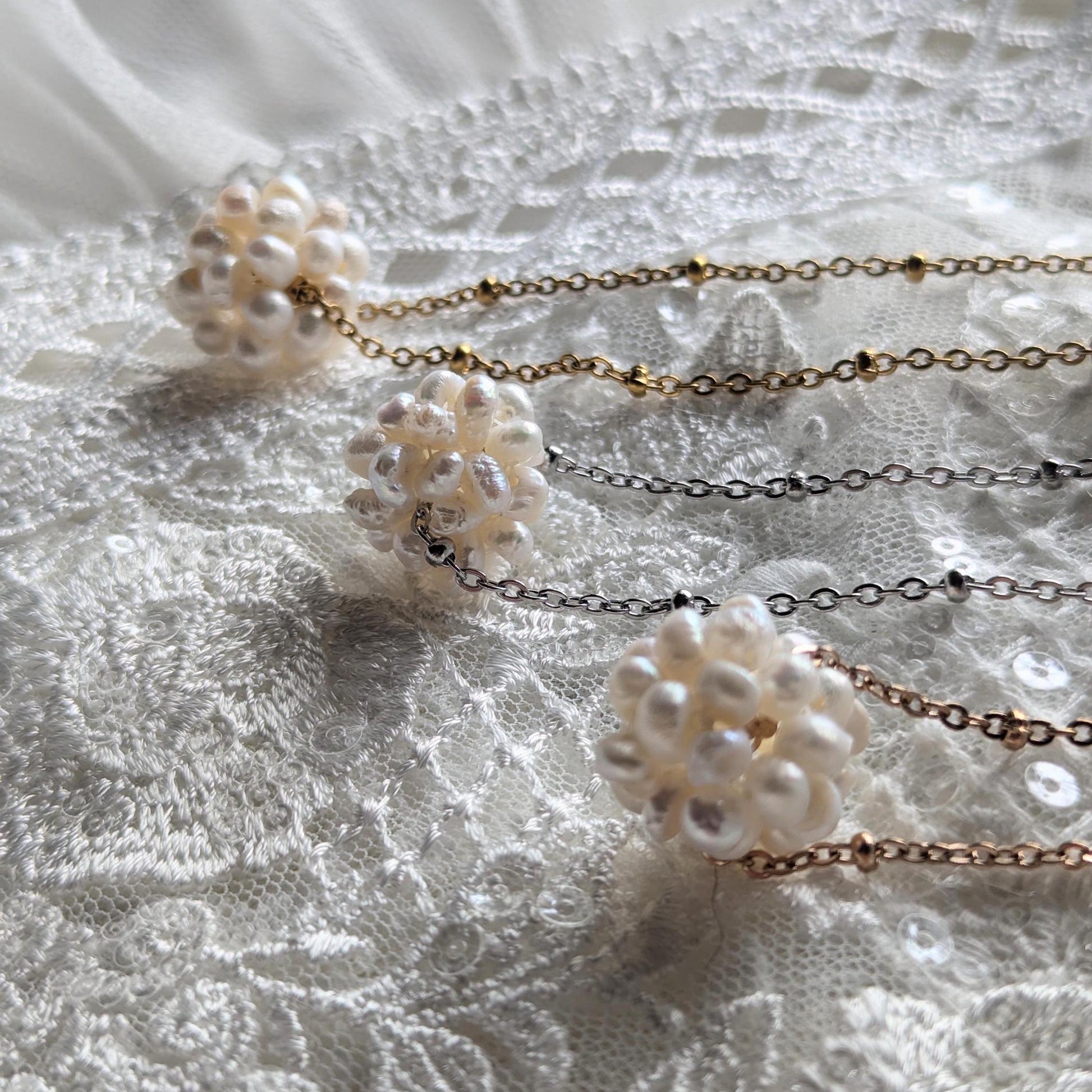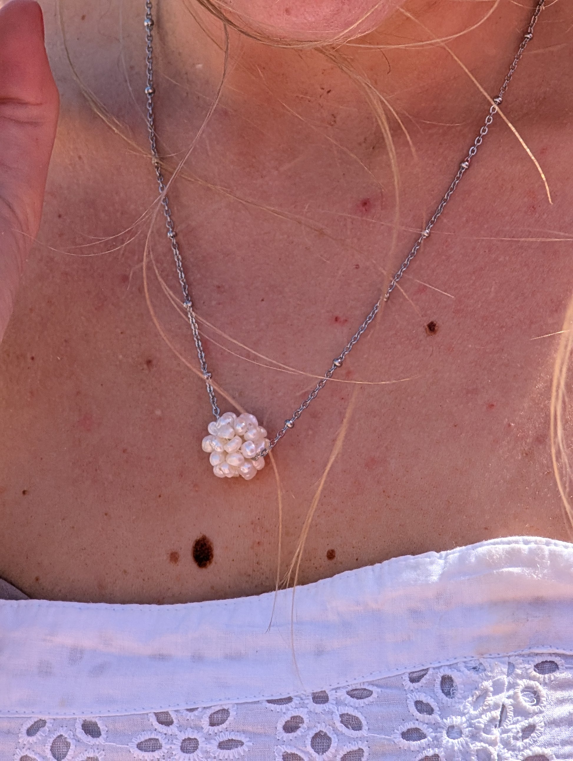 Winterliches Design und trotzdem Schmuck für das ganze Jahr - zarte Schneebälle aus kleinen Süßwasserperlen von Hand zusammengefügt und mit einer Halskette kombiniert.