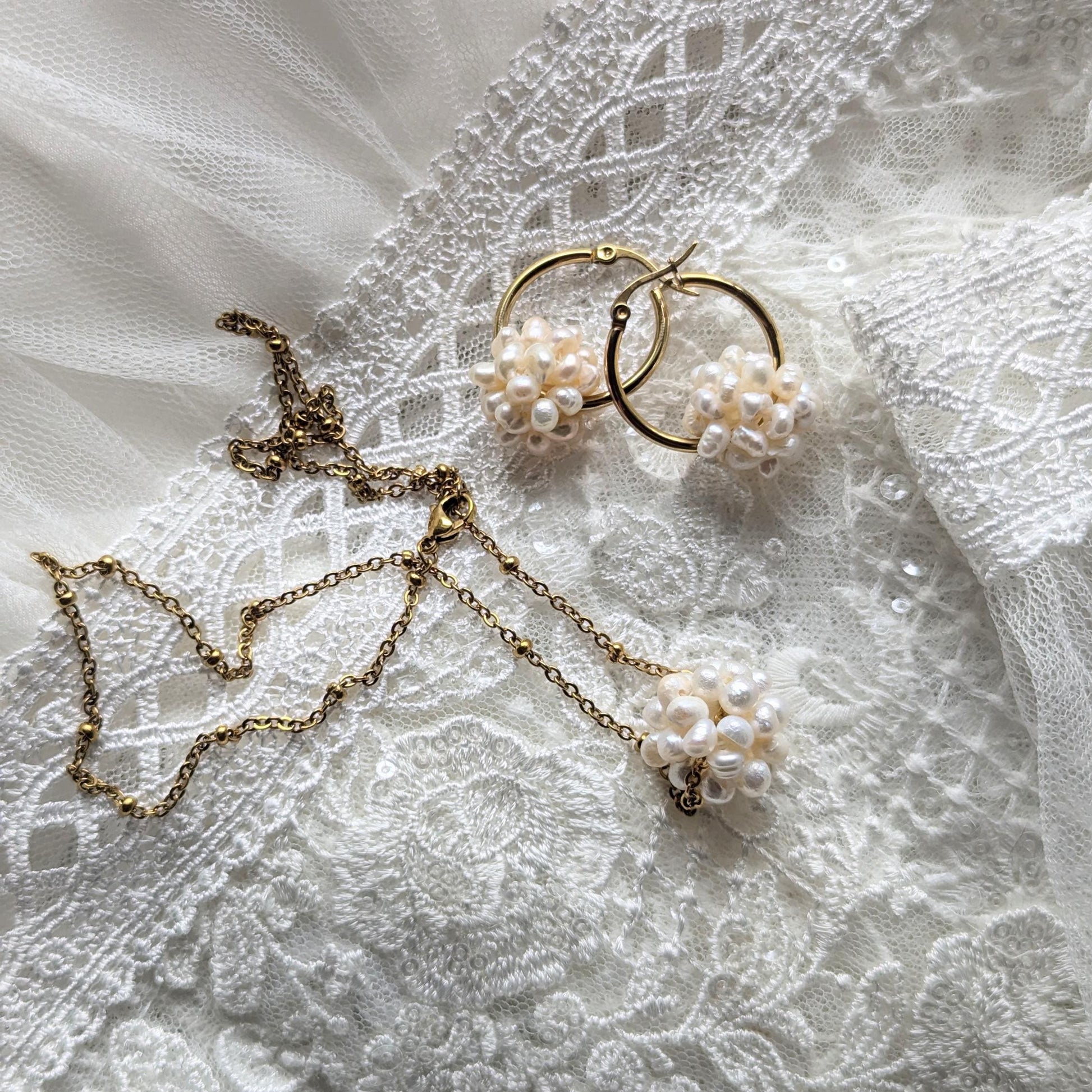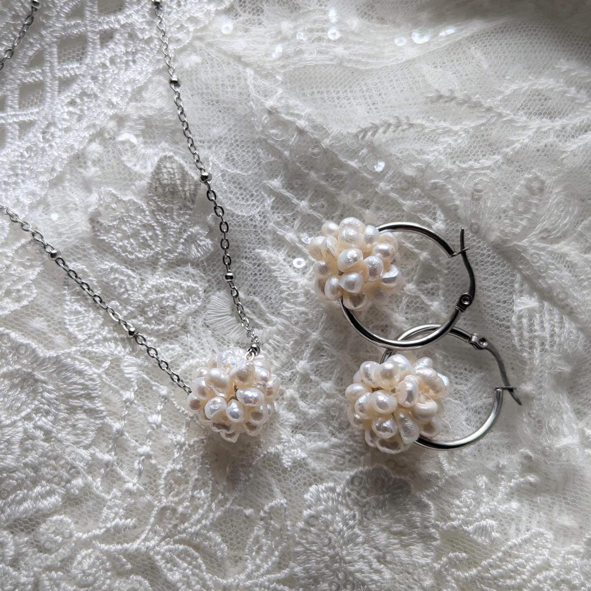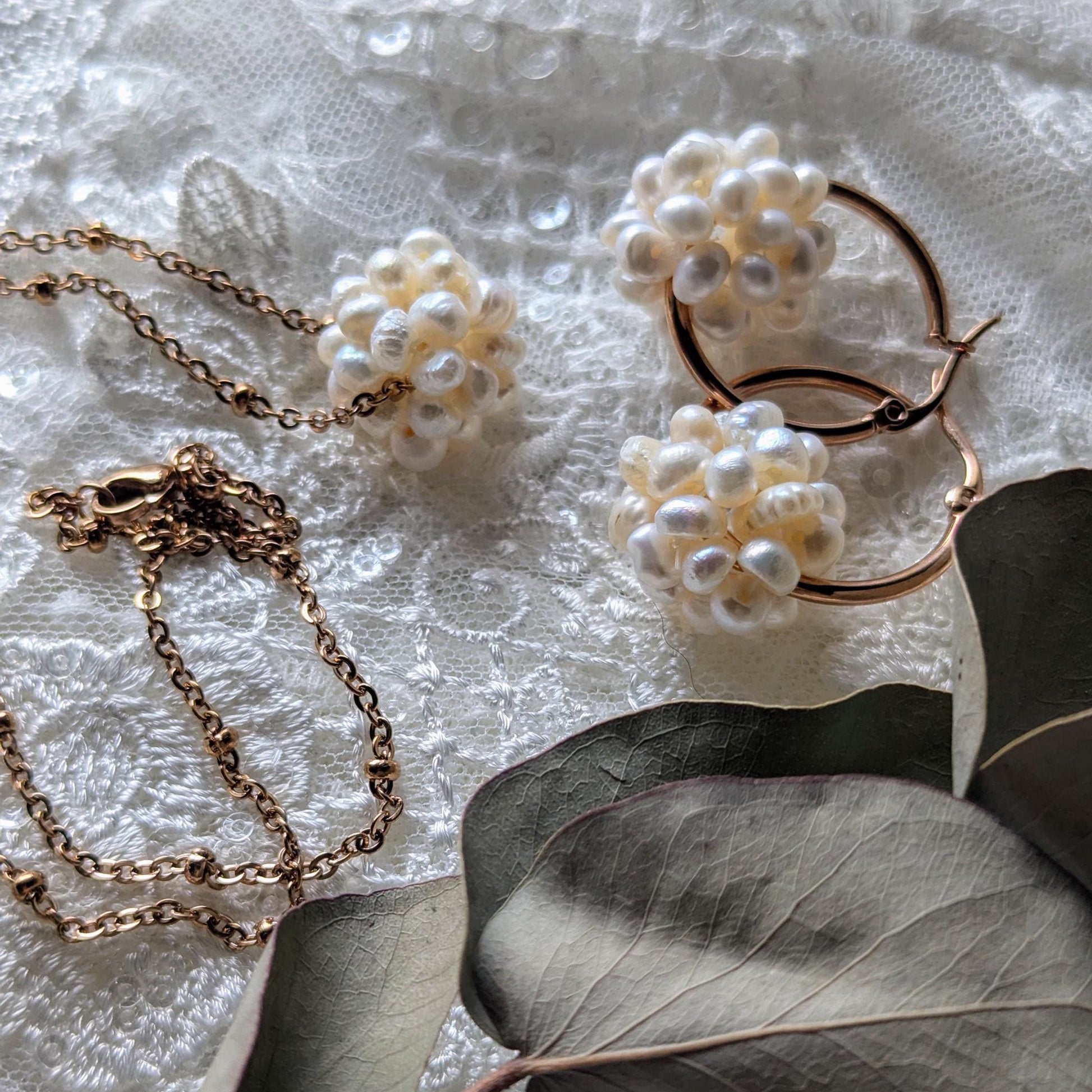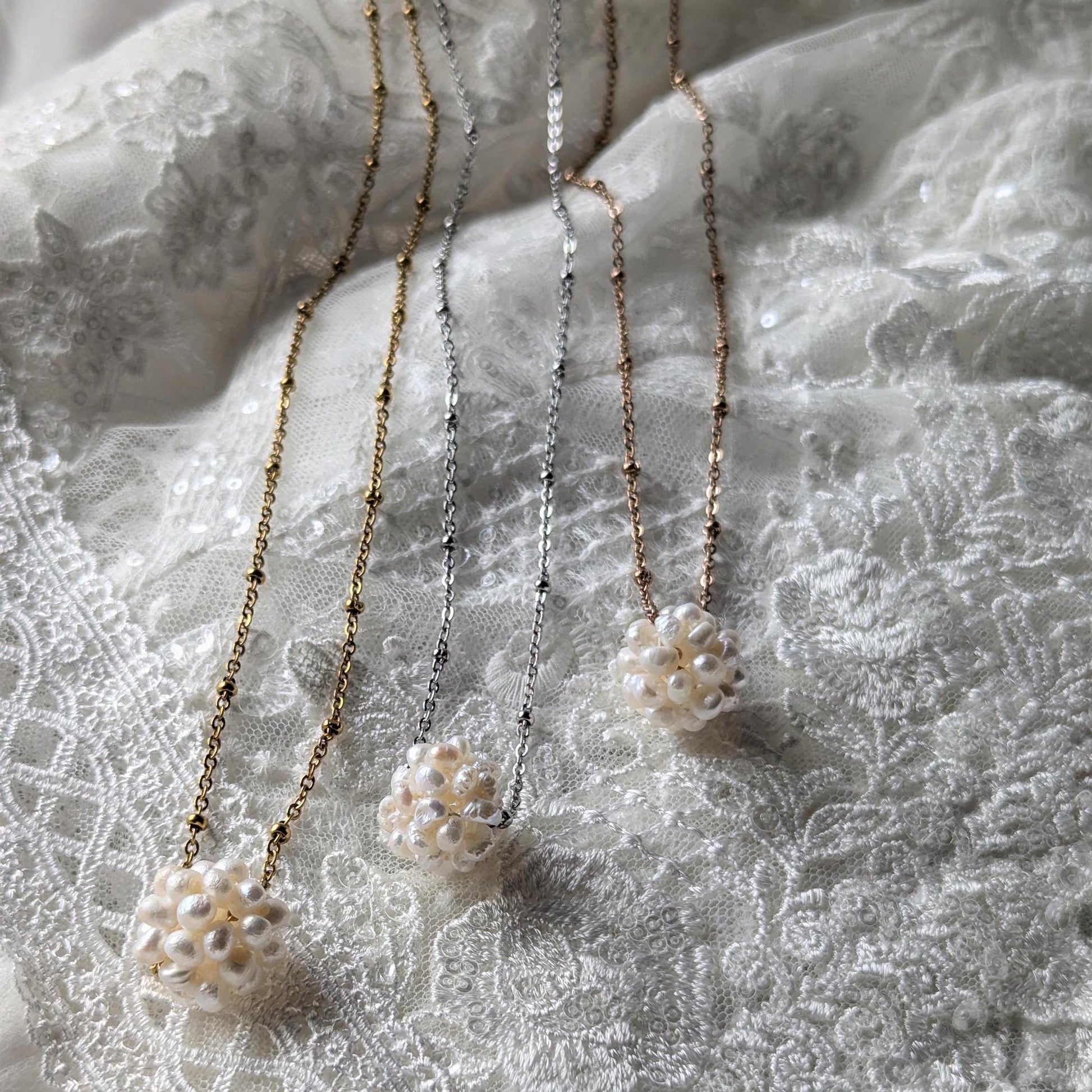 Winterliches Design und trotzdem Schmuck für das ganze Jahr - zarte Schneebälle aus kleinen Süßwasserperlen von Hand zusammengefügt und mit einer Halskette kombiniert.