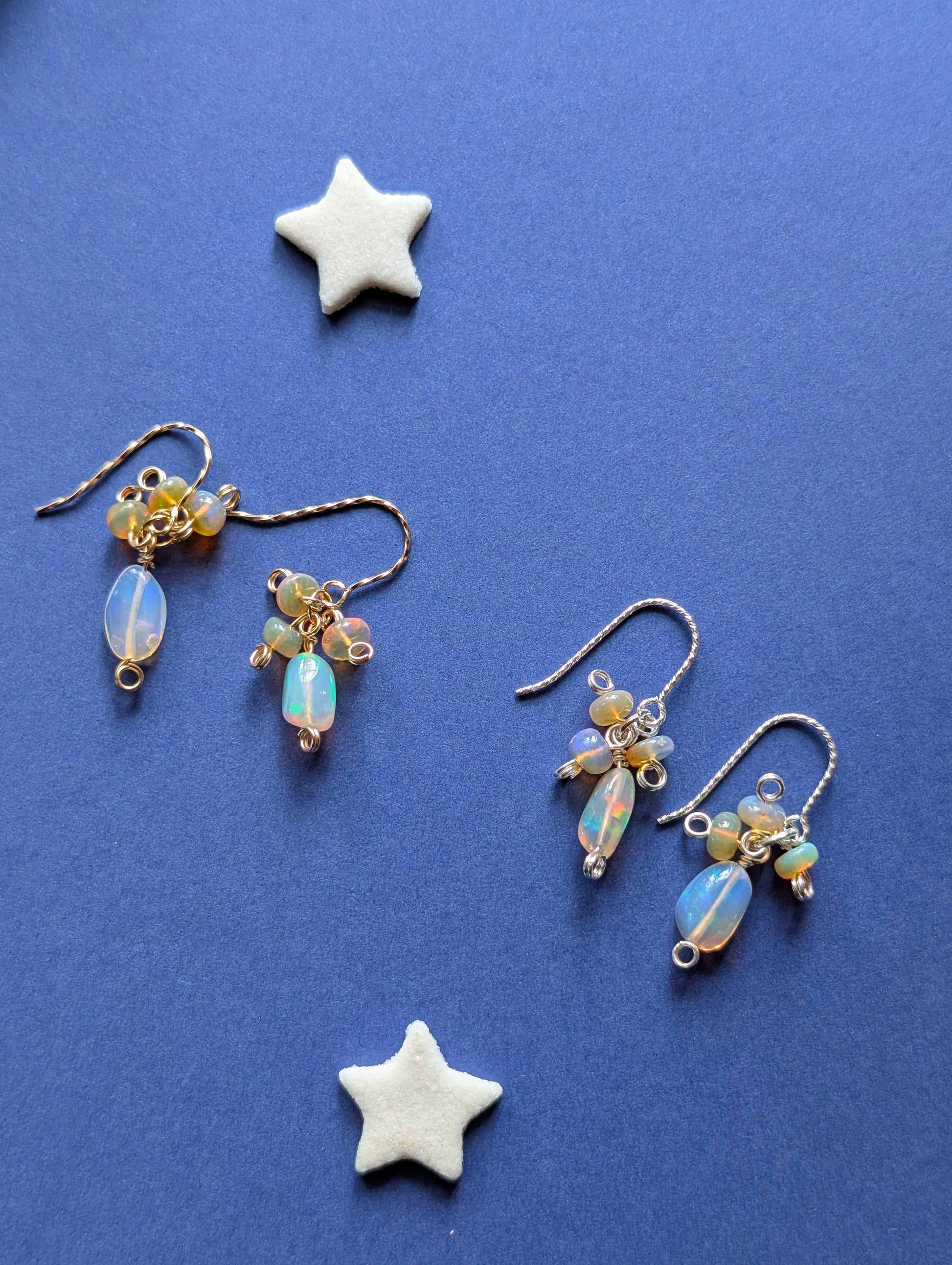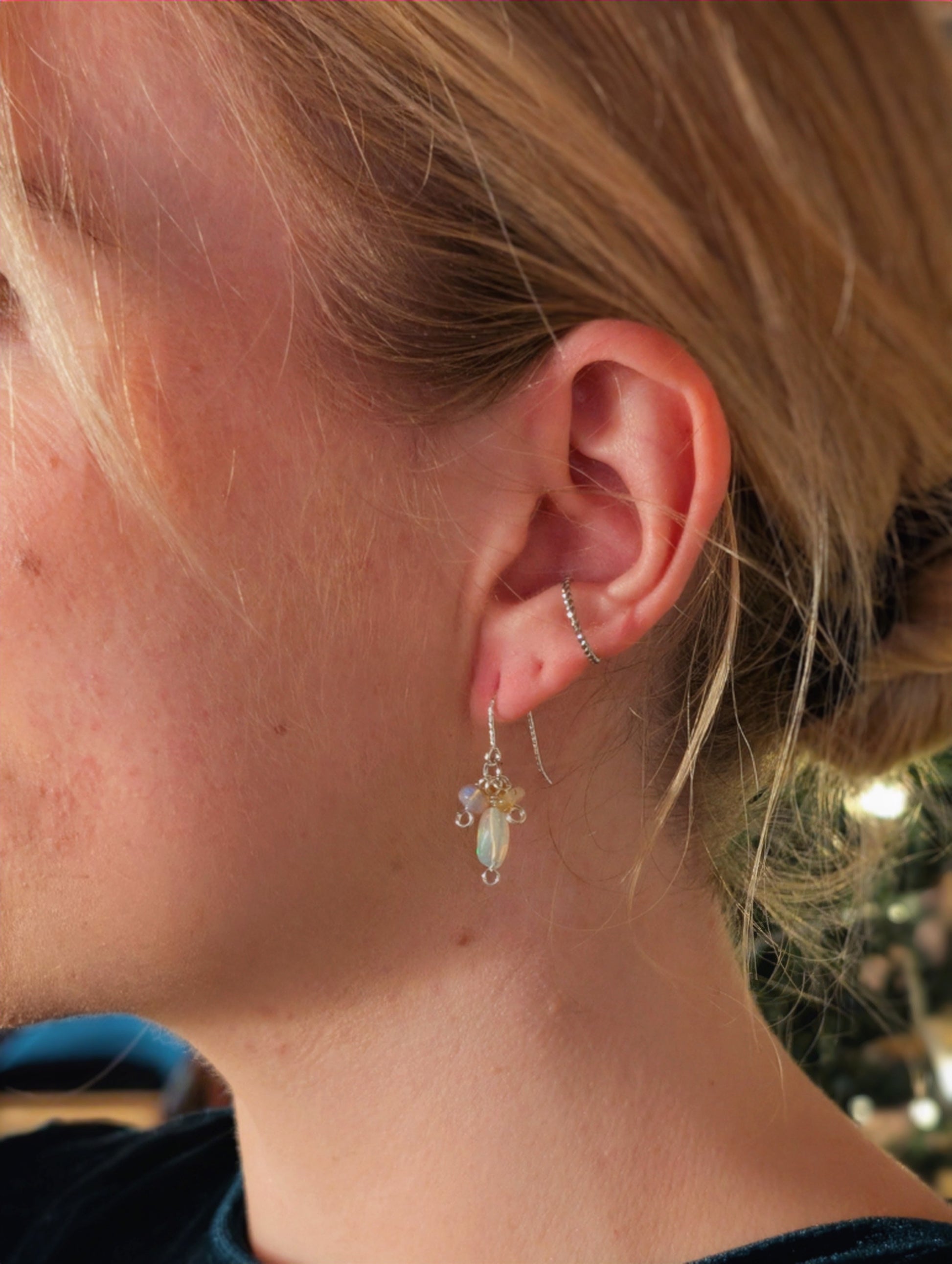 Jeder Ohrring besteht aus drei gelblichen Feueropal-Perlen von ca. 4x3 mm und einer längeren, weißlichen Feueropal-Perle von ca. 8x5 mm. Die Gesamtlänge der Ohrringe beträgt ca. 3 cm.