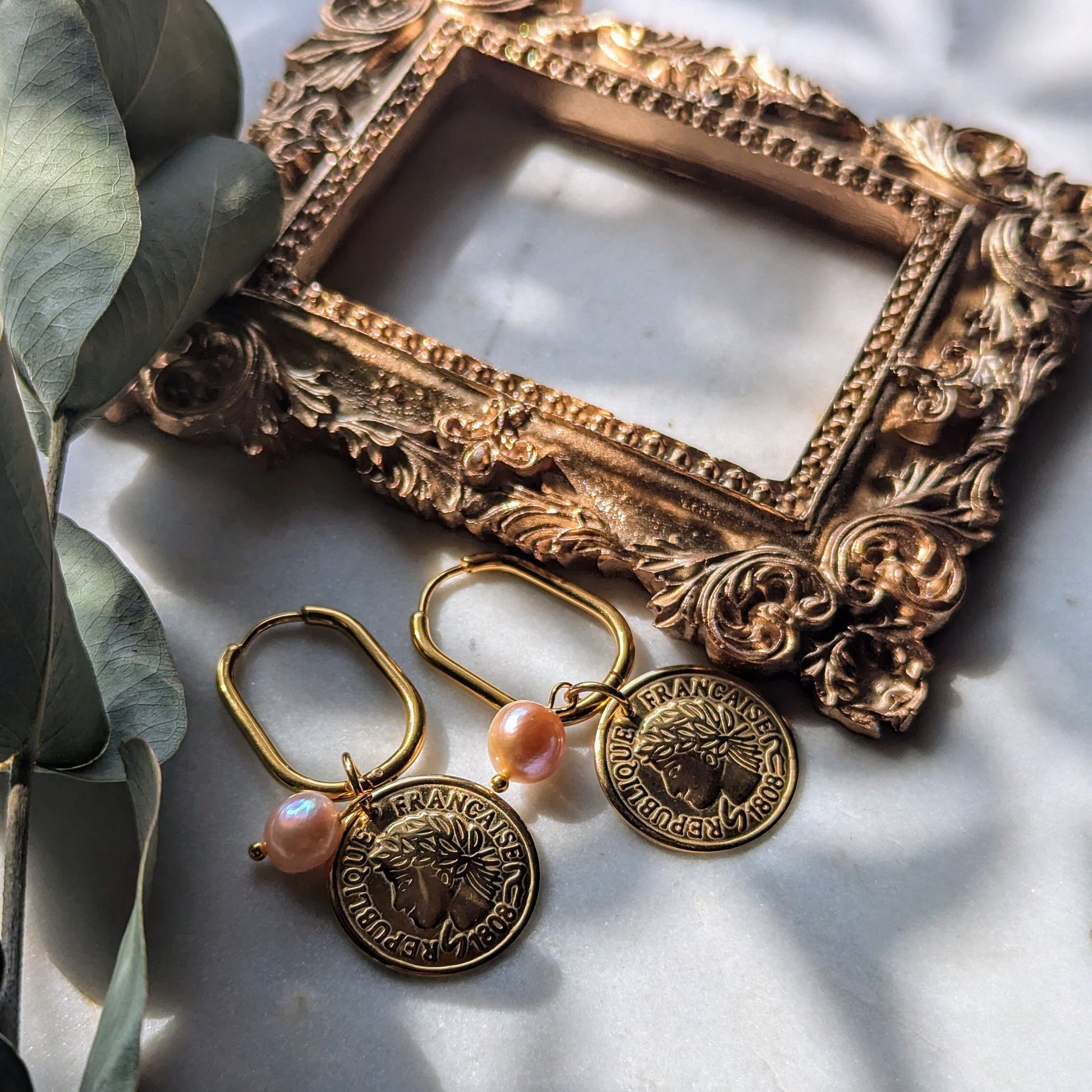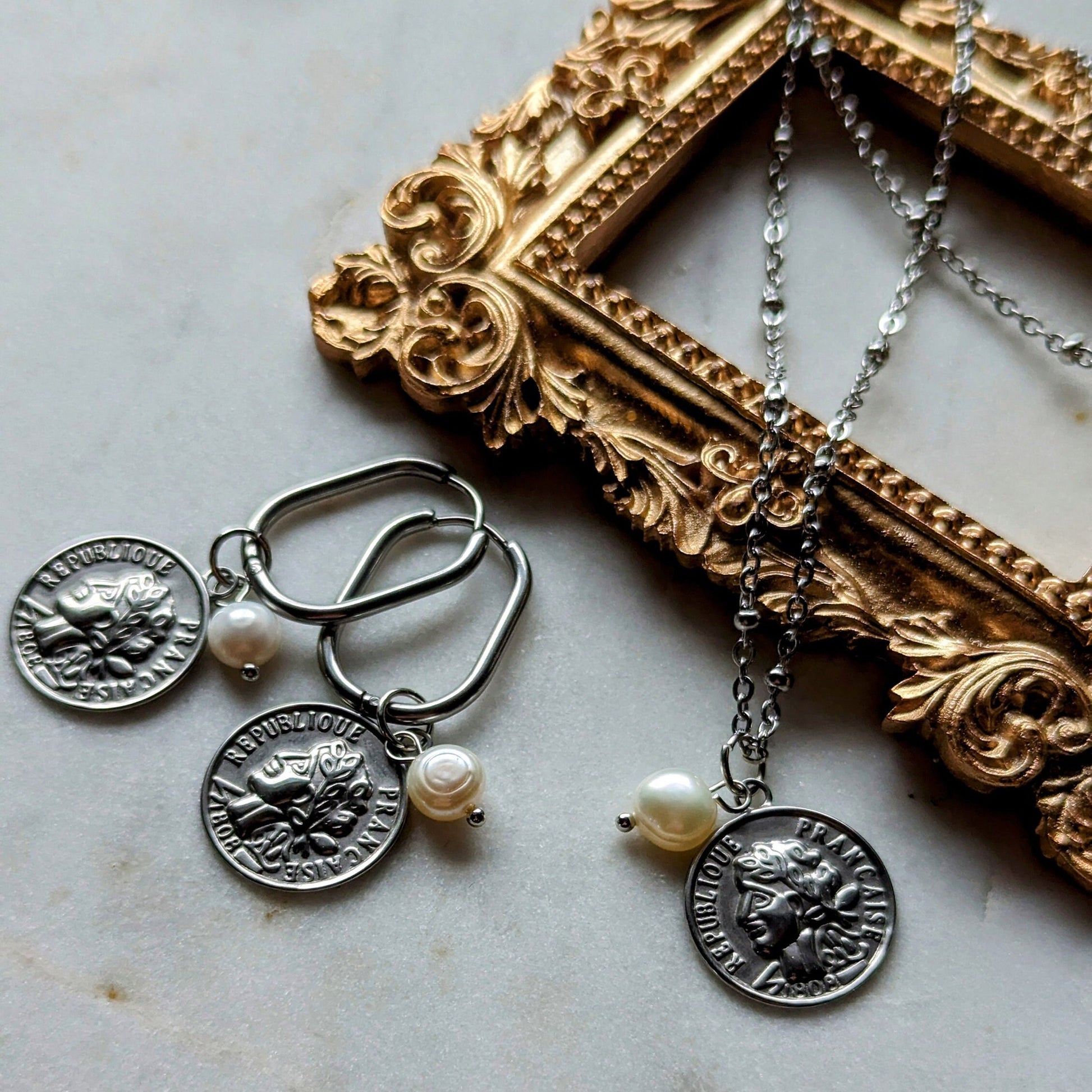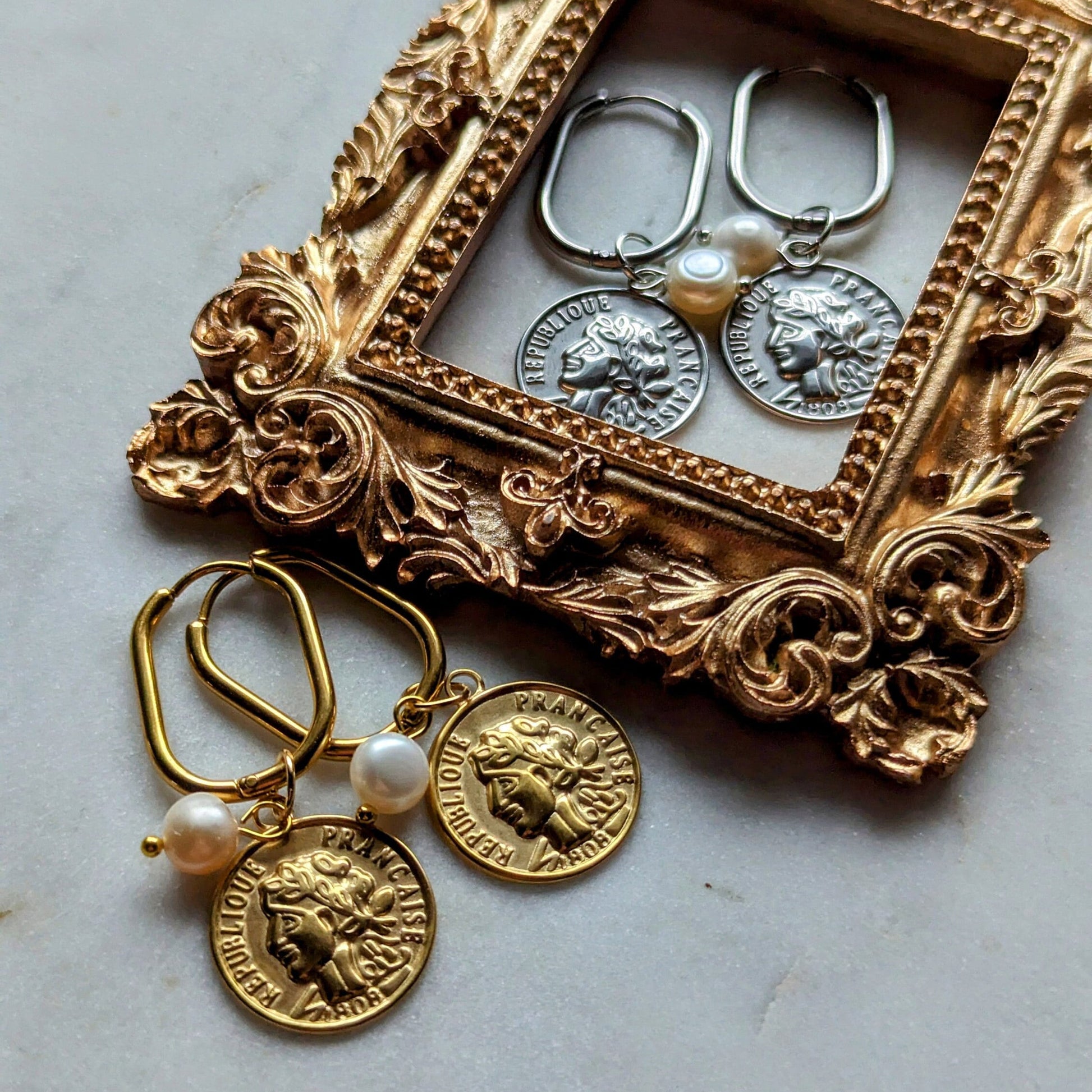 Creole Santorini – Ovale Edelstahl Creolen mit Münzanhänger und Süßwasserperle