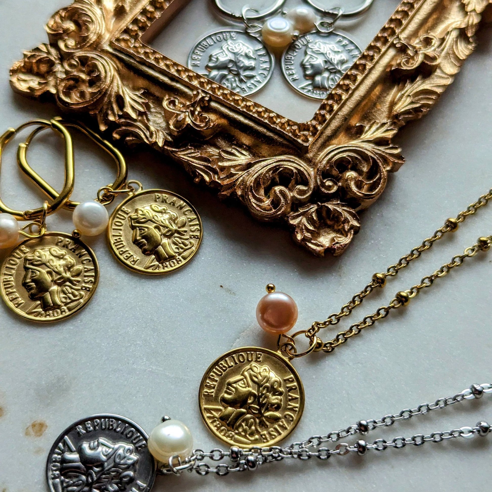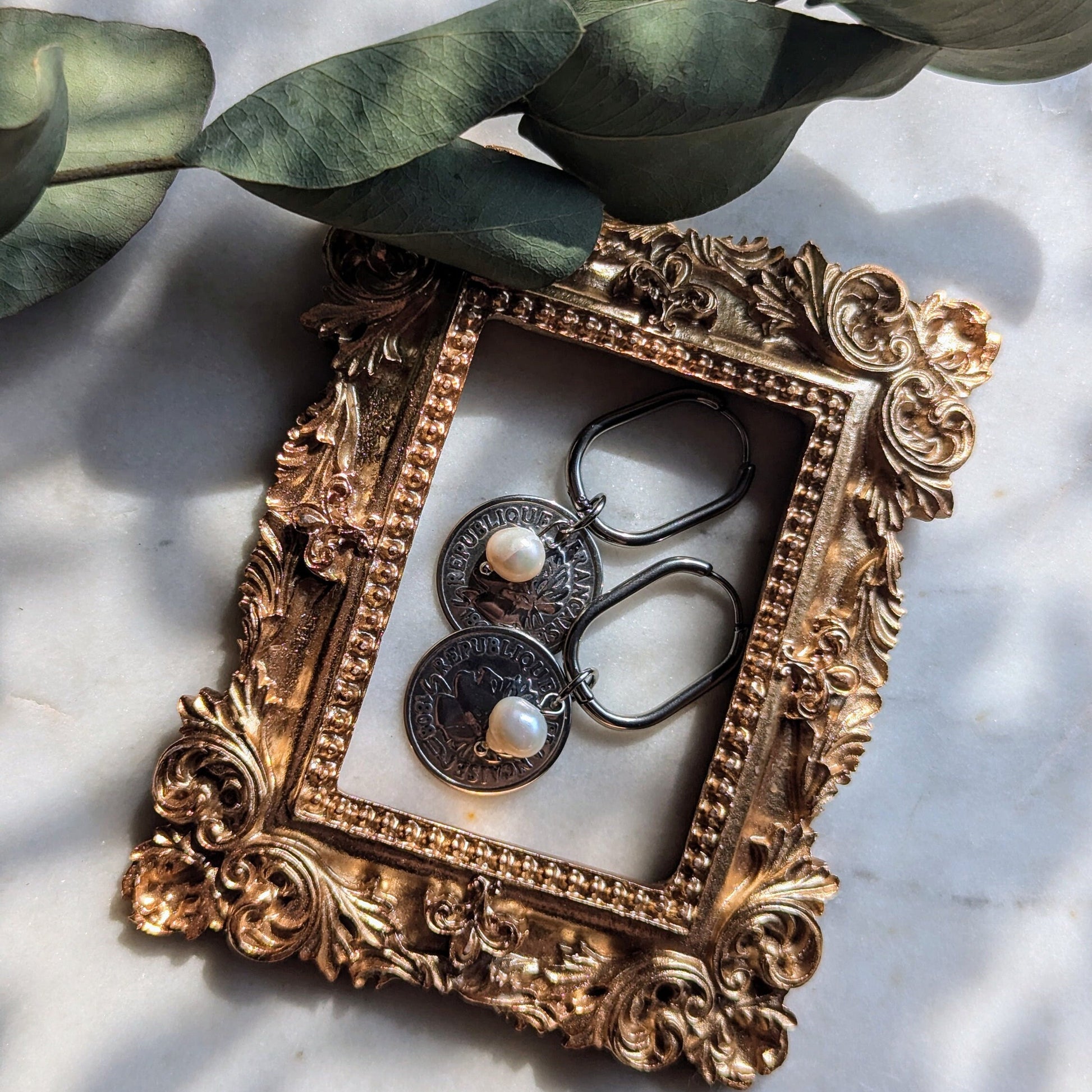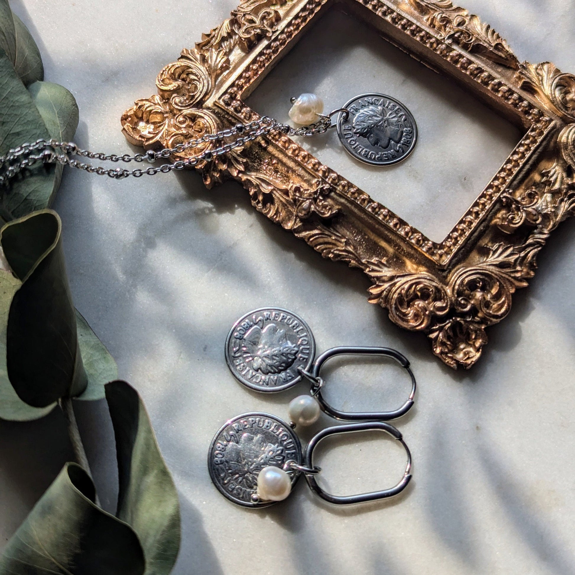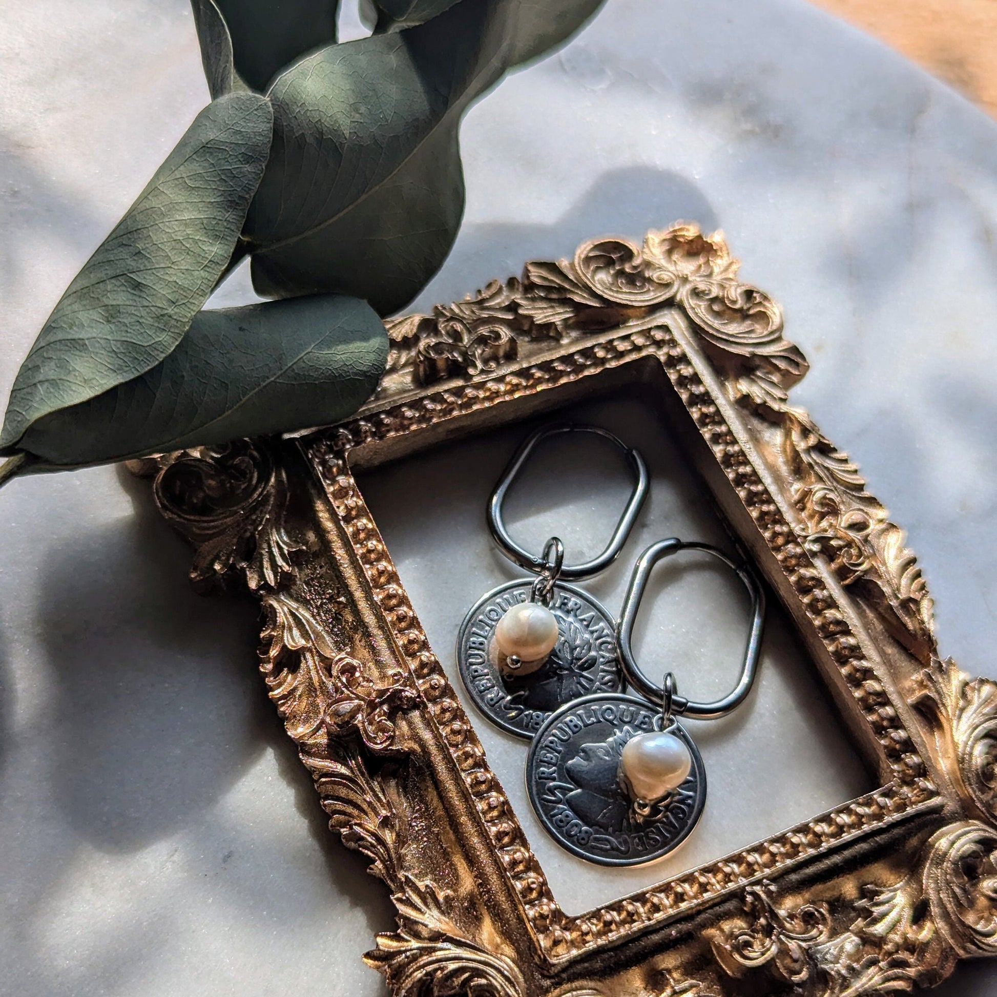 Creole Santorini – Ovale Edelstahl Creolen mit Münzanhänger und Süßwasserperle