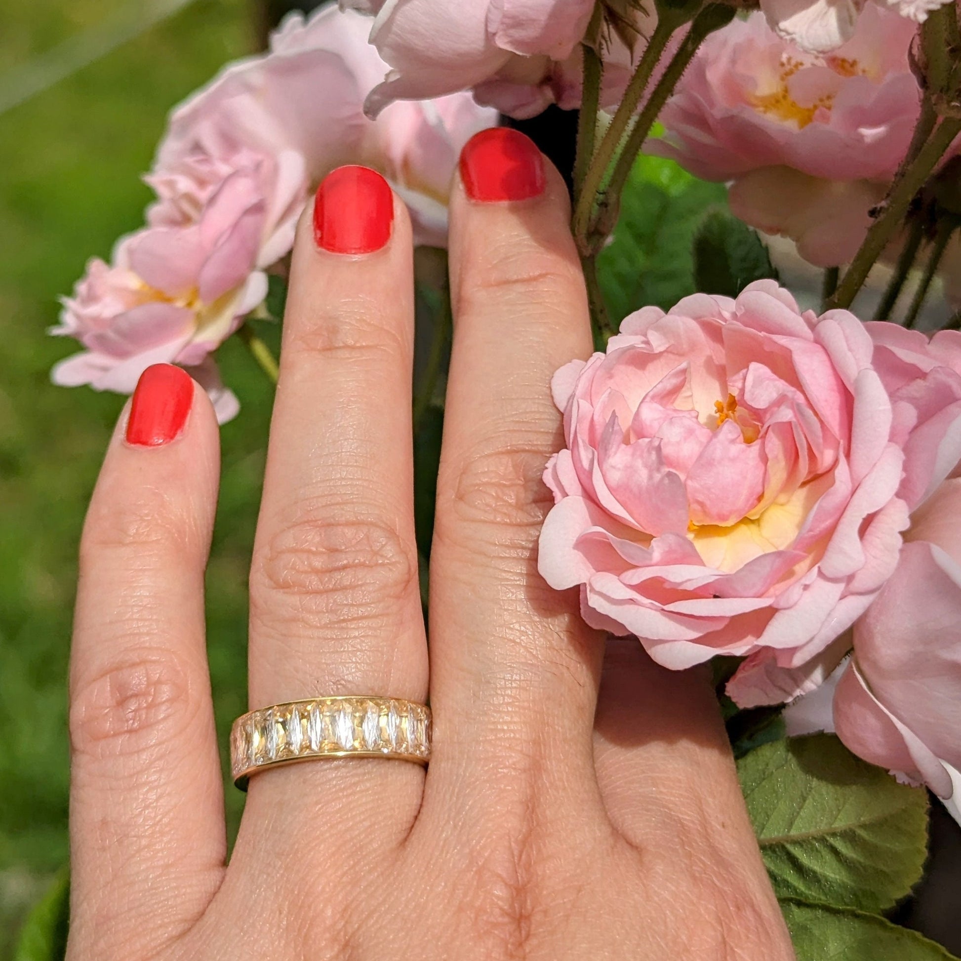 Zirkonia sind hochwertige, synthetisch hergestellte Diamanten. Sie faszinieren durch ihre Brillanz und Langlebigkeit, die natürlichen Steinen in nichts nachsteht, dabei aber unethische Abbaubedingungen vermeidet. Für einen besonders angenehmen Tragekomfort ist die Innenseite des Rings leicht gewölbt. Der Ring hat eine Stärke von circa 2 mm.