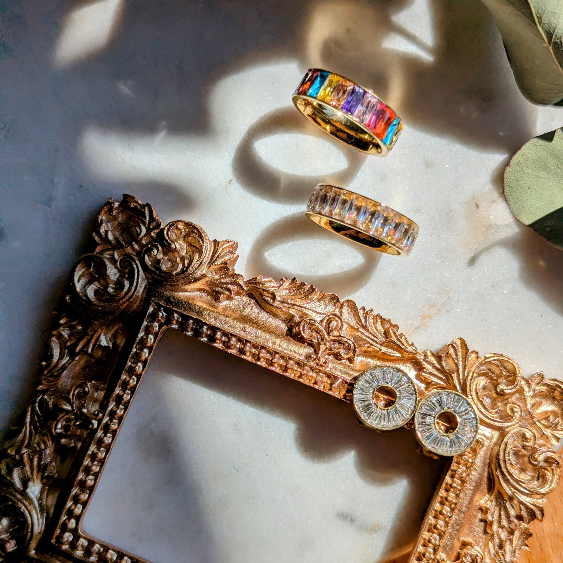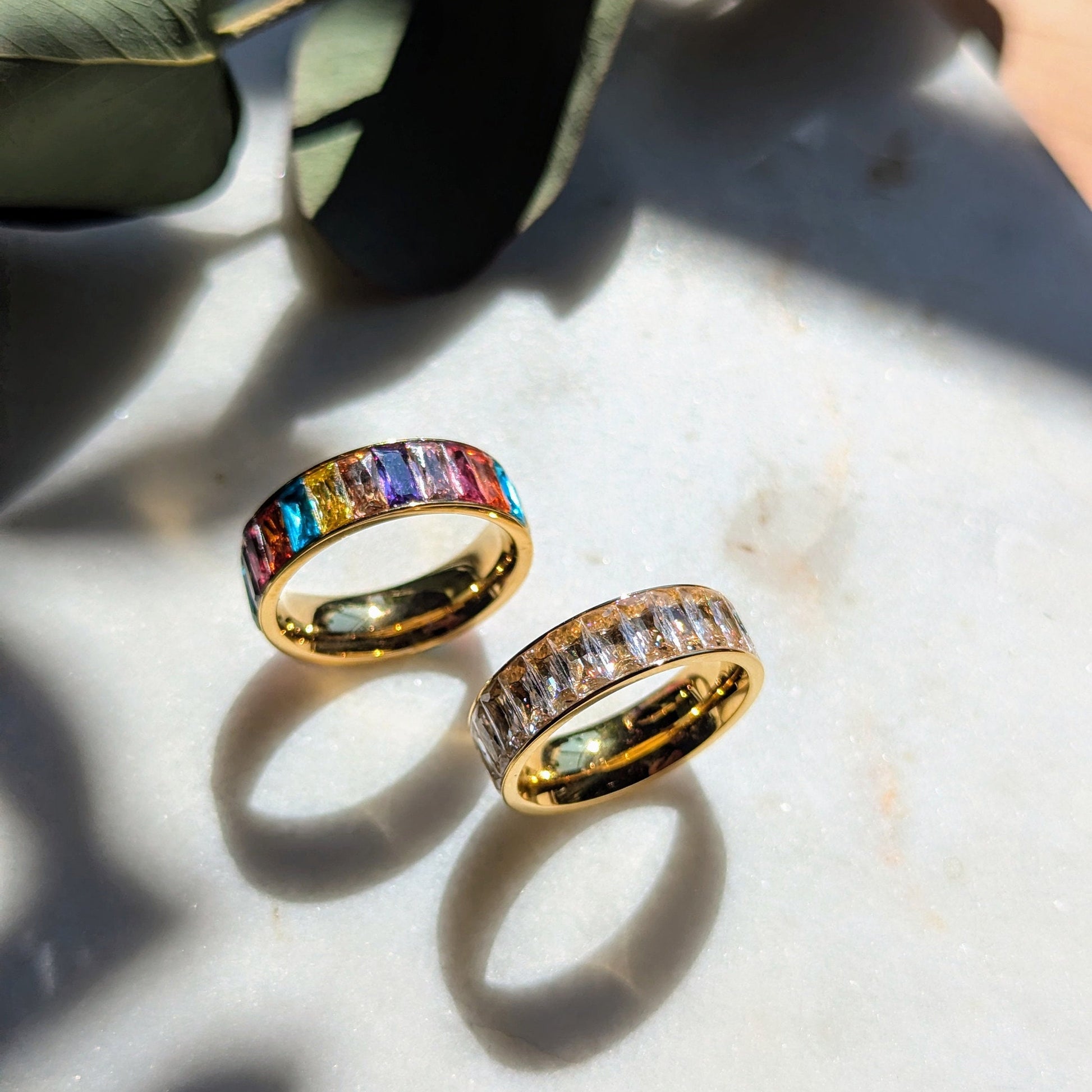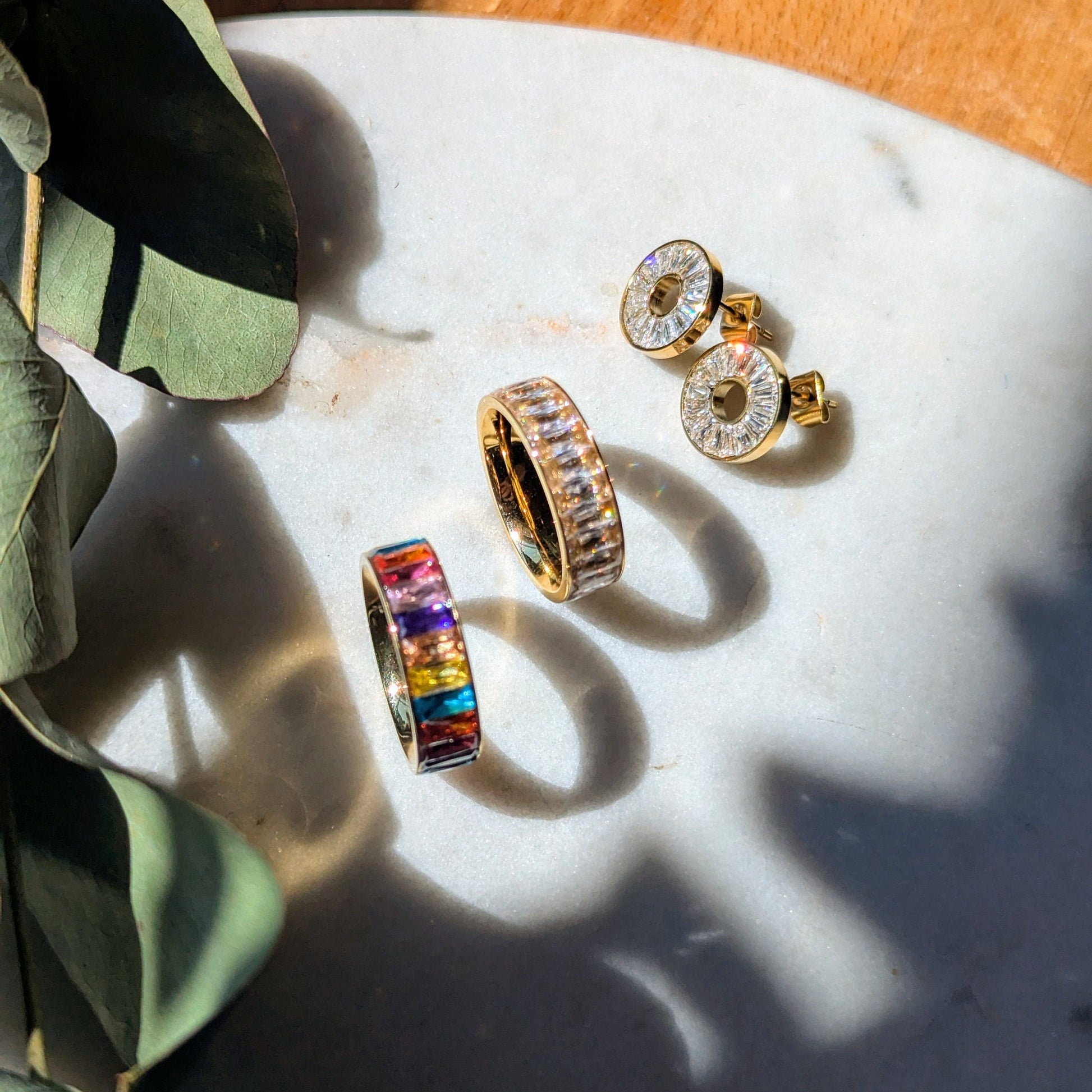 Der Ring "Halo Sparkle" ist die ideale Ergänzung zu deinen gleichnamigen Ohrsteckern und bringt deinen Stil zum Strahlen. Dieser moderne Ring aus hochwertigem Edelstahl besticht durch seine funkelnden Zirkonia, die entweder in den leuchtenden Farben des Regenbogens oder als klassisch klare Steine erhältlich sind.