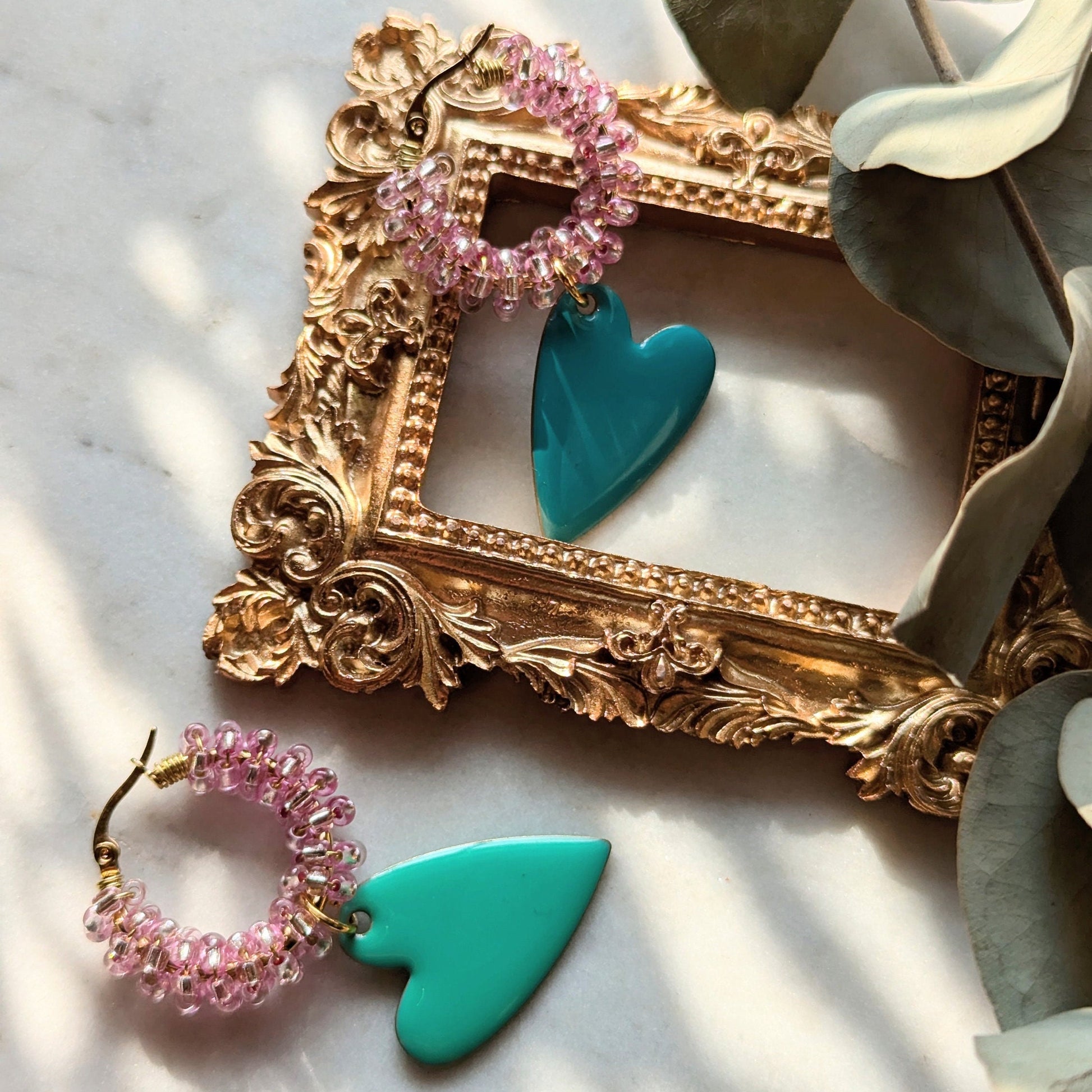 Color Wraps Creolen "Coracão" – Edelstahl mit Rosa Rocailles & Herz Anhänger