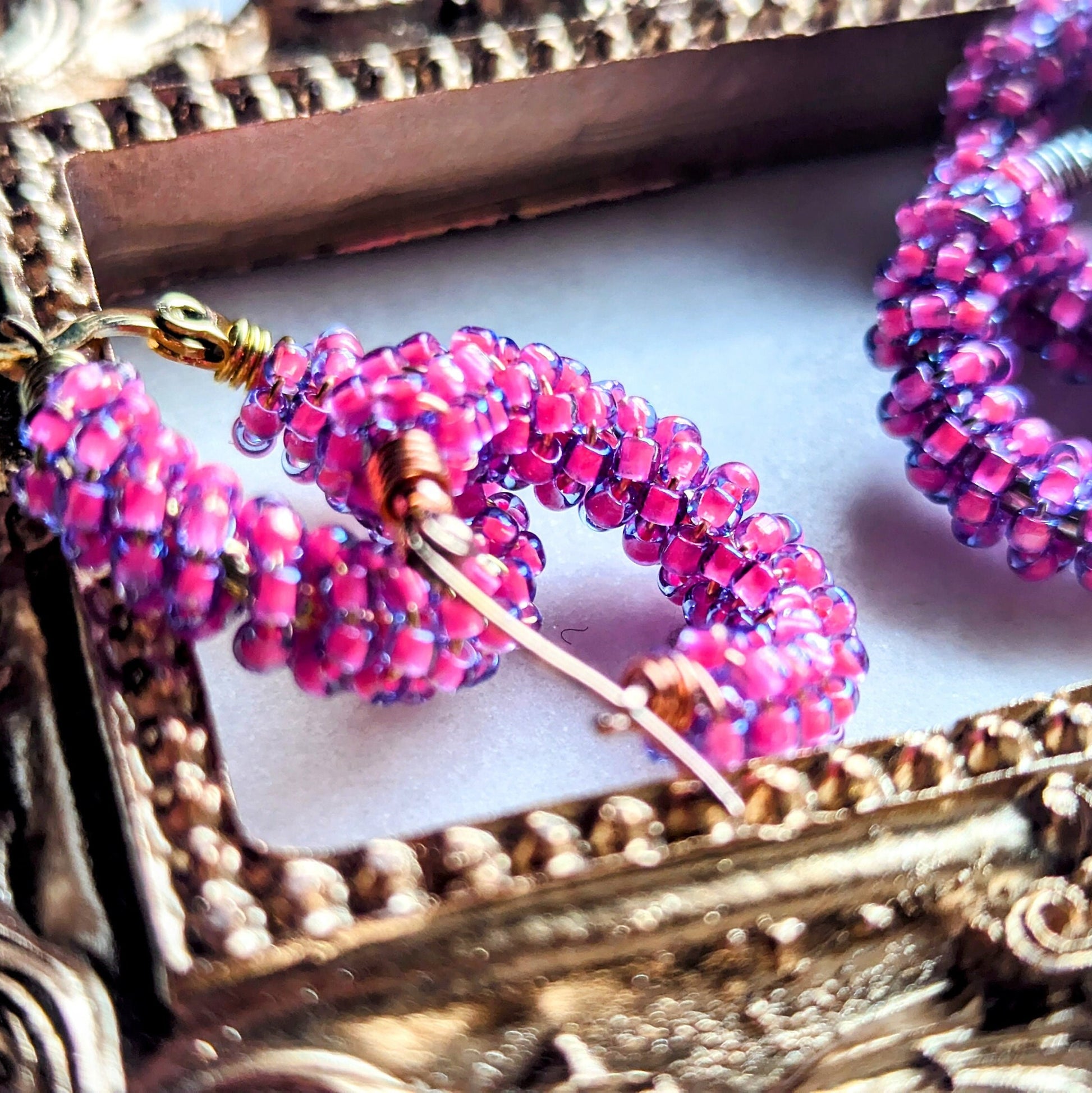 Color Wraps „Coral Reef“ – Roségoldfarbene Edelstahl-Creolen mit blau-pinken Rocailles