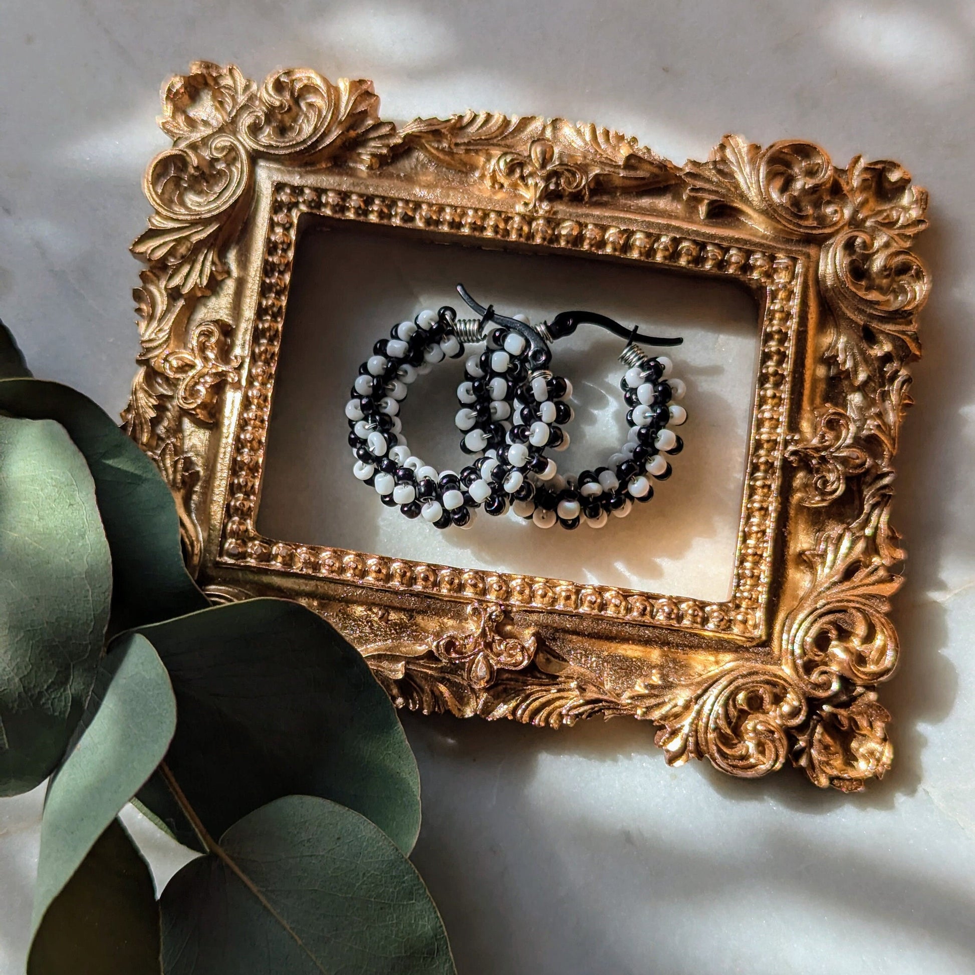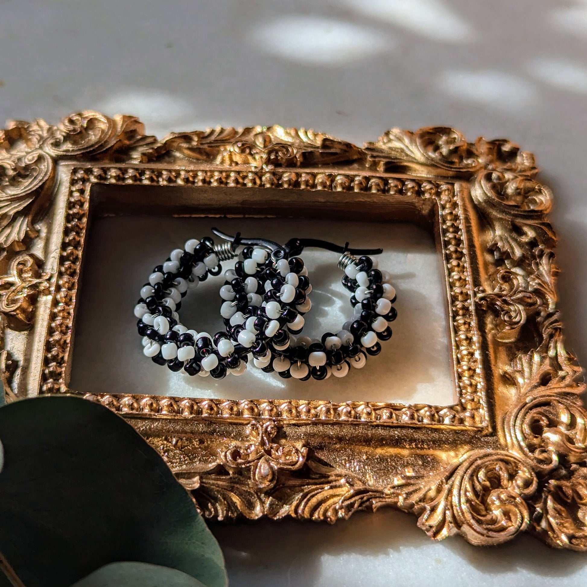 Die Color Wraps „Monochrome Chess“ setzen ein stilvolles Statement mit ihrem markanten schwarz-weißen Schachbrettmuster – handgewickelte Rocailles-Glasperlen auf schwarzen Edelstahl-Creolen schaffen ein klassisch modernes Design, das sowohl zeitlos als auch außergewöhnlich wirkt.