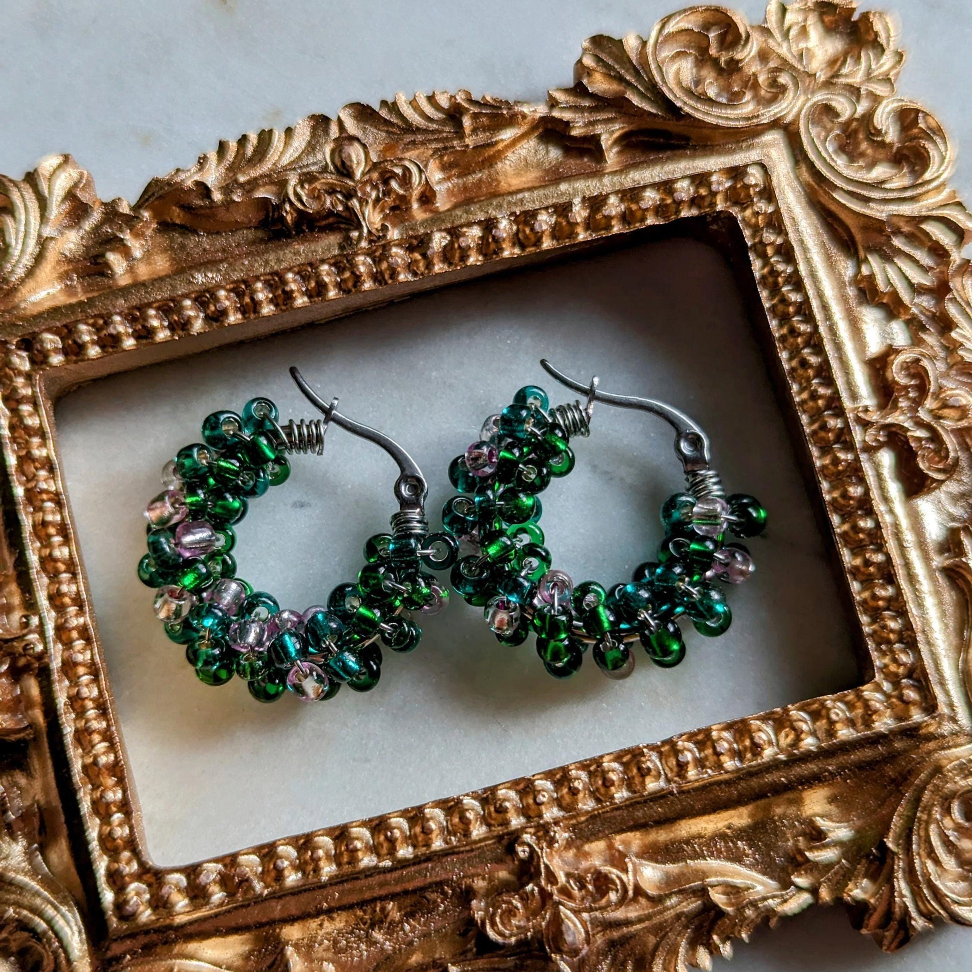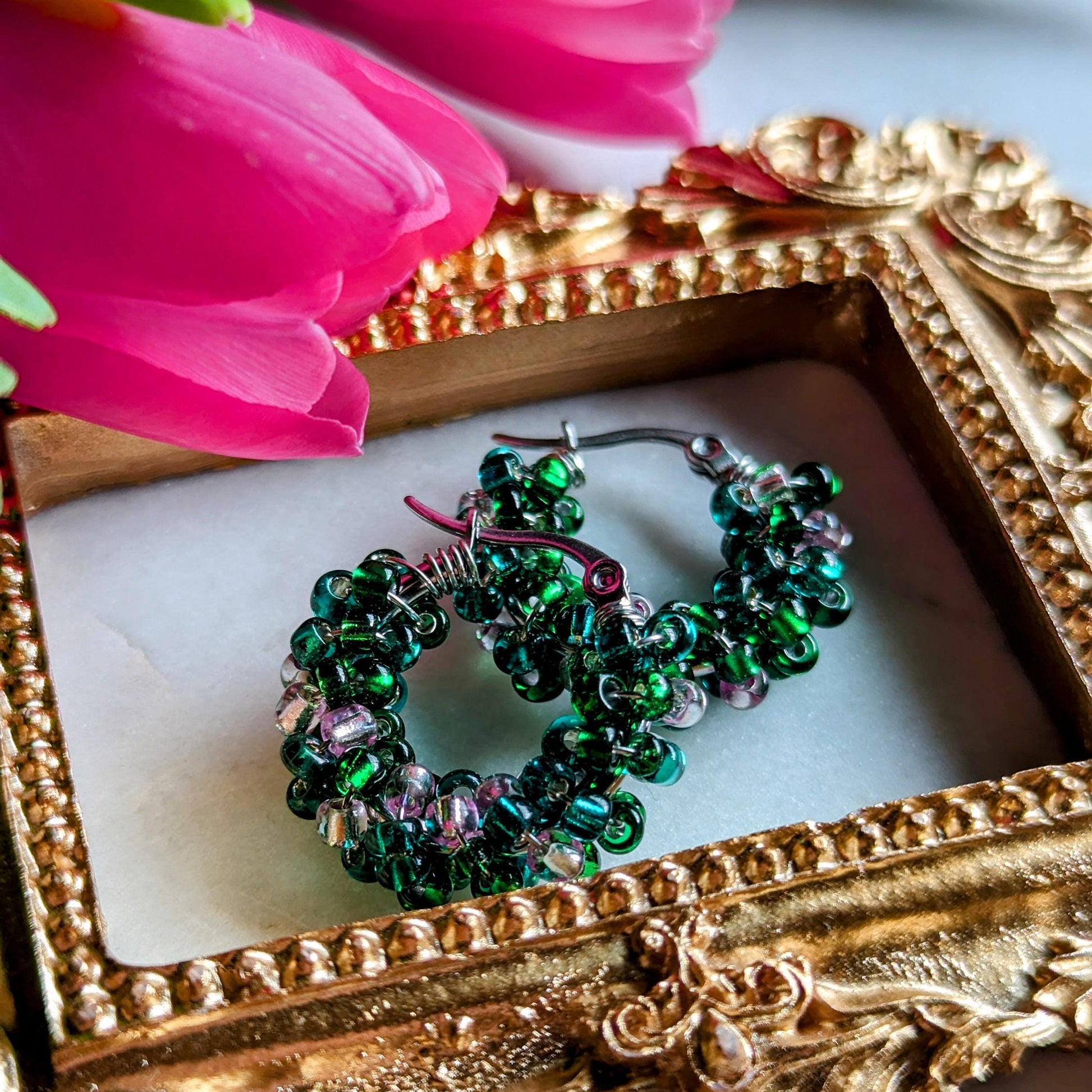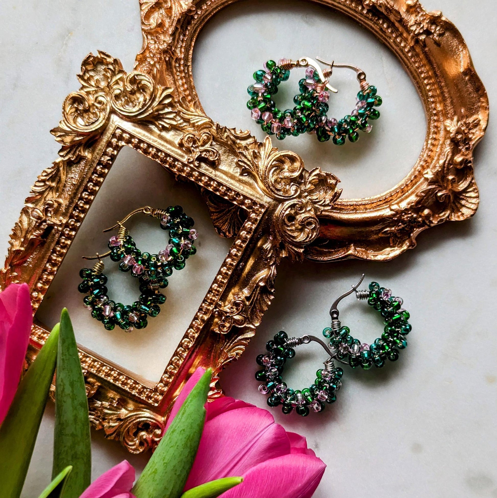 Color Wraps „Tulip“ – Edelstahl-Creolen mit grünen und rosa Rocailles-Perlen