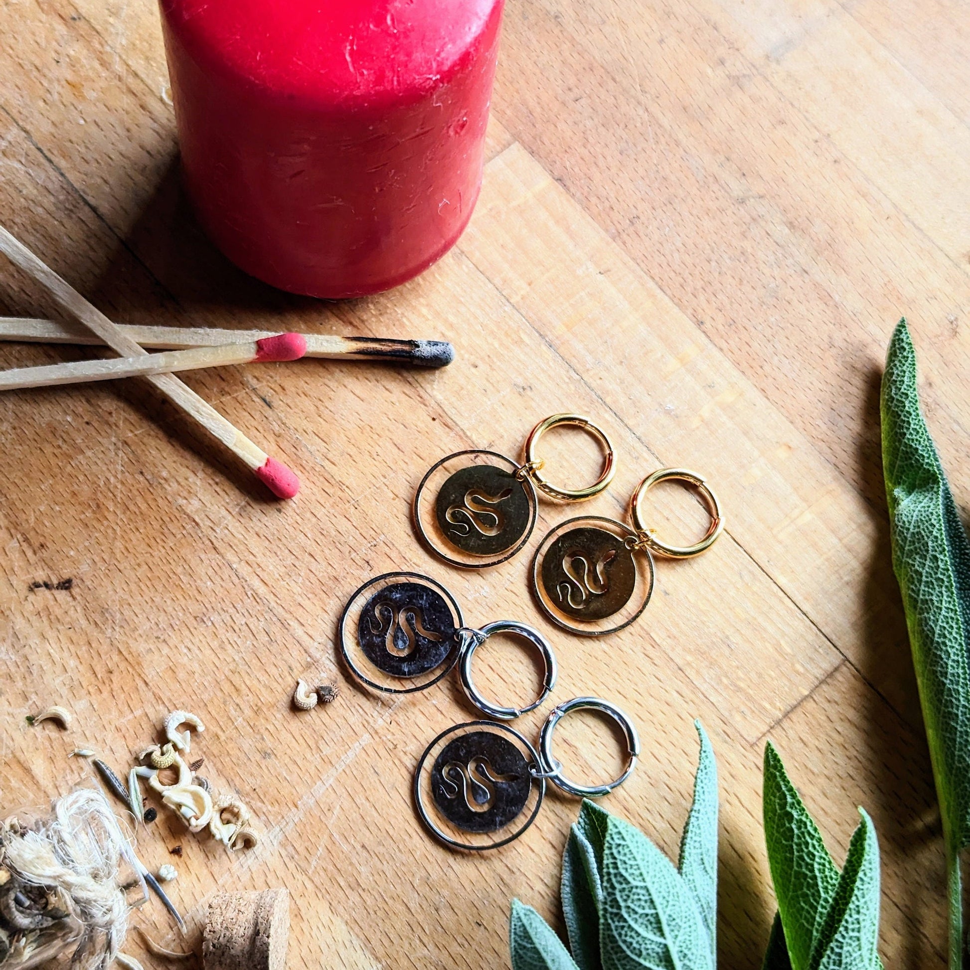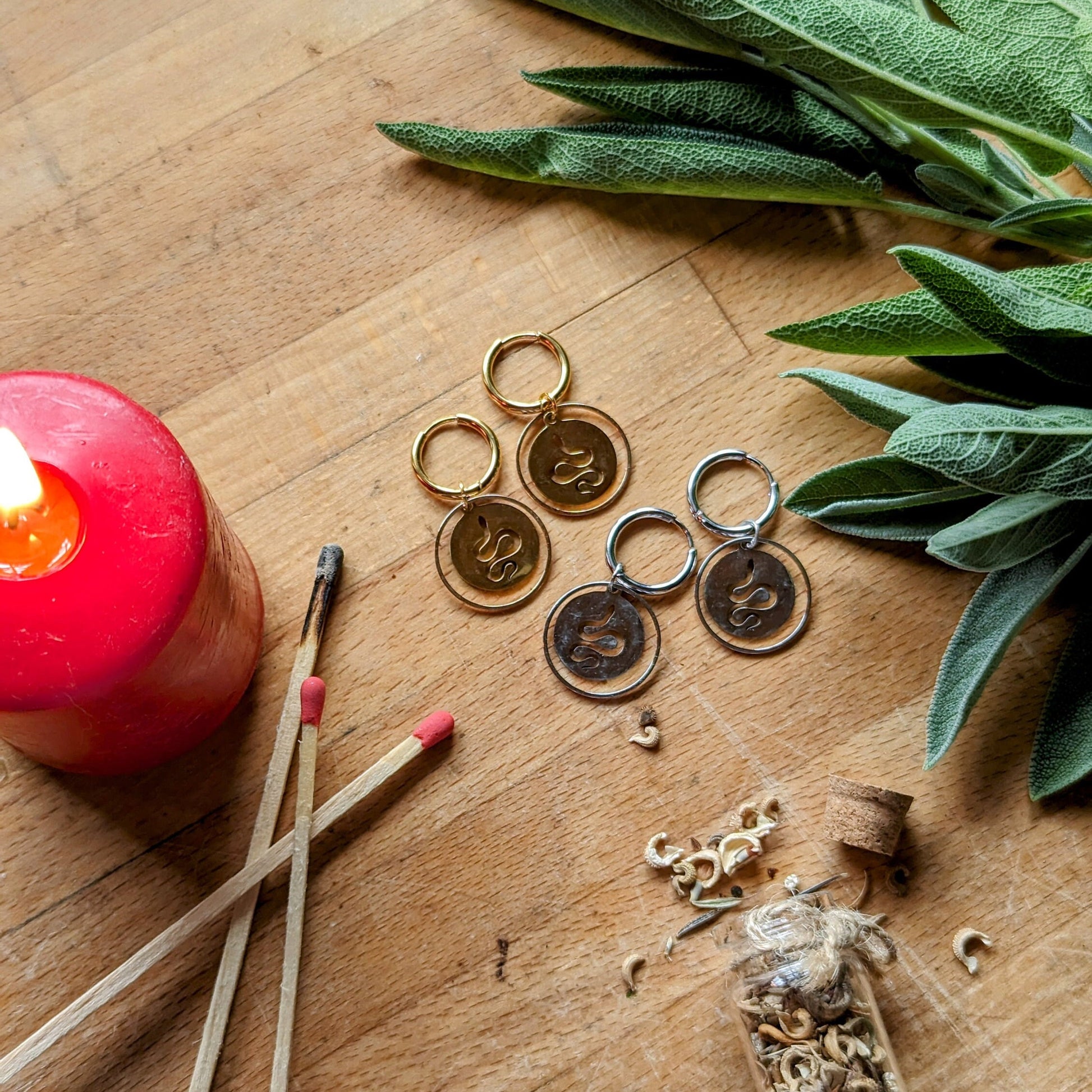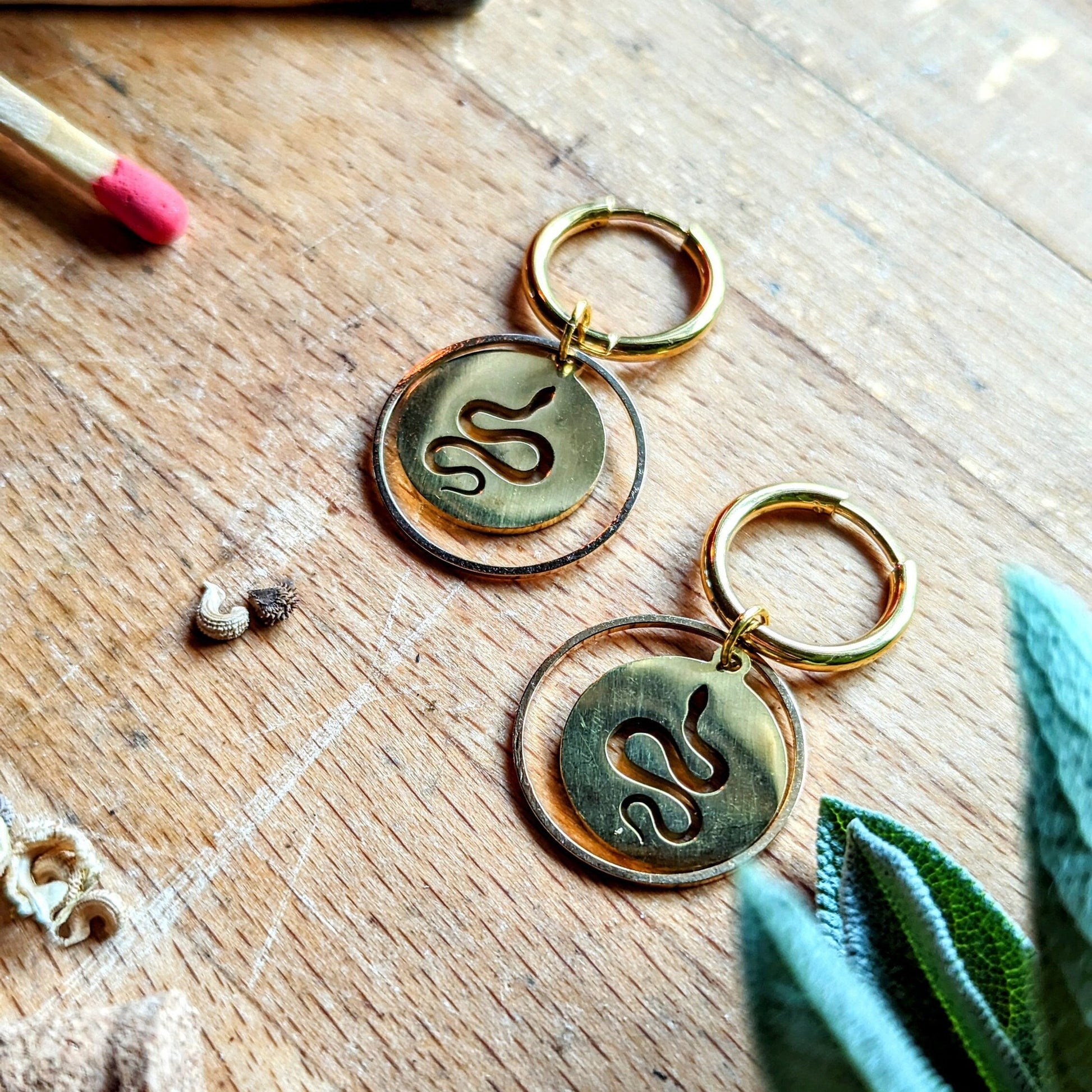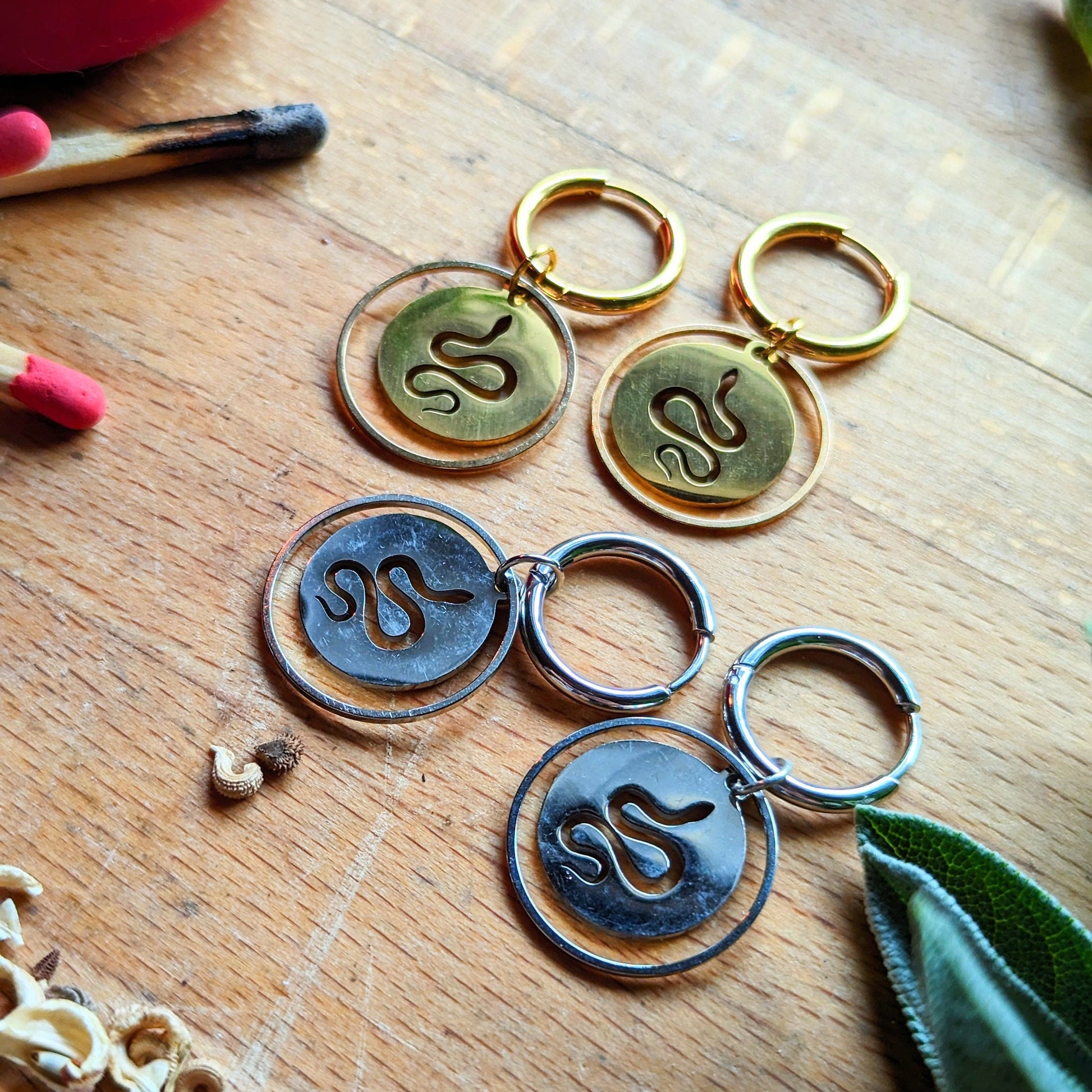 Diese besonderen Ohrringe präsentieren sich mit einem raffinierten Anhänger aus hochwertigem Edelstahl, der ein filigranes Schlangen-Cut-Out-Motiv zeigt, umrahmt von einem edlen Messingring.