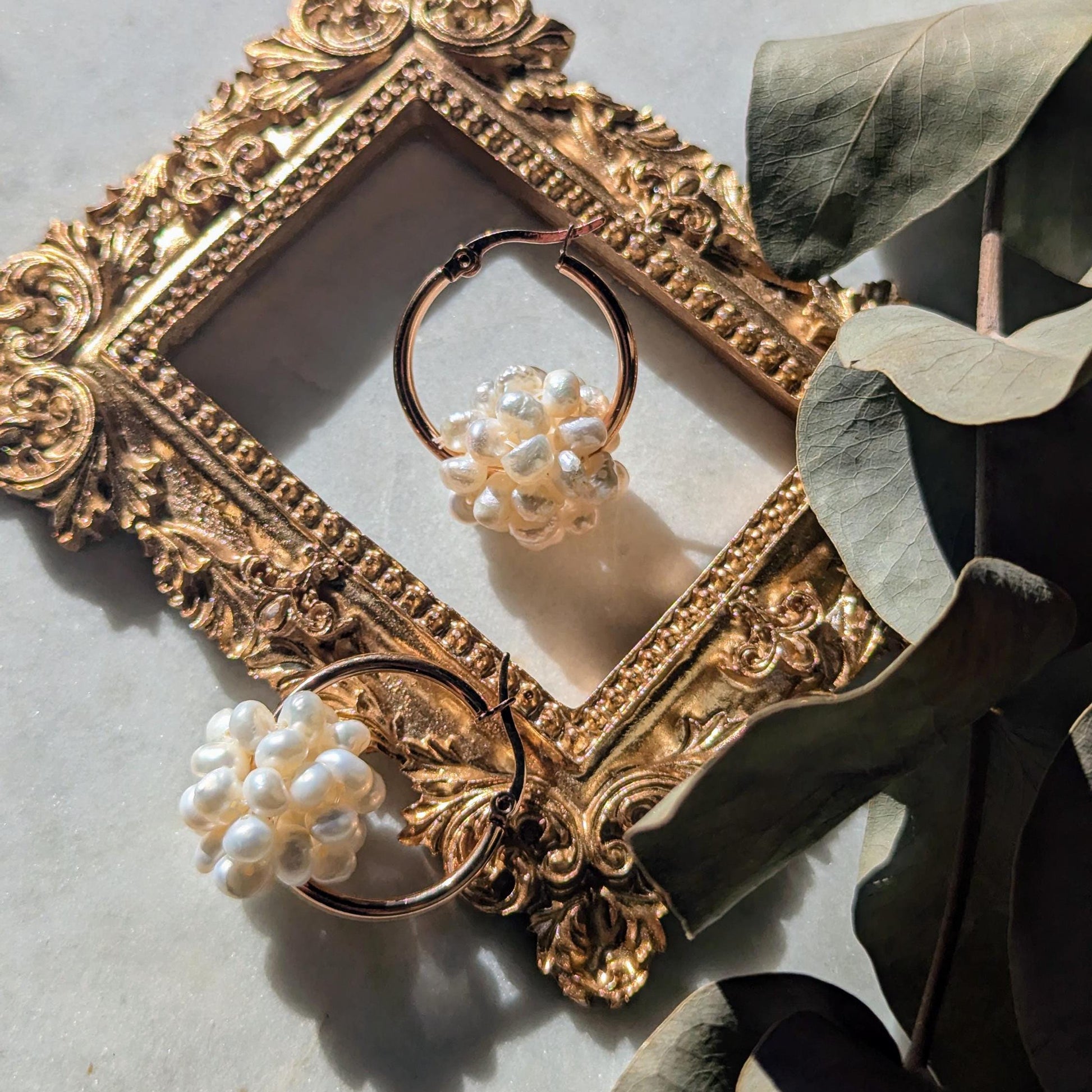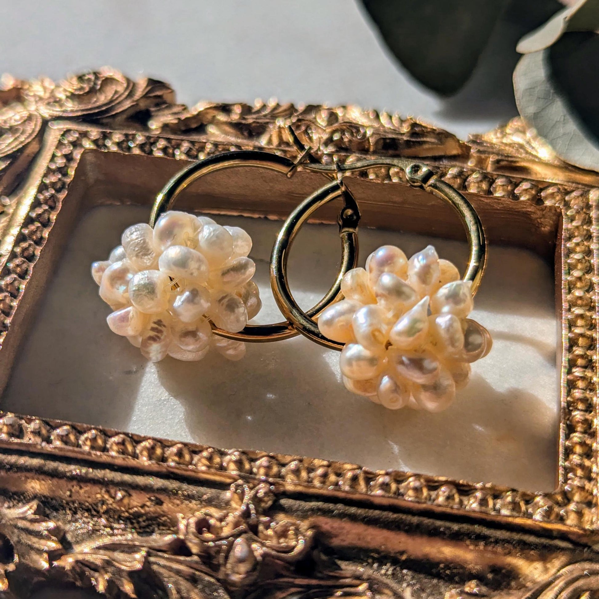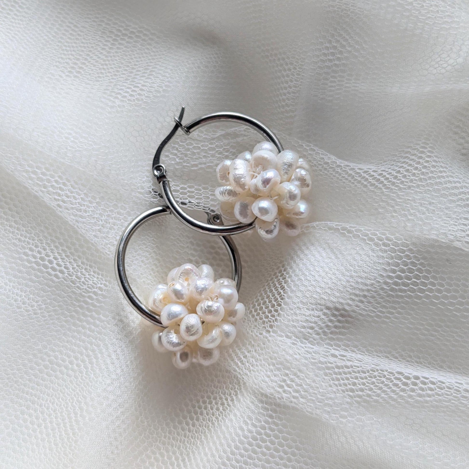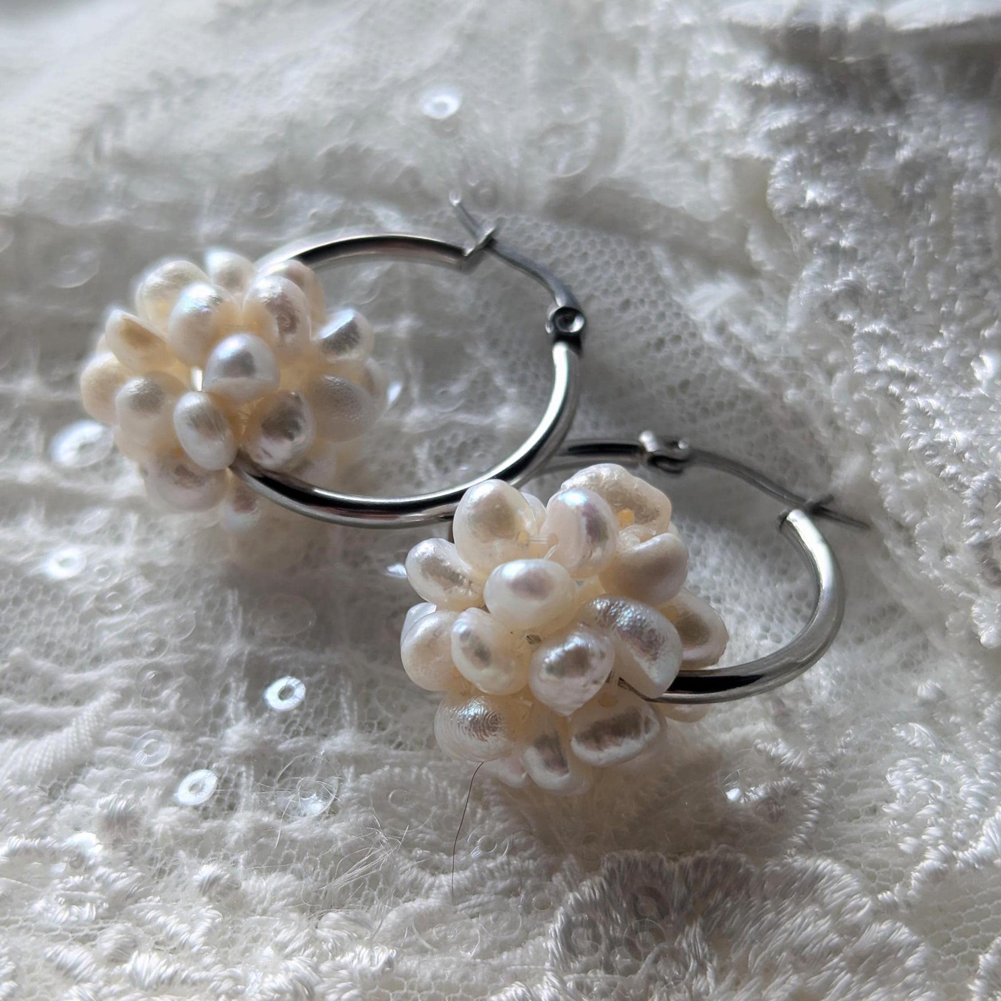 Schneeball Creolen - Edelstahl Creolen mit Ball aus Süßwasserperlen