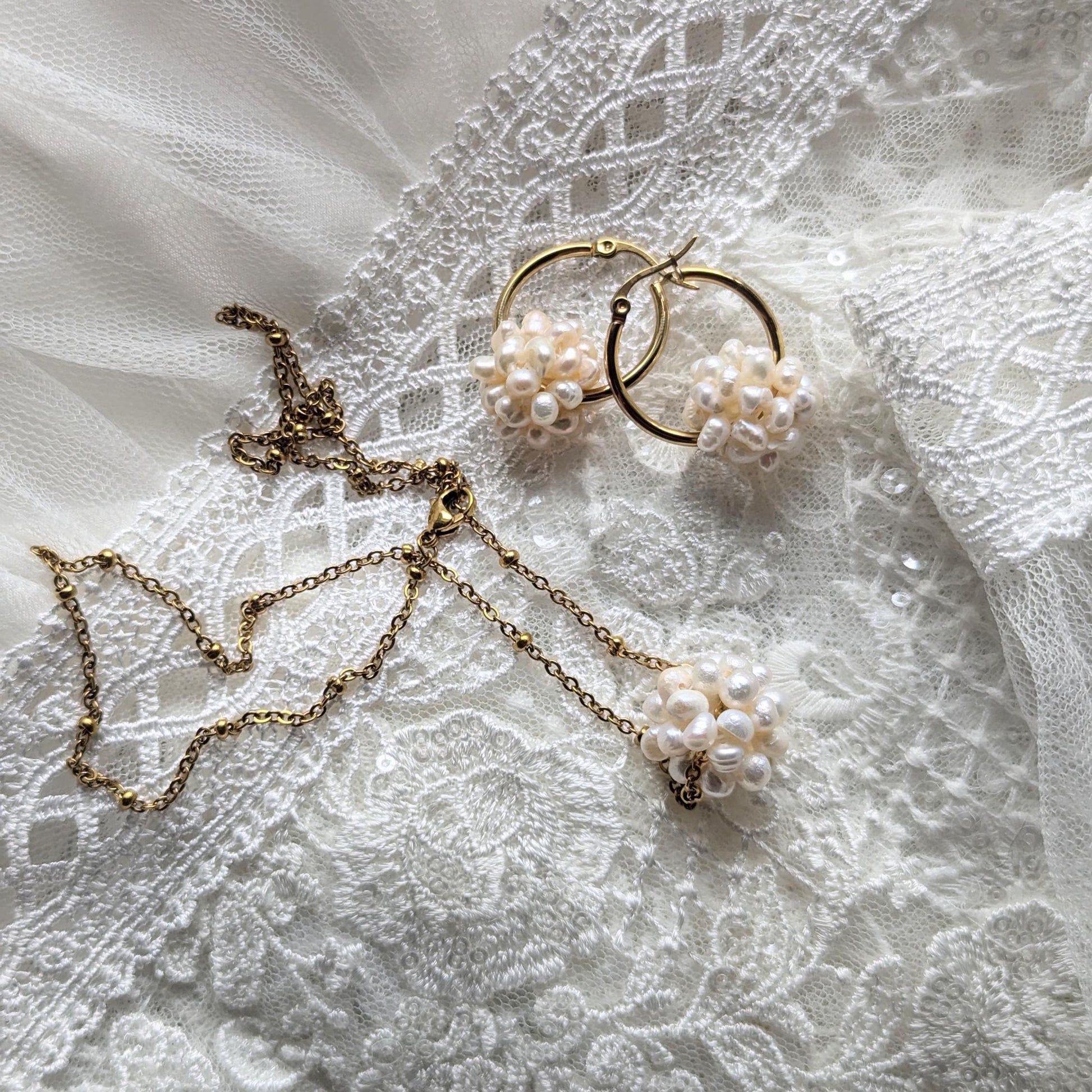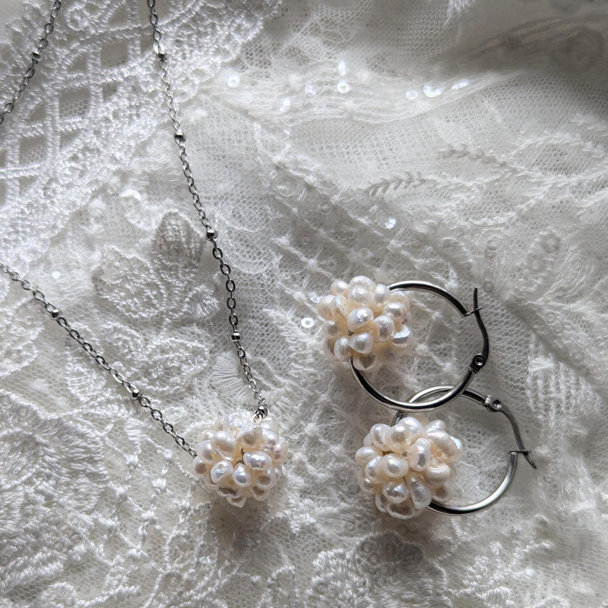 Winterliches Design und trotzdem Schmuck für das ganze Jahr - zarte Schneebälle aus kleinen Süßwasserperlen von Hand zusammengefügt und auf eine Creole gefädelt.