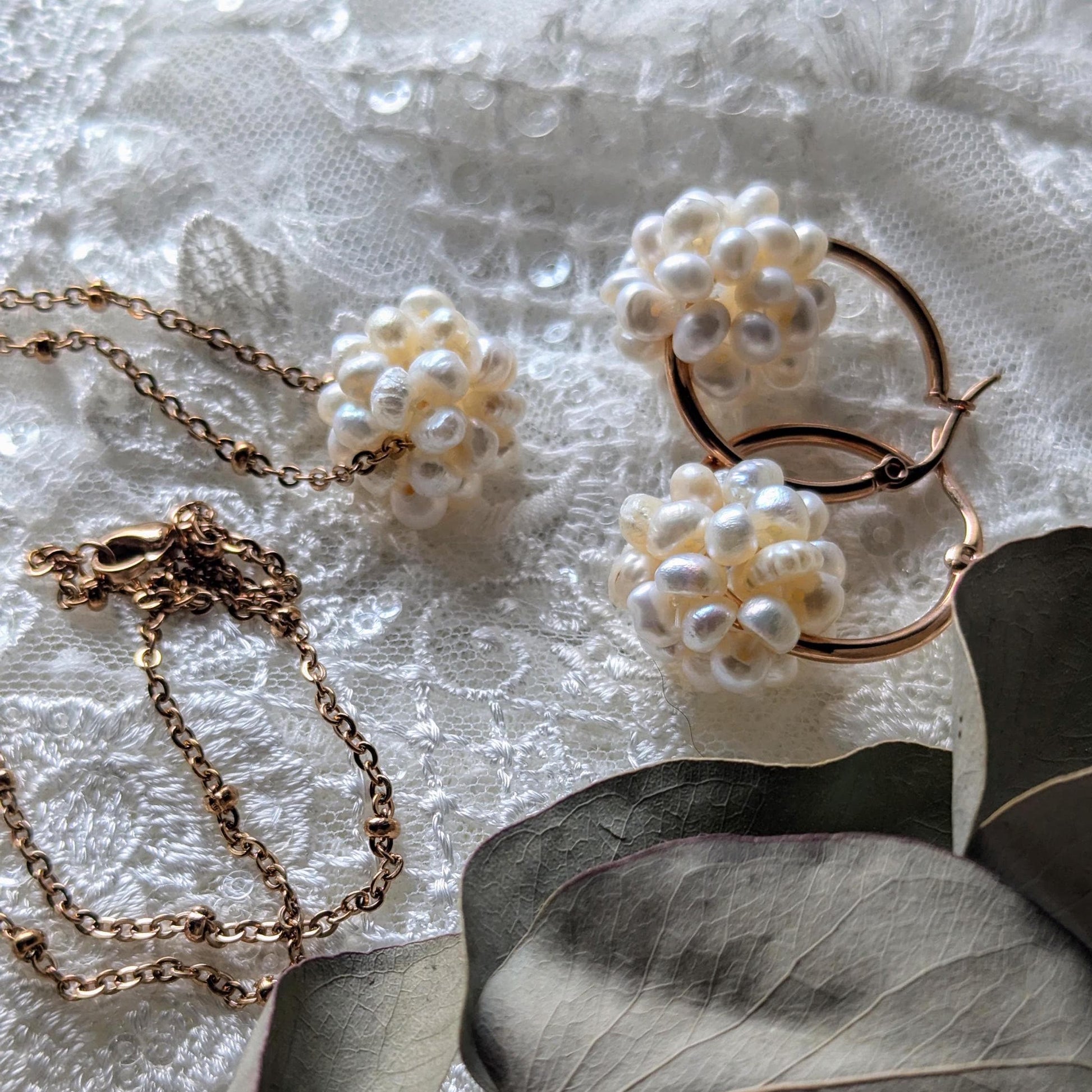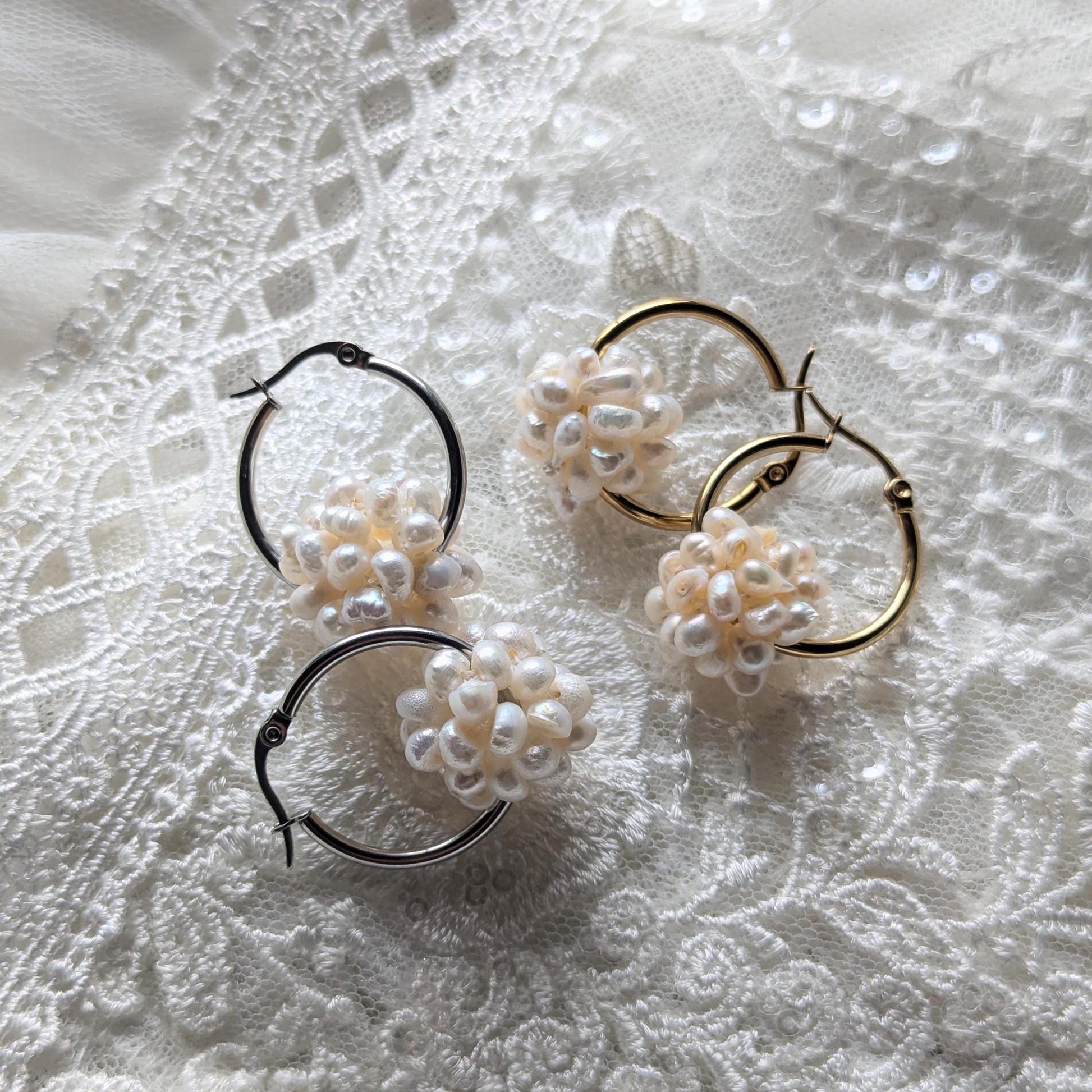 Die Creolen haben einen Außendurchmesser von ca. 2,4cm und bestehen aus hochwertigem Edelstahl. Die Perlenbälle bestehen aus 4-6 mm großen Süßwasserperlen und sind mit einem haltbaren Faden aus Nylon zusammengebunden. Der Außendurchmesser der Perlenbälle ist ca. 1,5 cm.