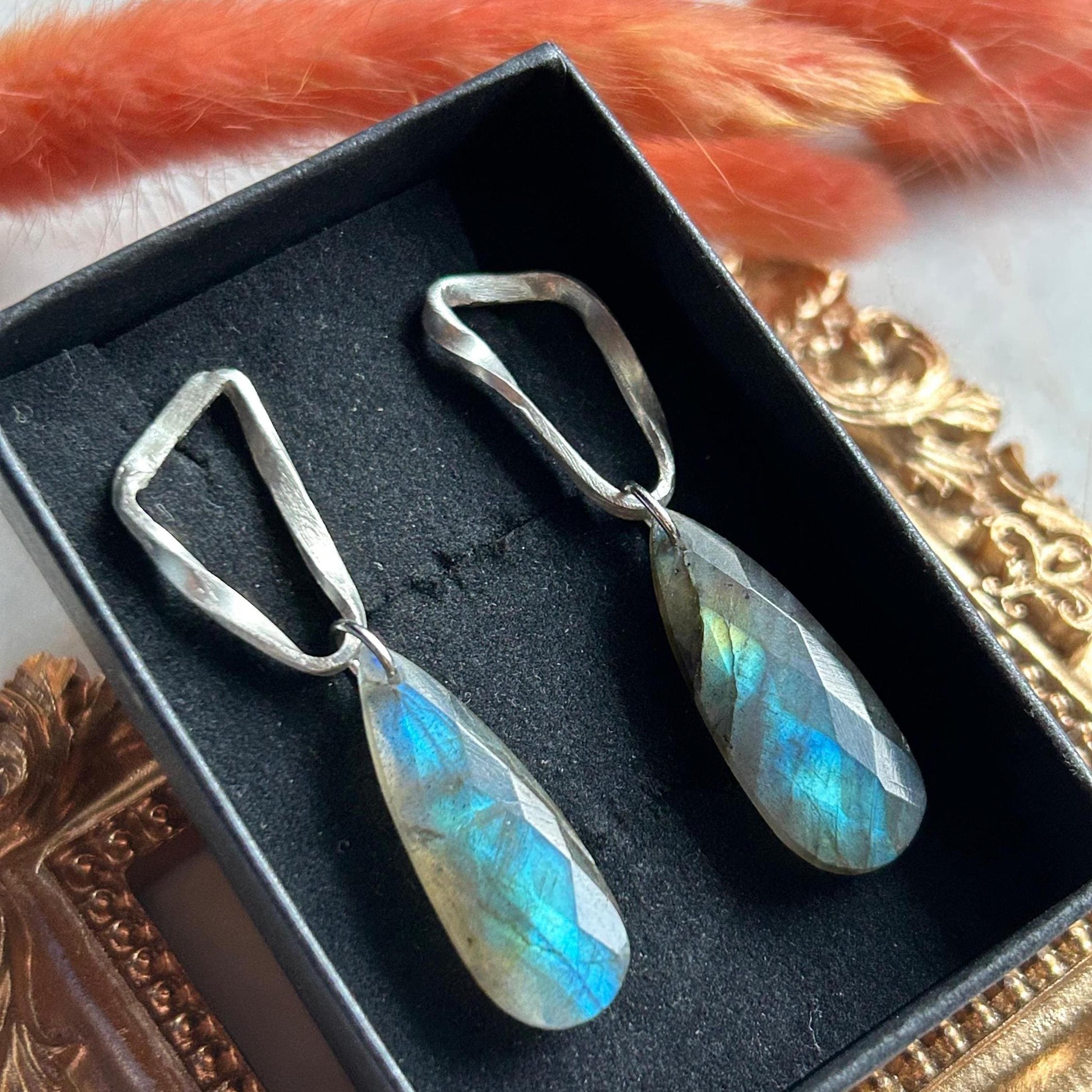 Die Ohrringe haben eine Gesamtlänge von circa 4,8 cm und eine Breite von etwa 1,2 cm. Während Ohrstecker und Dorn aus hochwertigem 925er Silber bestehen, sind der Schmetterlingsverschluss und die Spaltringe zur Befestigung der Labradorite aus robustem Edelstahl gefertigt, um beste Haltbarkeit zu gewährleisten.